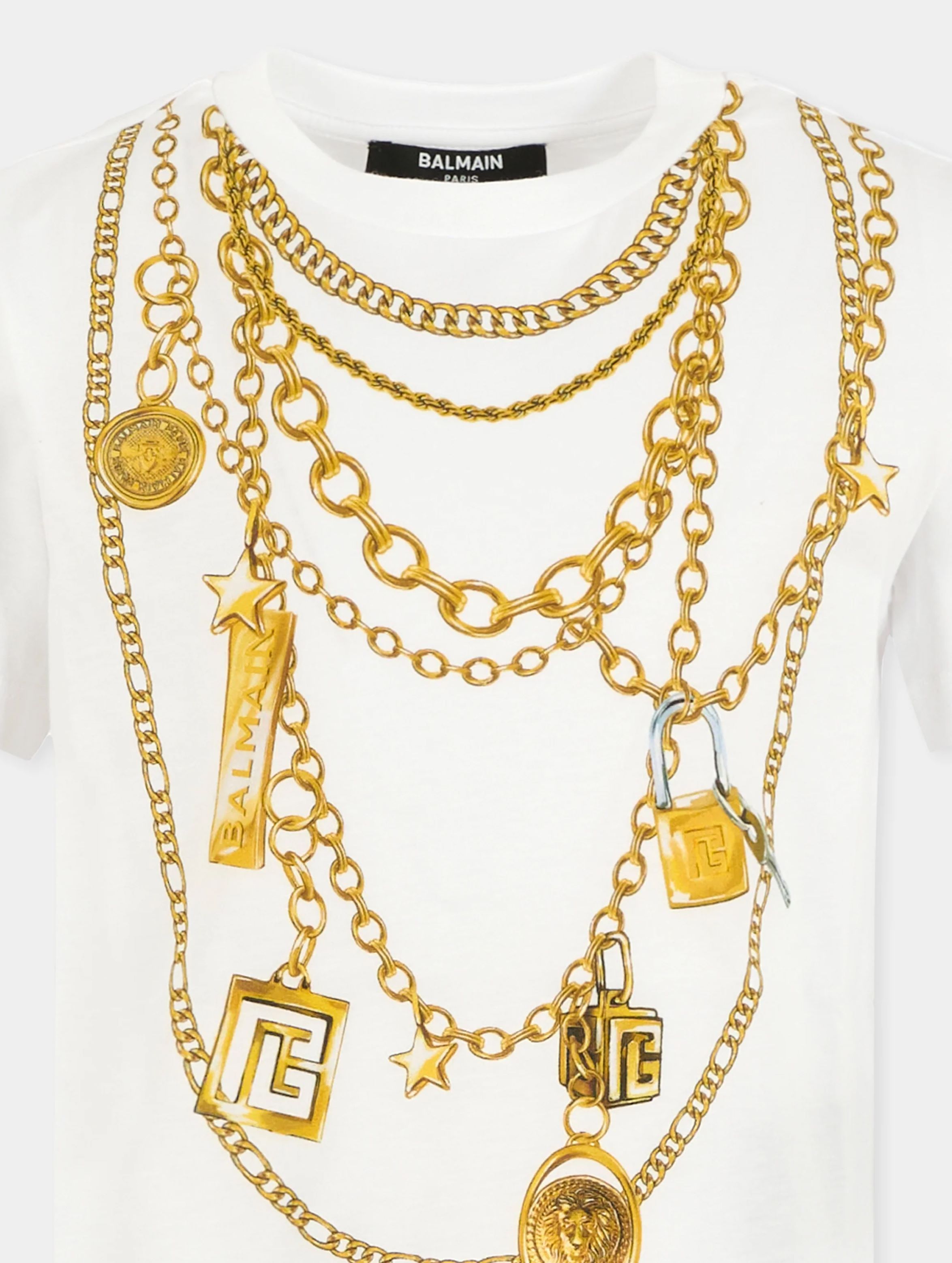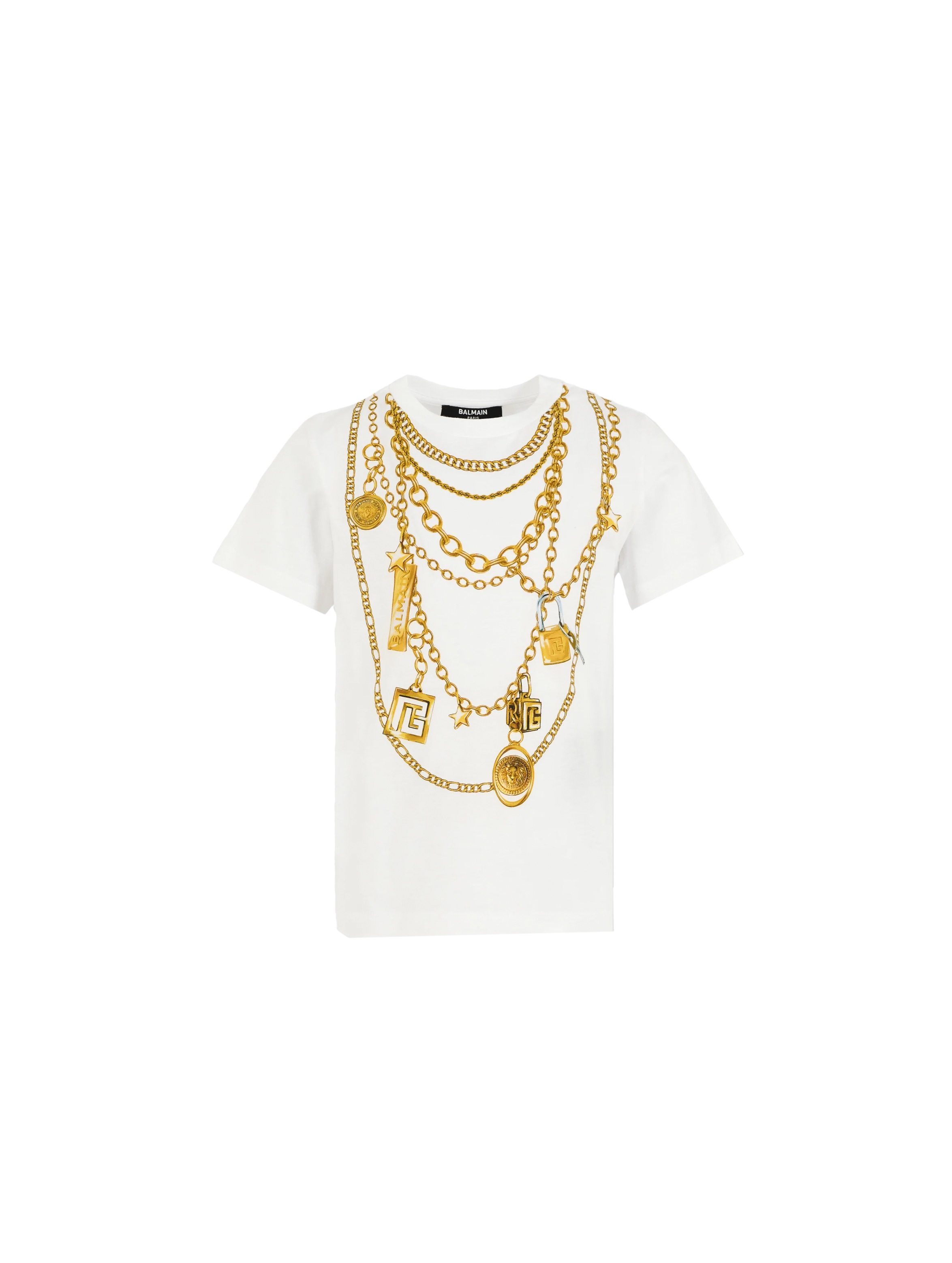 T-shirt in jersey a maniche corte, con scollo rotondo, a tinta unita, con maxi stampa grafica di collane con charm logati sul davanti. Per un look trendy e cool. BALMAIN