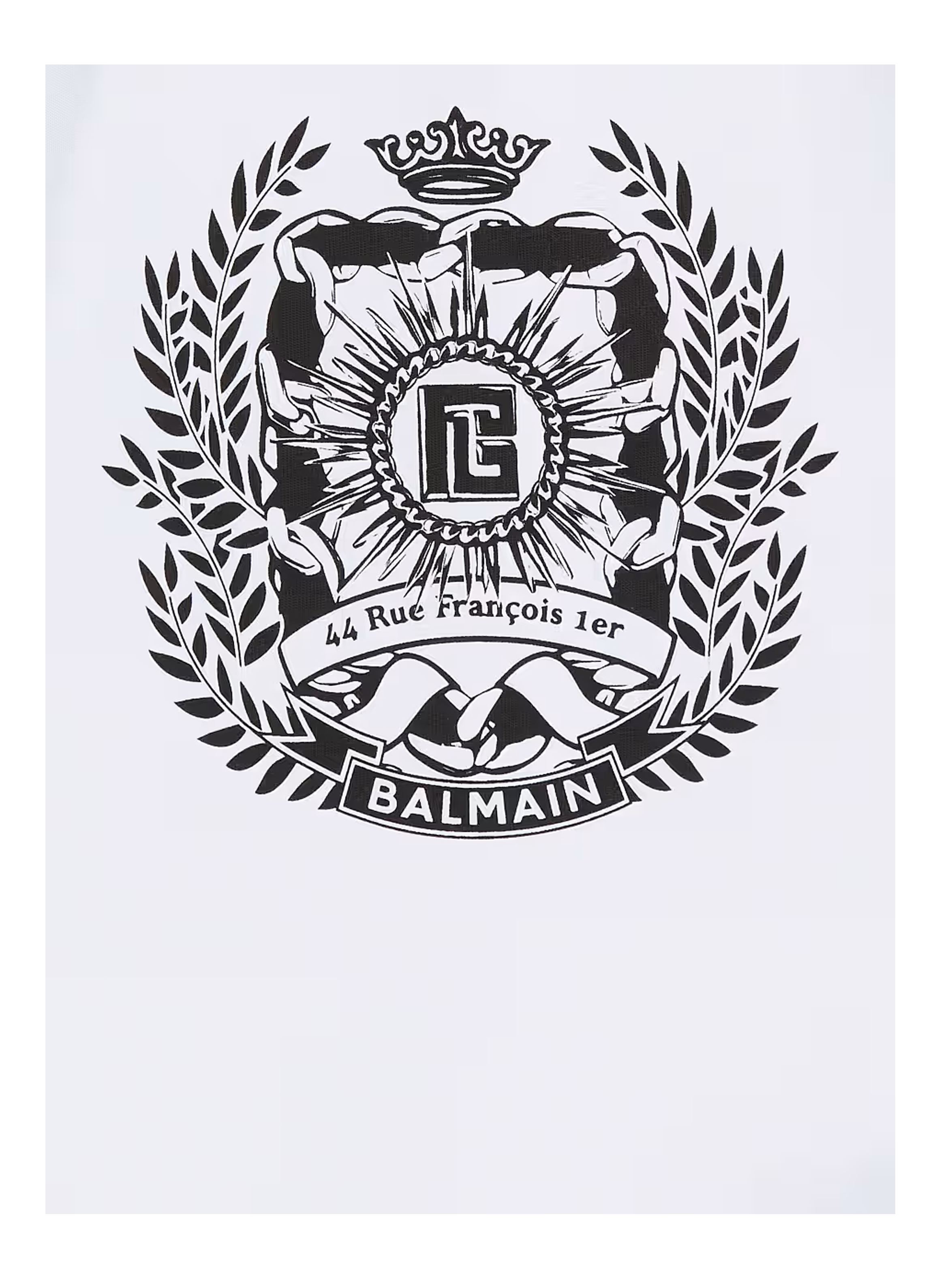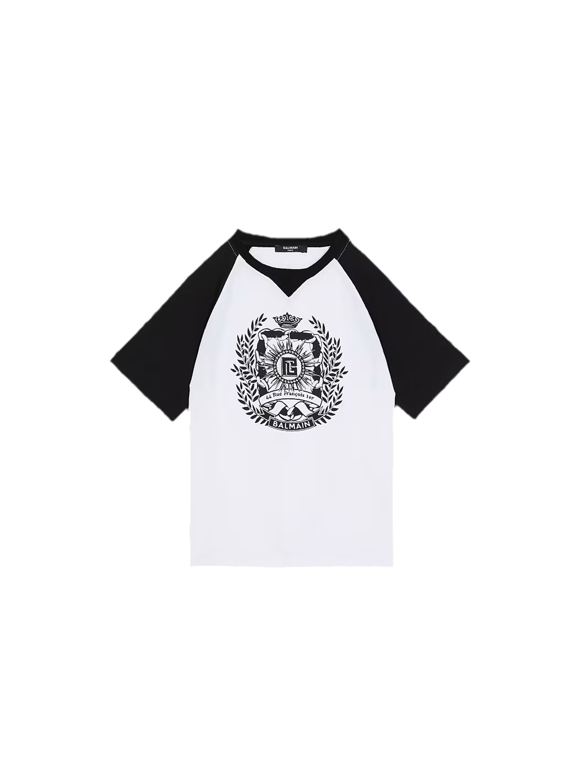 T-shirt a maniche corte, a tinta unita con maniche e bordo superiore in contrasto di colore, scollo rotondo e maxi stampa grafica con logo e stemma sul davanti. Per un look trendy e fashion. BALMAIN
