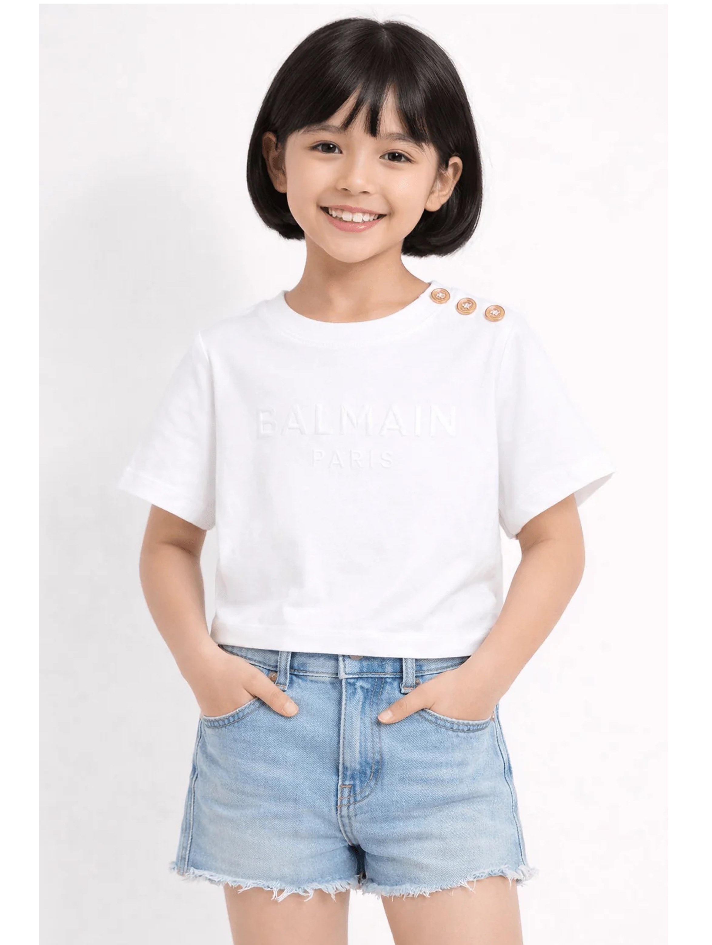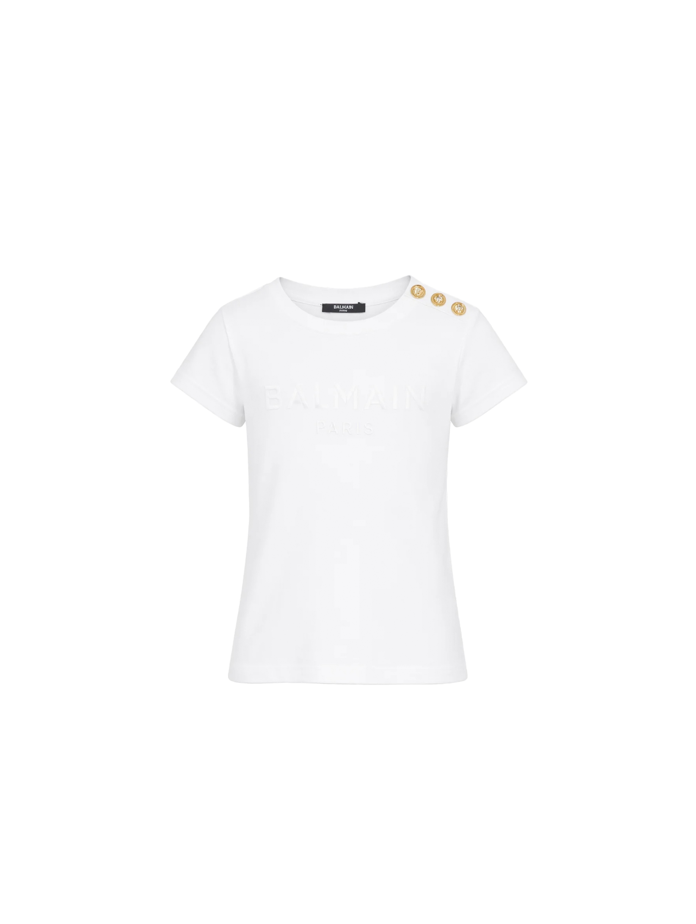 T-shirt a maniche corte, con scollo rotondo, a tinta unita, con bottoncini decorativi sulla spalla e maxi logo lettering ricamato ton sur ton sul fronte. Per un look trendy e fashion. BALMAIN