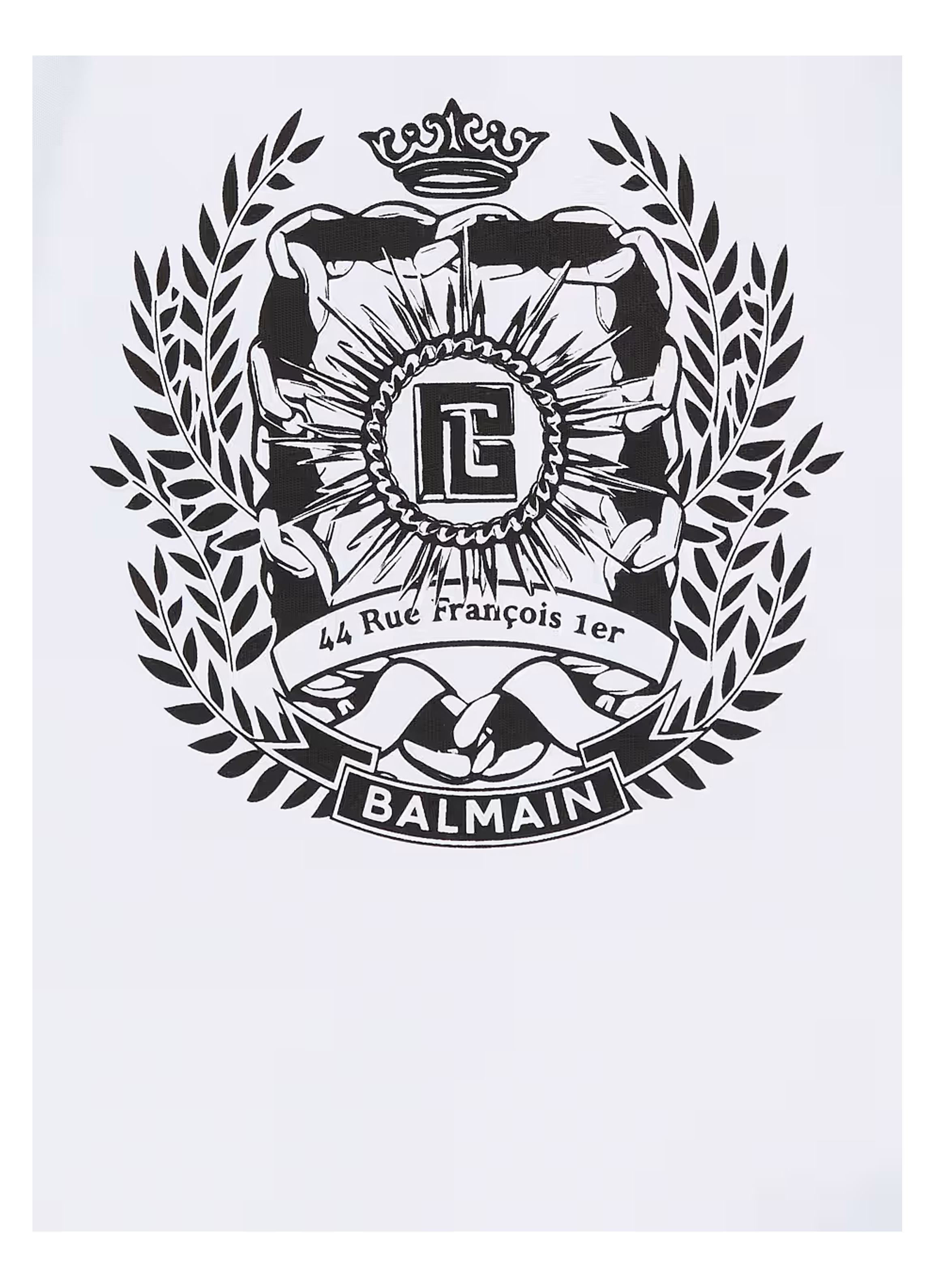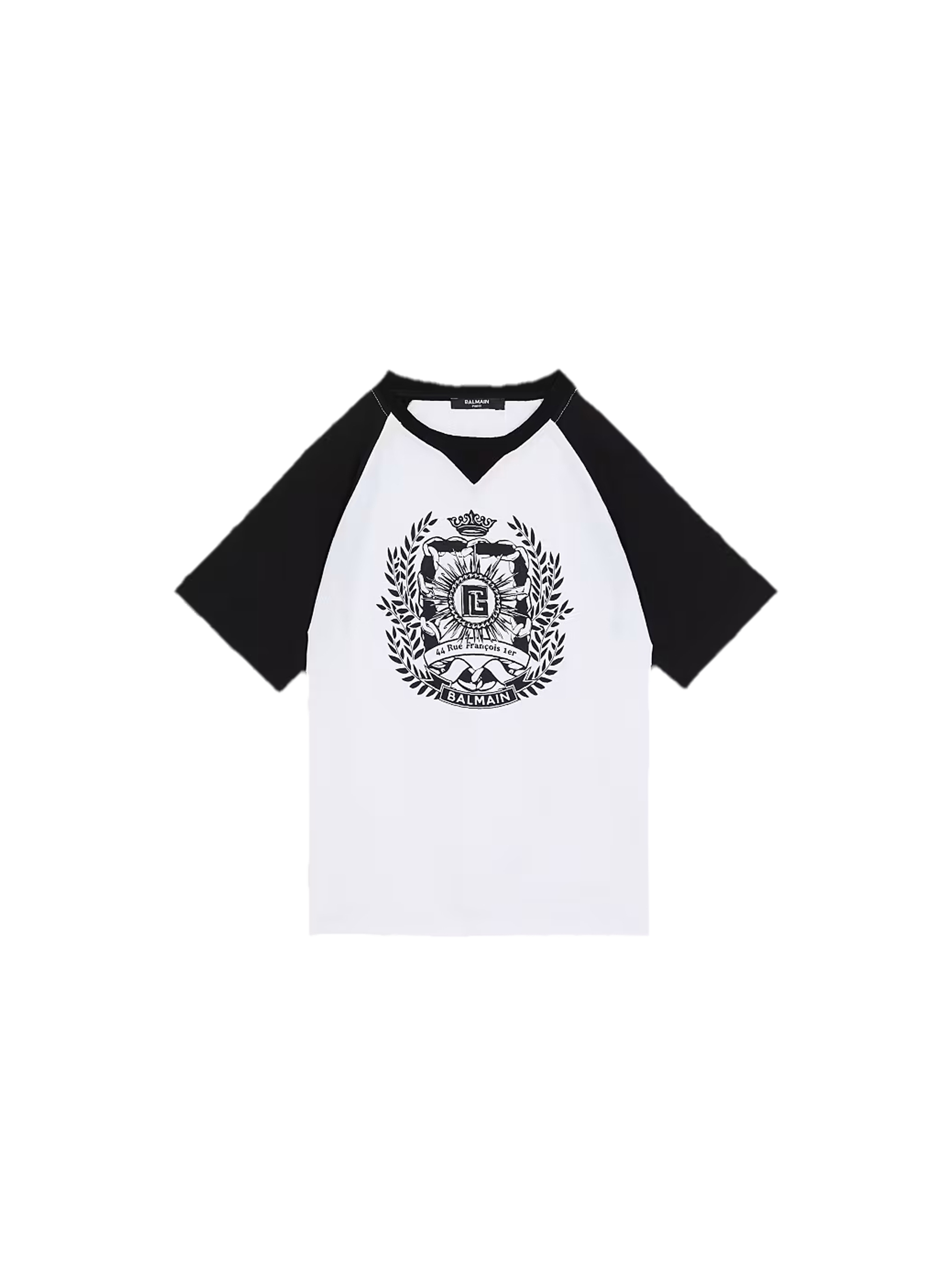 T-shirt a maniche corte, a tinta unita con maniche e bordo superiore in contrasto di colore, scollo rotondo e maxi stampa grafica con logo e stemma sul davanti. Per un look trendy e fashion. BALMAIN