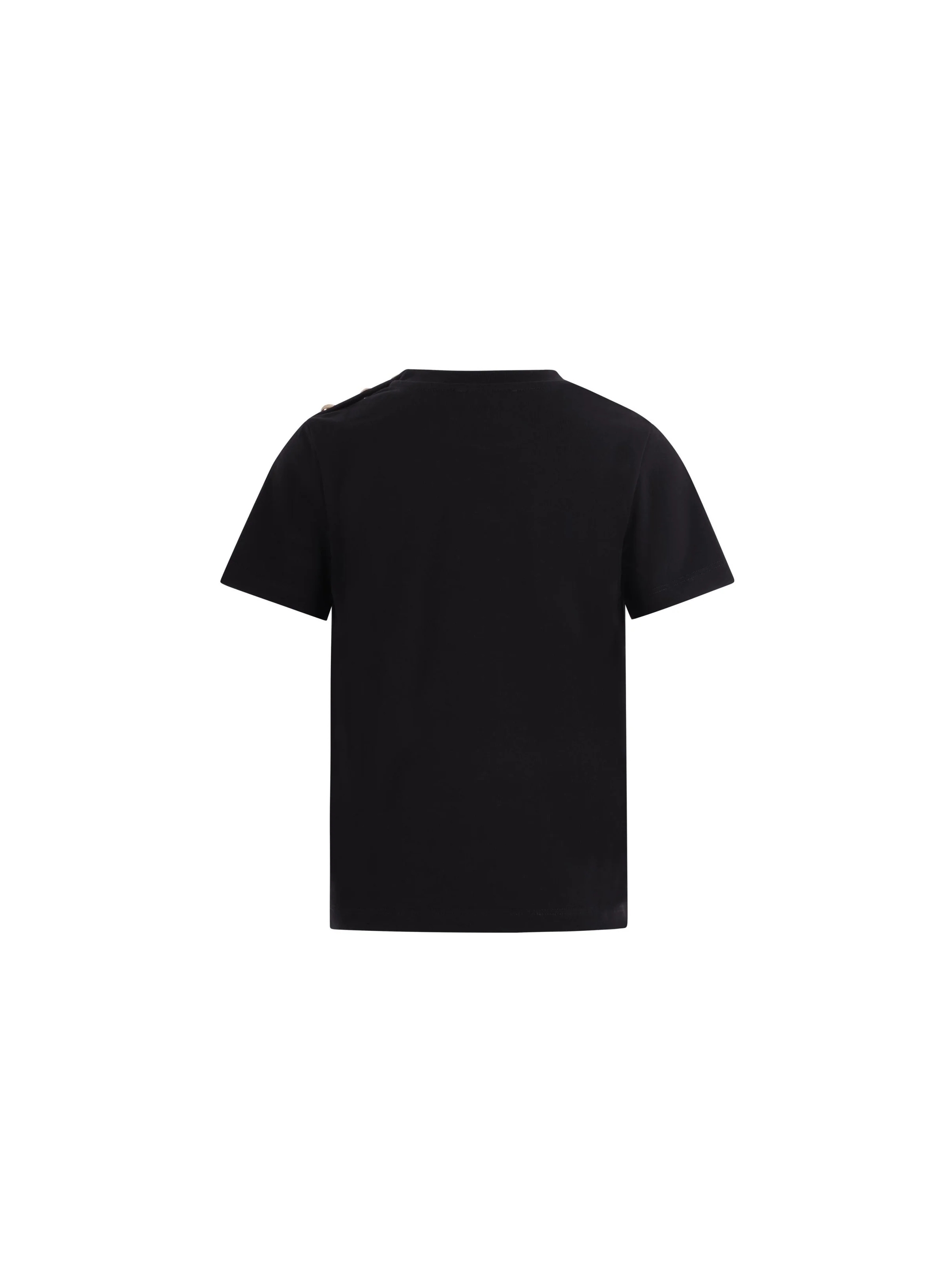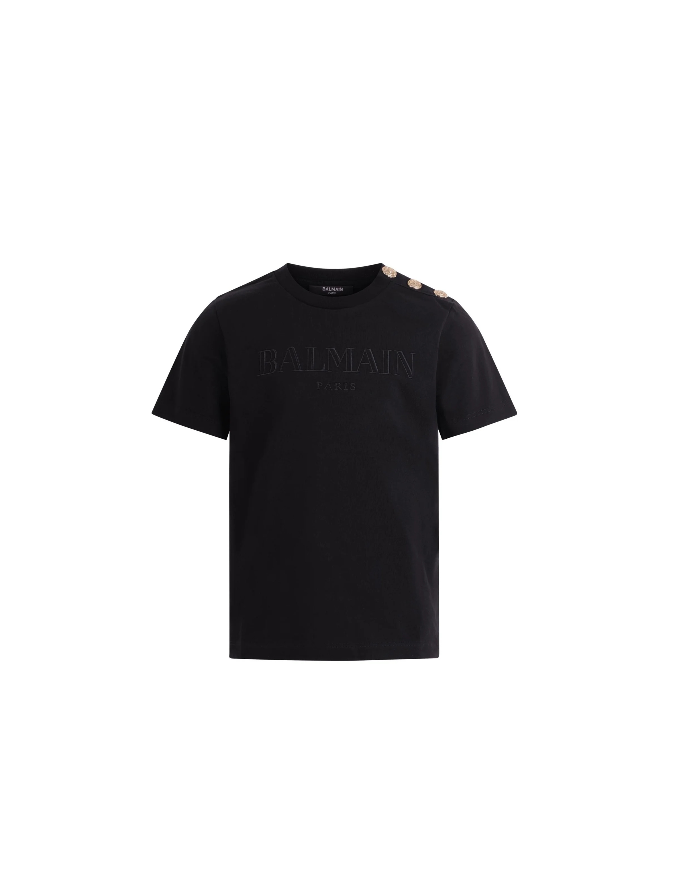 T-shirt a maniche corte, con scollo rotondo, a tinta unita, con bottoncini decorativi sulla spalla e maxi logo lettering ricamato in tinta sul davanti. Per un look trendy e fashion. BALMAIN