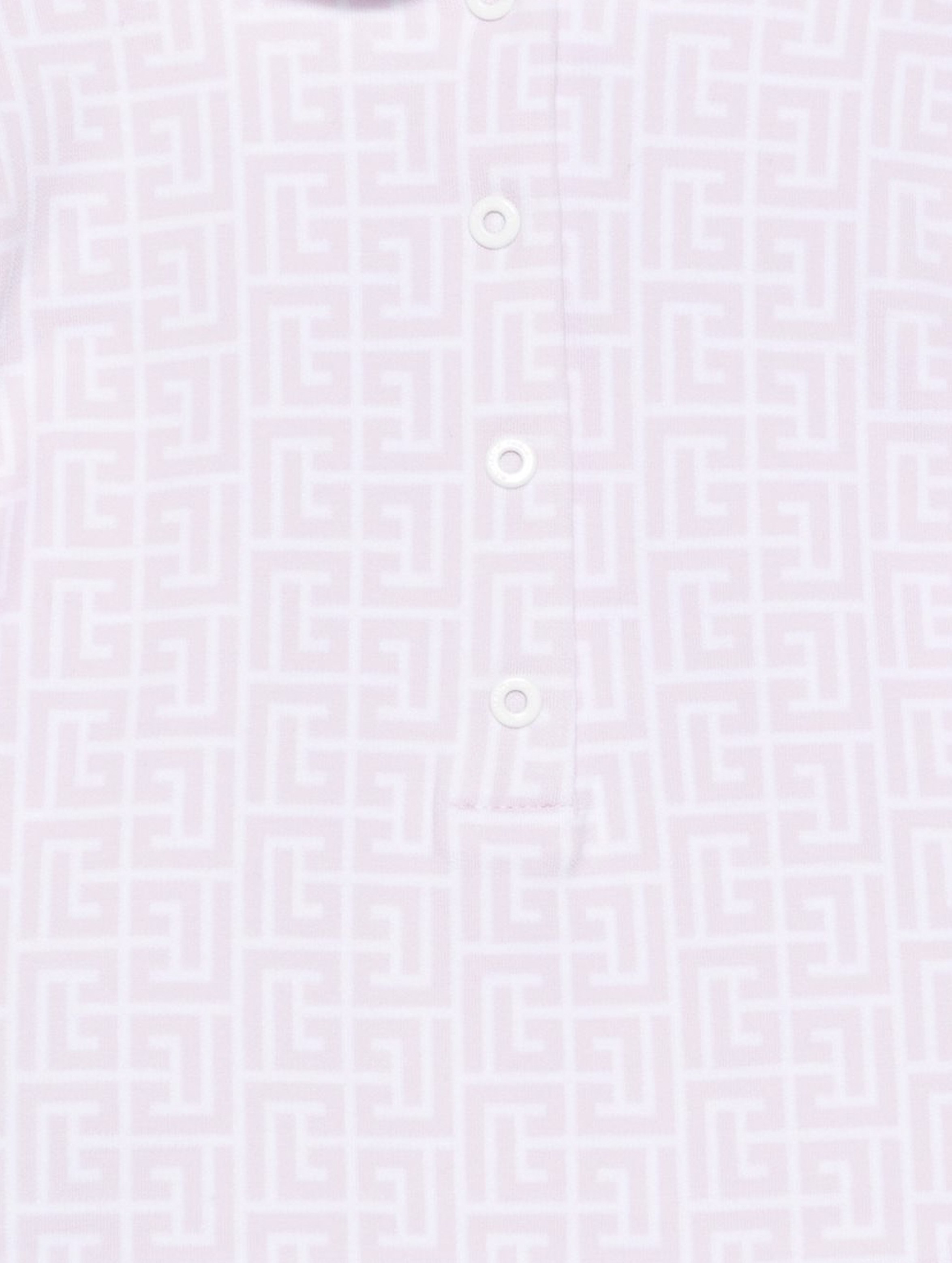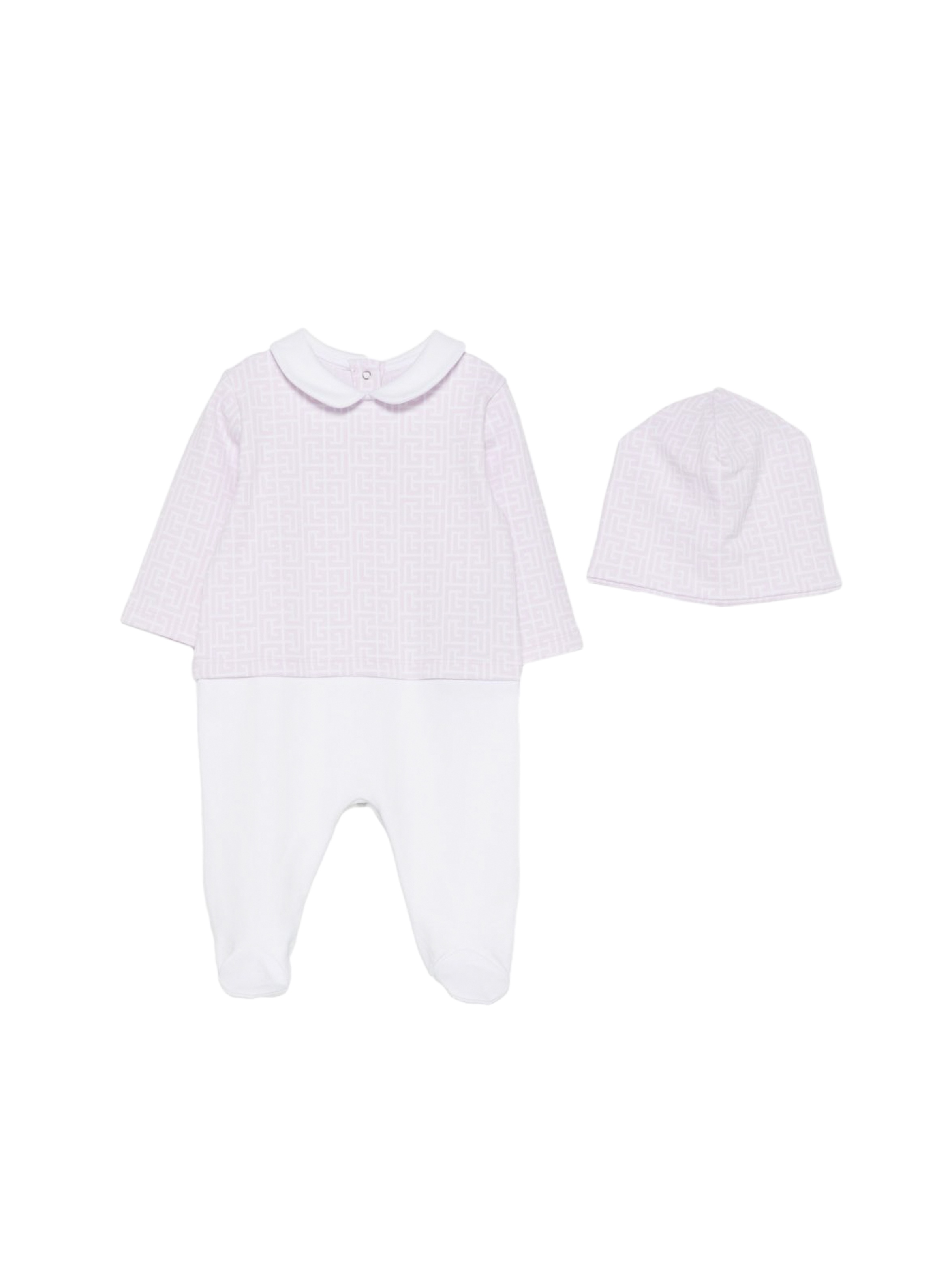 Completo due pezzi composto da tutina in jersey a maniche lunghe, con piedini, colletto rotondo, chiusura con bottoni a pressione e iconico monogramma labirinto nella parte superiore, e berretto coordinato. Per un look fashion e trendy. BALMAIN