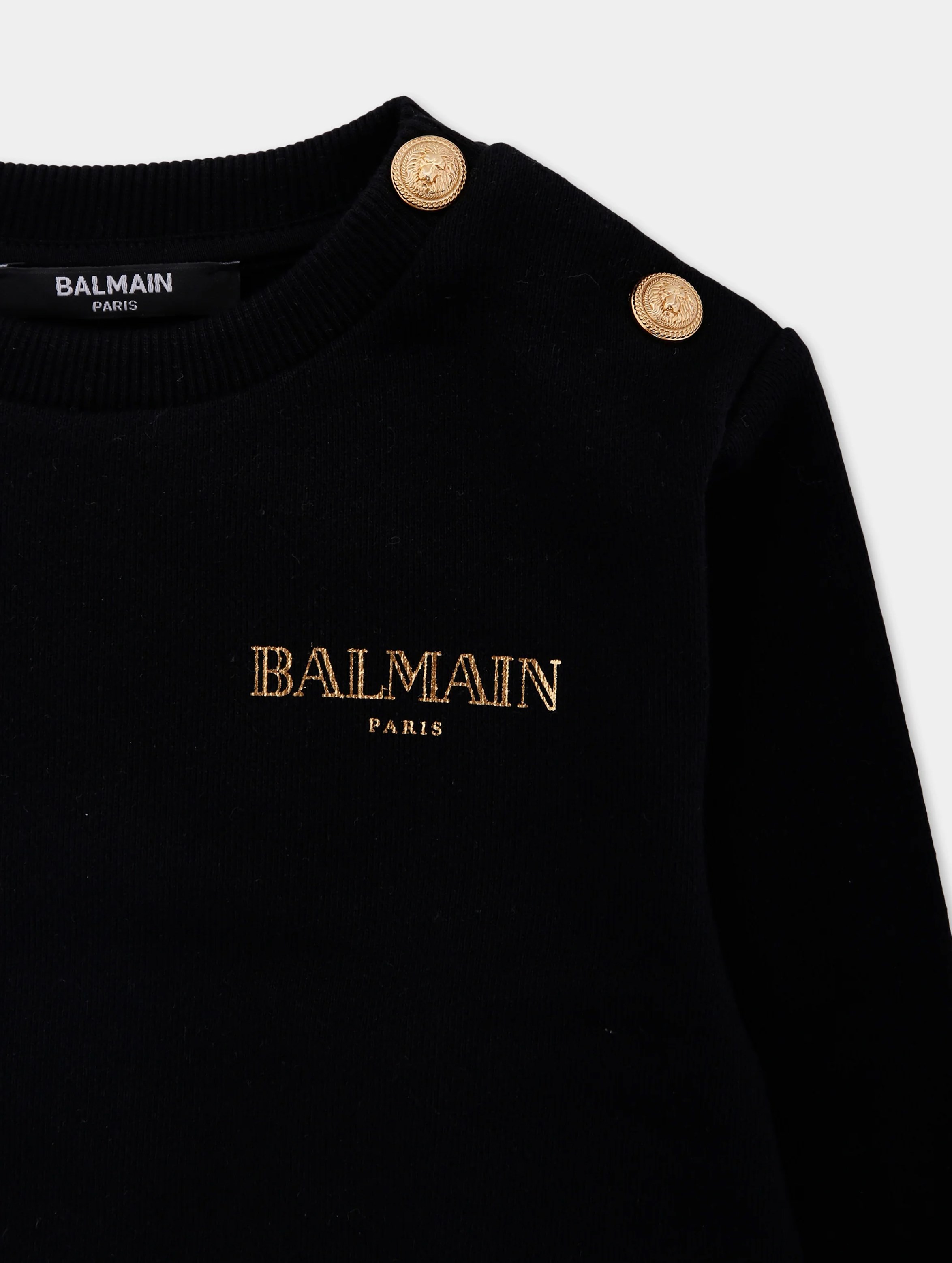 Felpa a maniche lunghe, con scollo rotondo, chiusura sulla spalla con bottoni logati, bordi e polsini a costine, a tinta unita e con logo ricamato in lurex gold sul petto. Per un look trendy e fashion. BALMAIN