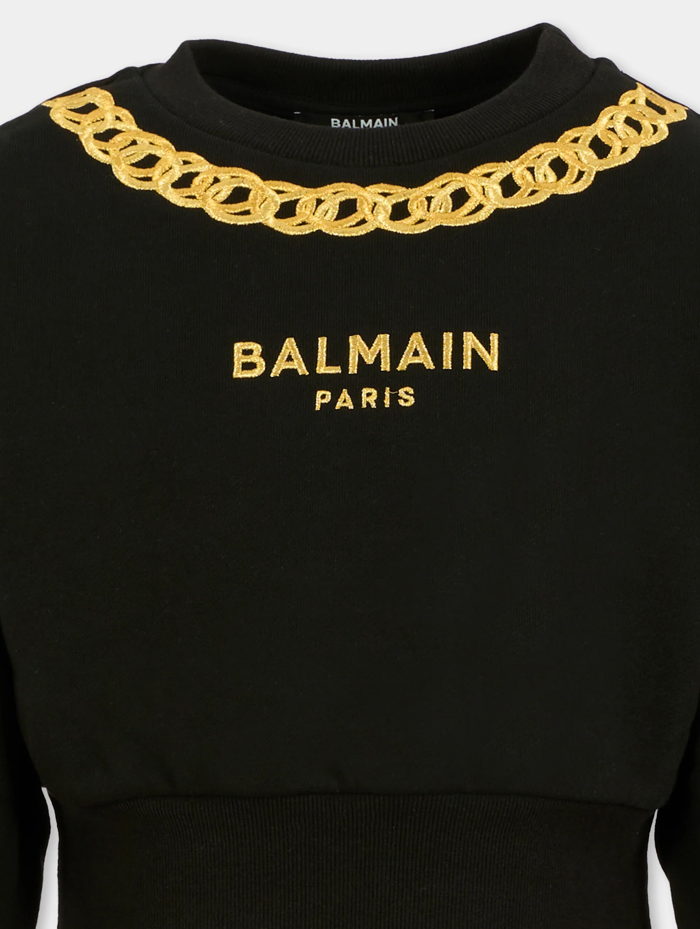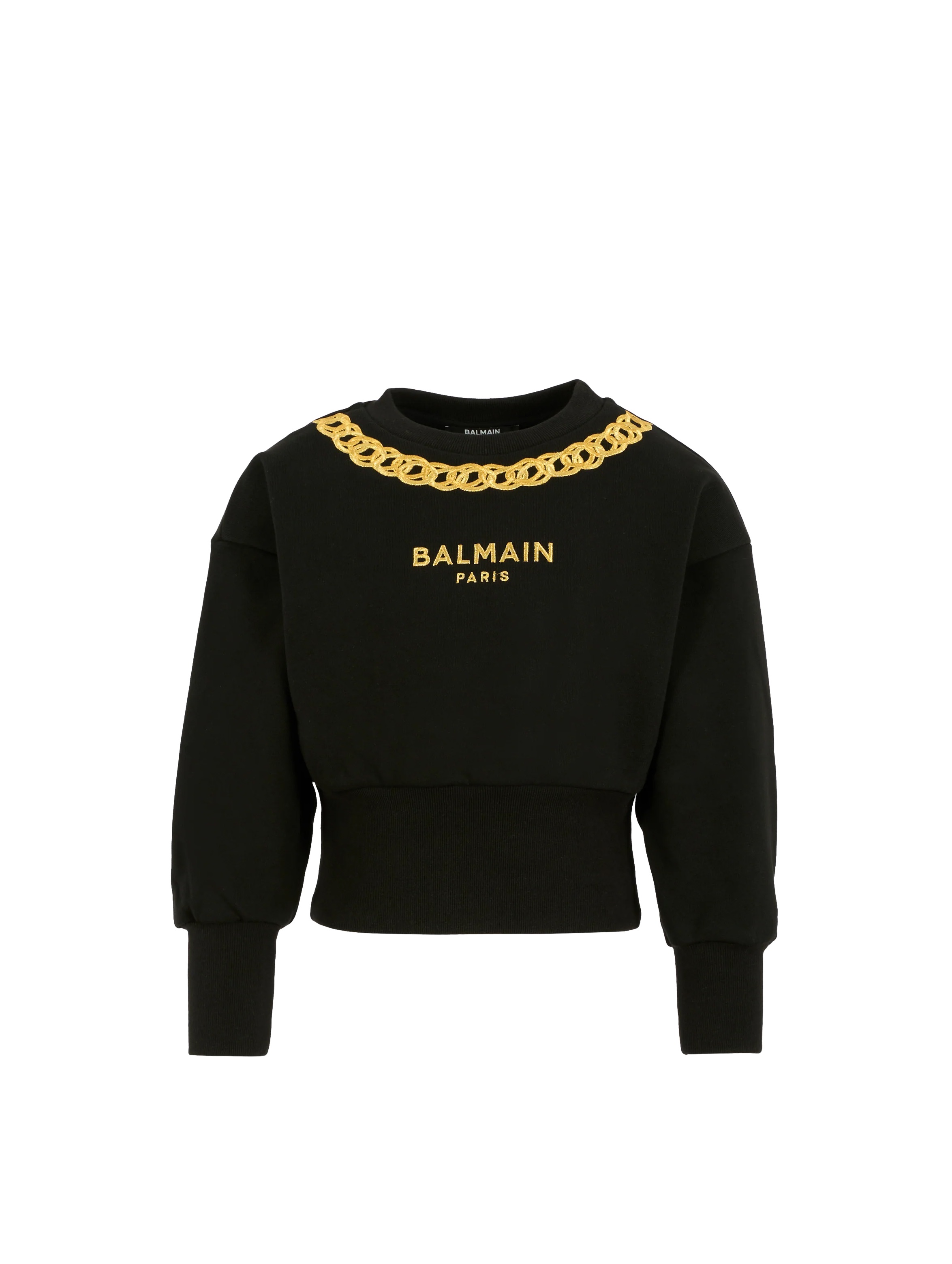 Felpa a maniche lunghe, con profili a costine, a tinta unita, con polsini e bordo inferiore alti, con ricamo di collana sul carrè e logo ricamato gold sul fronte. Per un look fashion e chic. BALMAIN