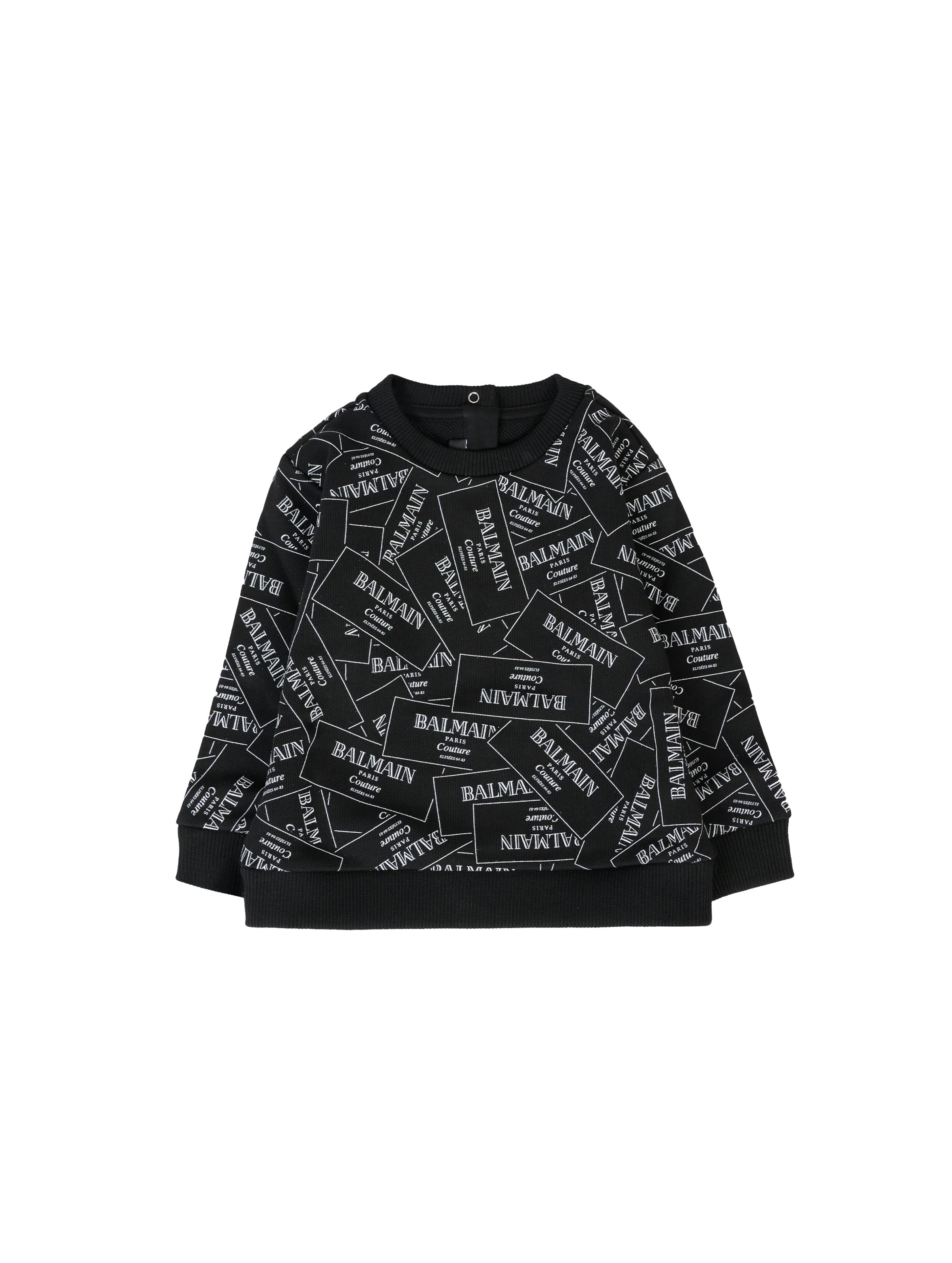 Felpa a maniche lunghe, con scollo rotondo, chiusura sul retro con bottoni a pressione, bordi e polsini a costine, a tinta unita e con stampa logo Balmain Couture a contrasto all over. Per un look trendy e casual. BALMAIN