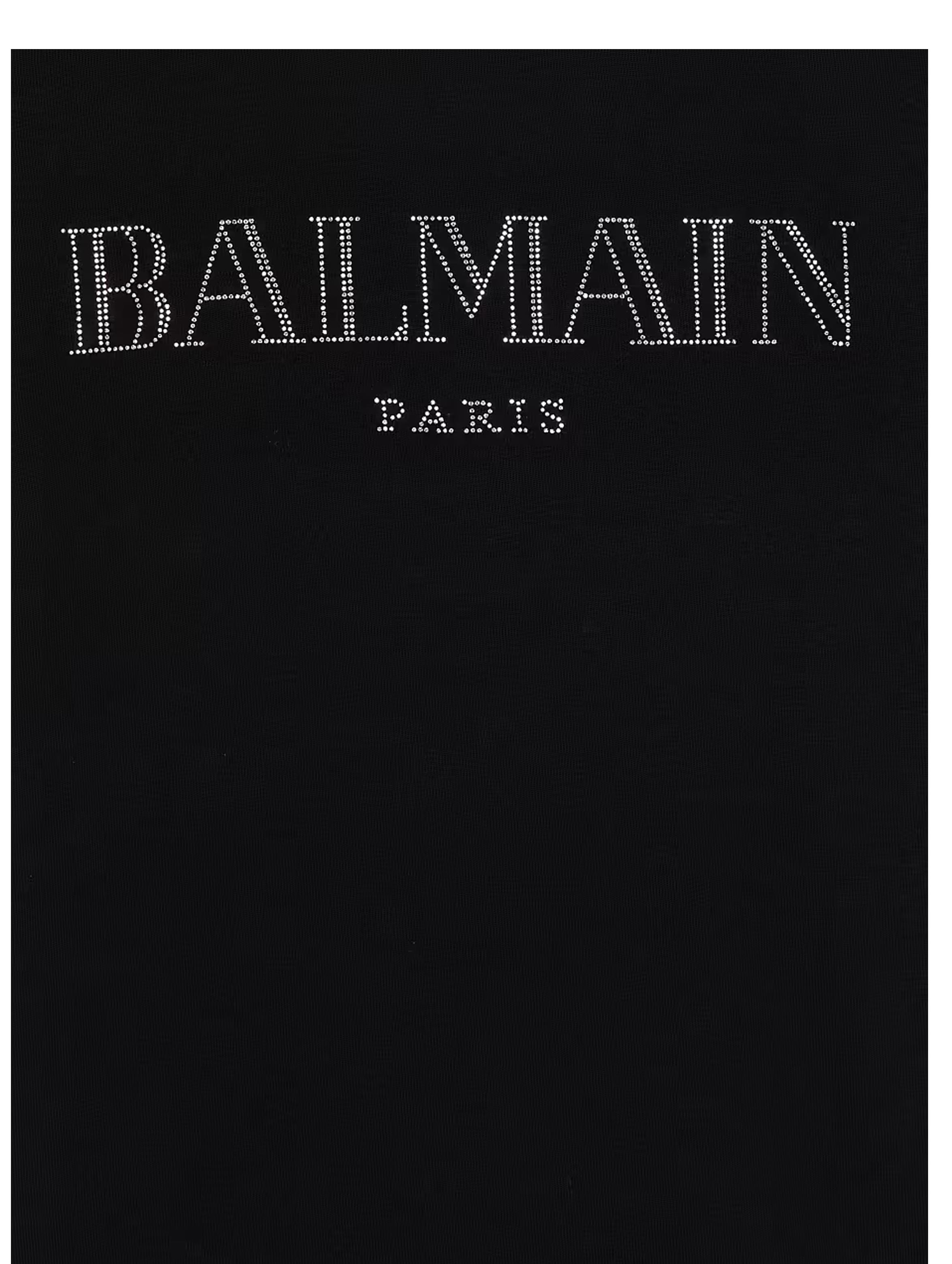 T-shirt a maniche corte, con scollo rotondo, a tinta unita, con bottoncini decorativi sulla spalla e maxi logo lettering con strass a contrasto sul fronte. Per un look trendy e fashion. BALMAIN