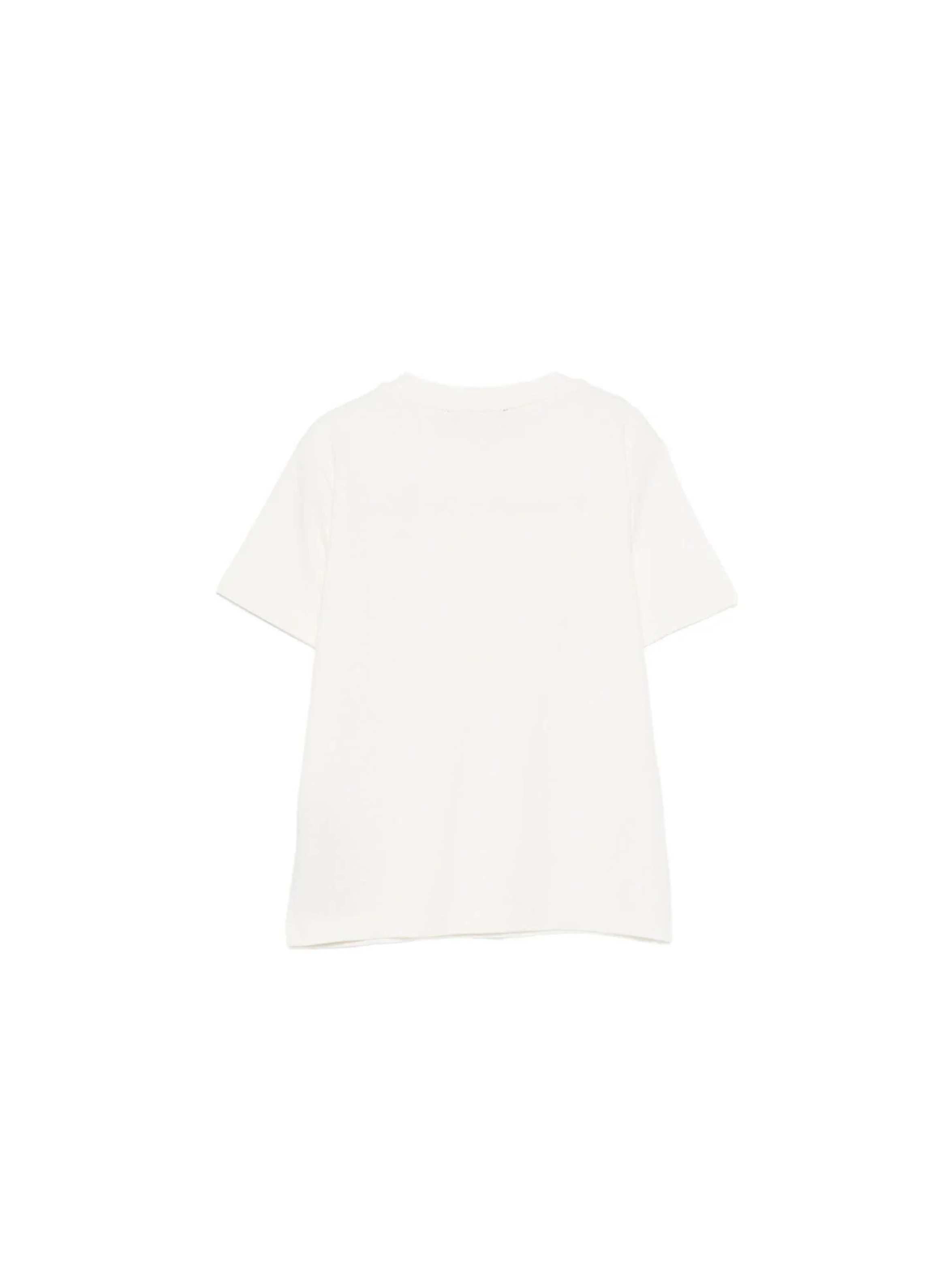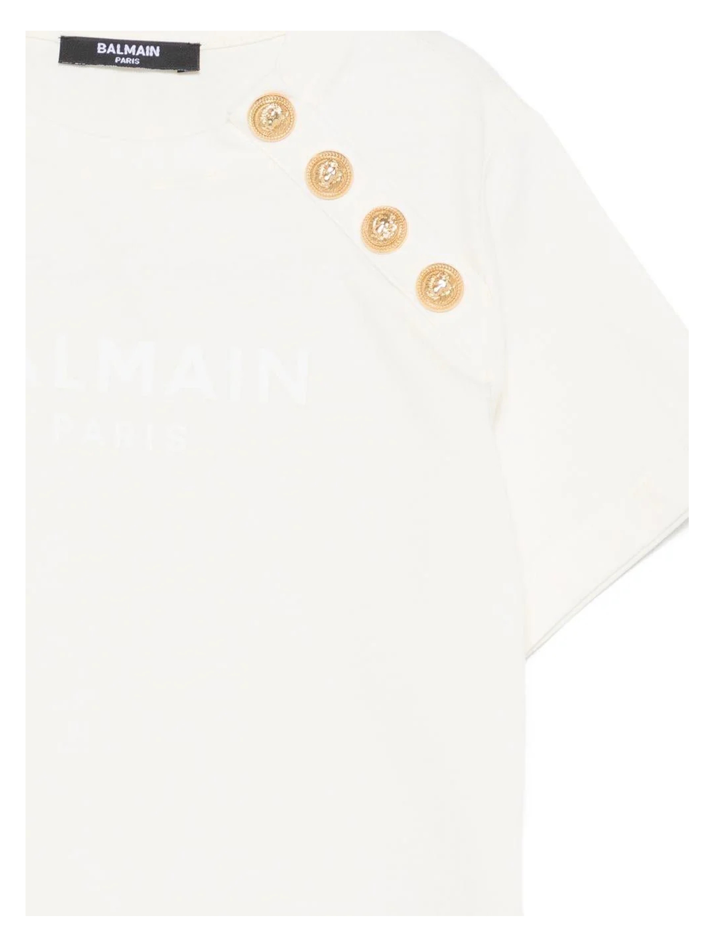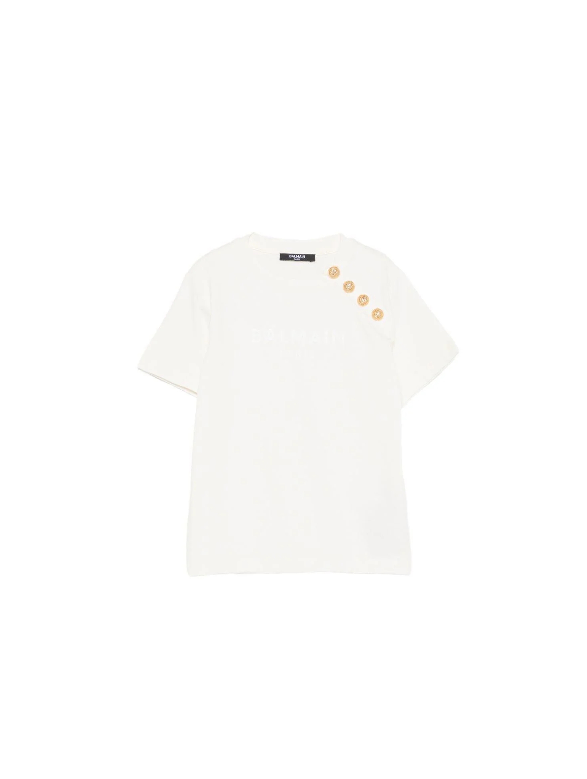 T-shirt a maniche corte, con scollo rotondo, a tinta unita, con bottoncini decorativi sulla spalla e maxi logo stampato a contrasto sul fronte. Per un look trendy e fashion. BALMAIN