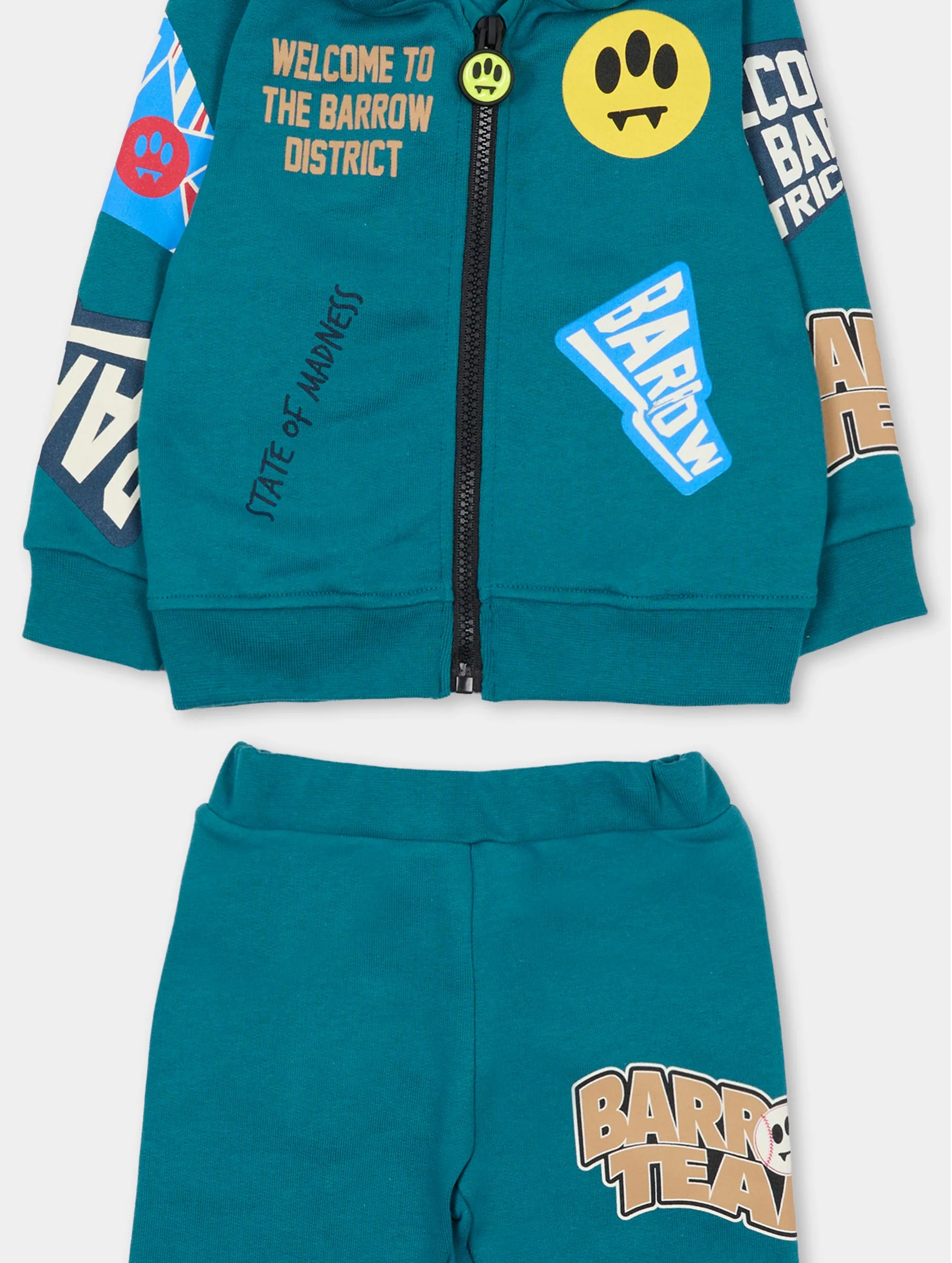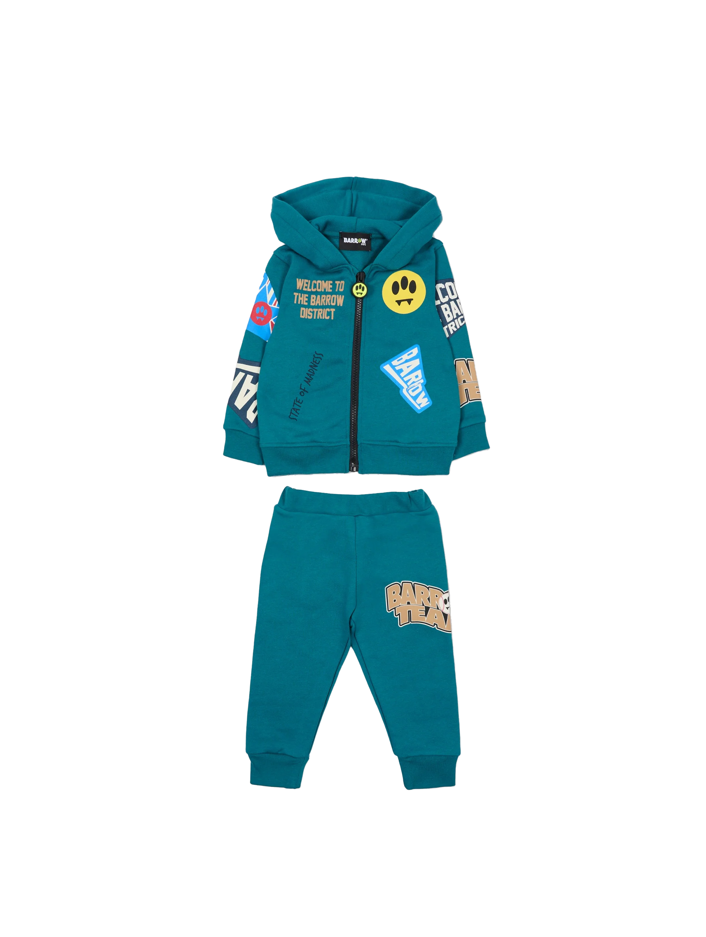 Tuta in felpa con cappuccio, a maniche lunghe, a tinta unita, con bordi e polsini a costine, apertura con zip centrale, tirazip logato, logo e sketch all over, maxi stampa a slogan sul retro, pantaloni con vita elasticizzata e sketch sul lato. Per un look sportivo e trendy. BARROW