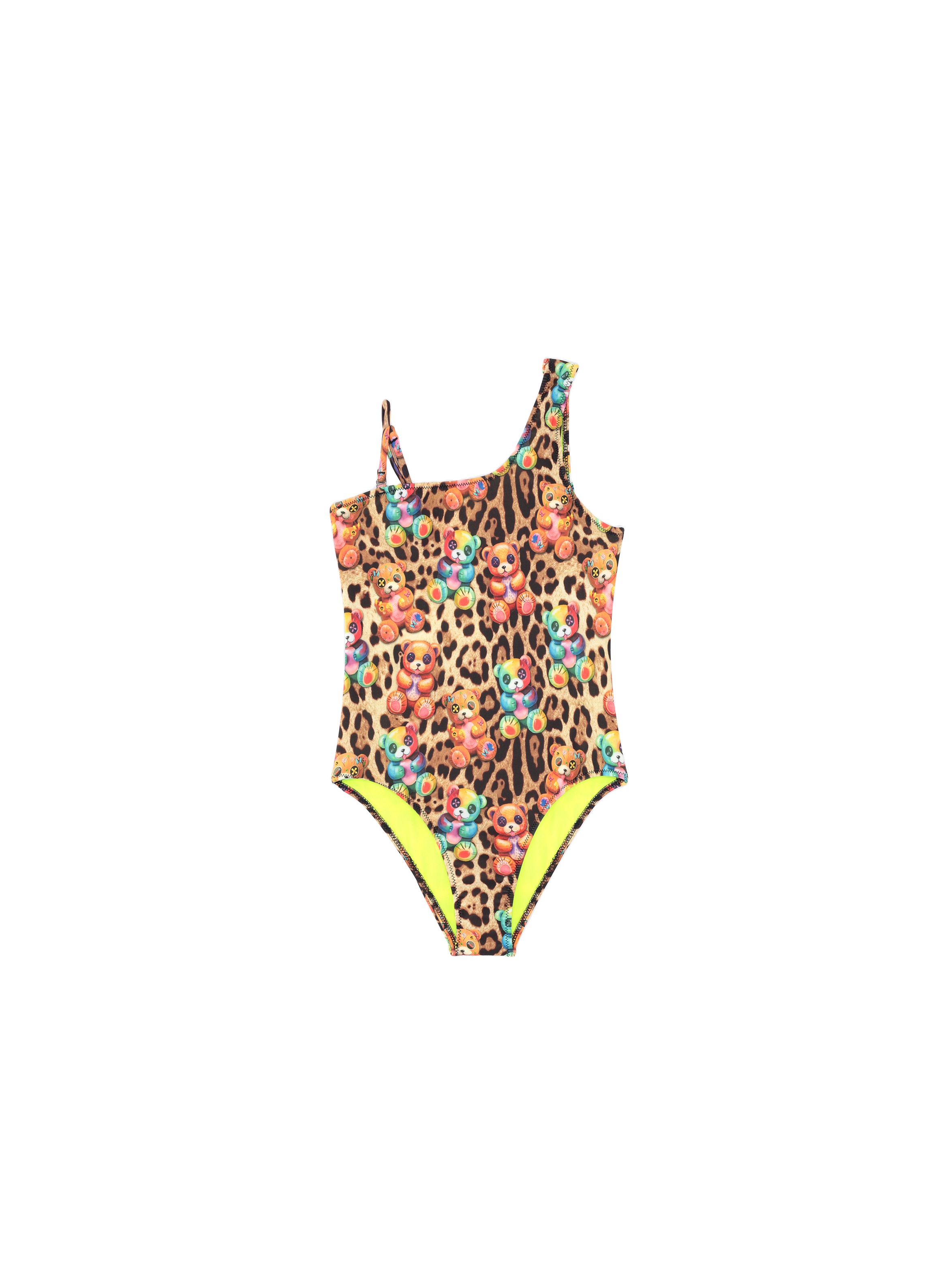 Costume intero per bambina realizzato in lycra, con scollo asimmetrico, una spallina media e una sottile regolabile, patch con logo sul retro, stampa maculata e iconici Teddy Barrow all over. Per un look fashion e cool. BARROW
