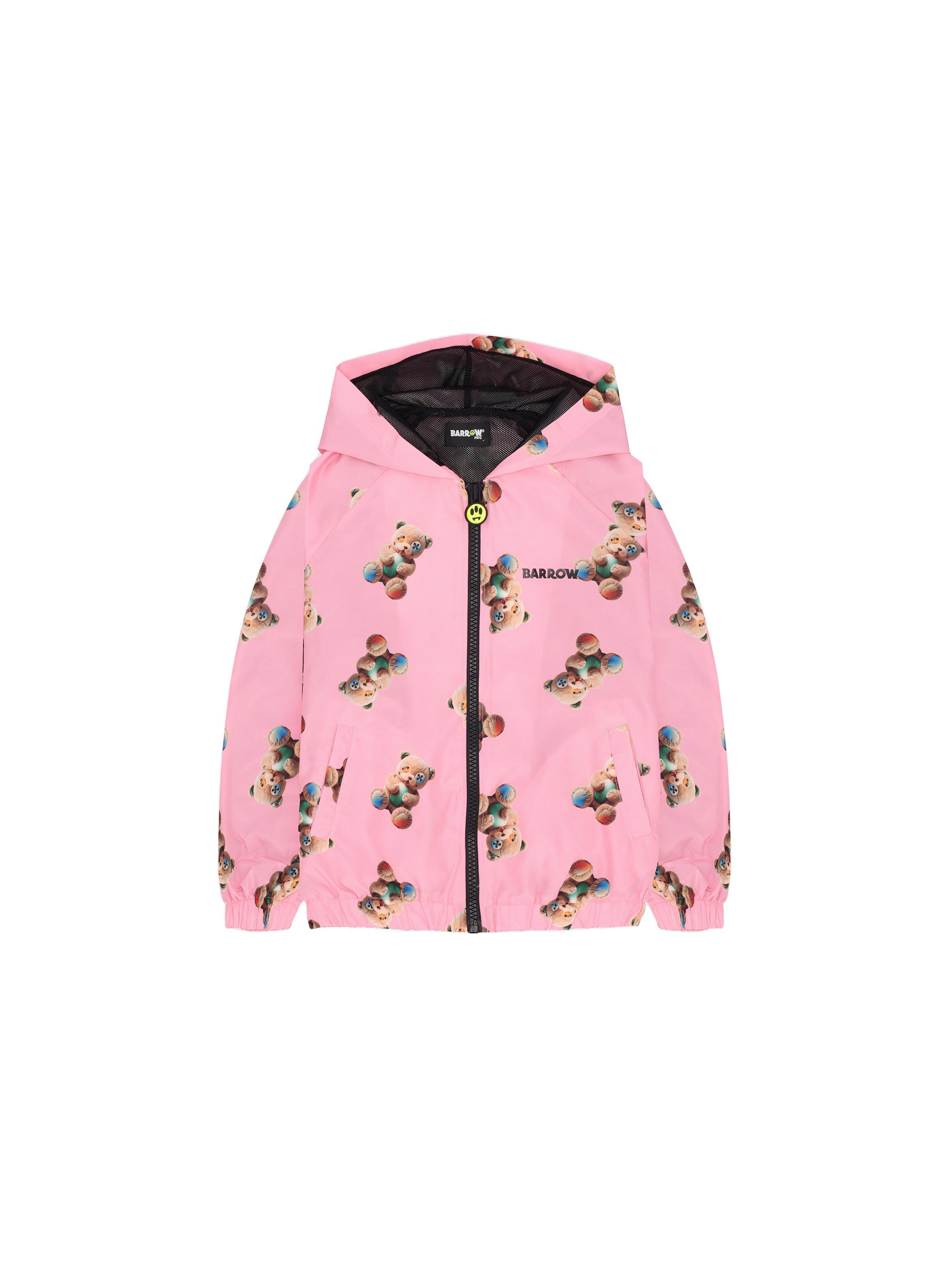 Giubbino leggero in resistente nylon, con fodera interna in rete traspirante, con cappuccio, chiusura con zip, tirazip logato, polsini e bordo inferiore con fascia elastica, tasche a fessura ai lati e stampa di Teddy Barrow all over. Per un look urban e fashion. BARROW