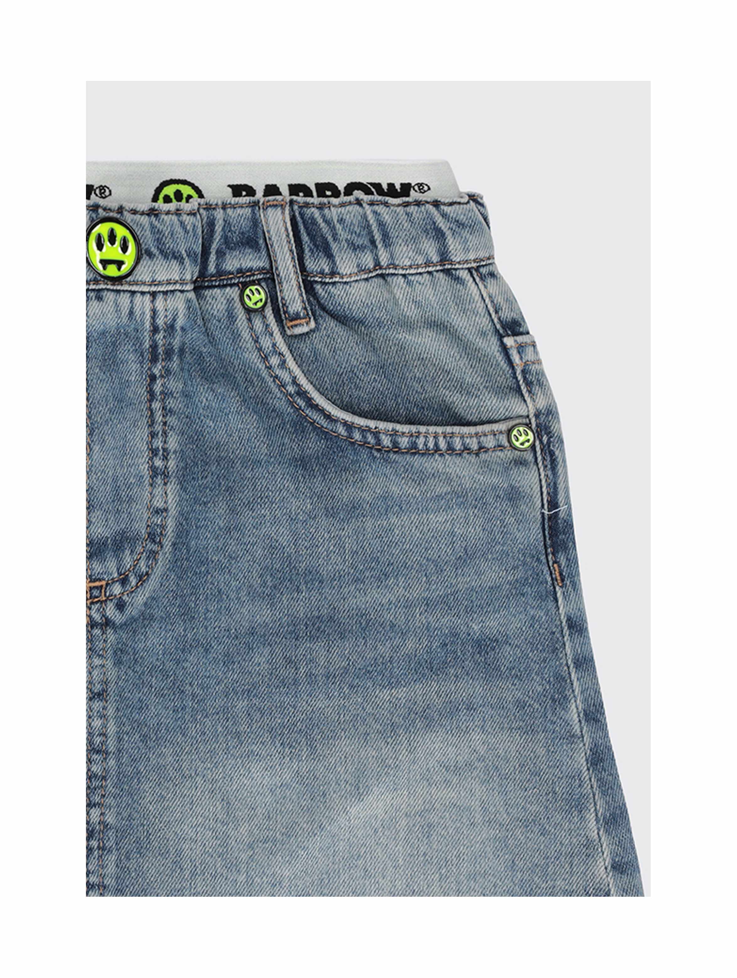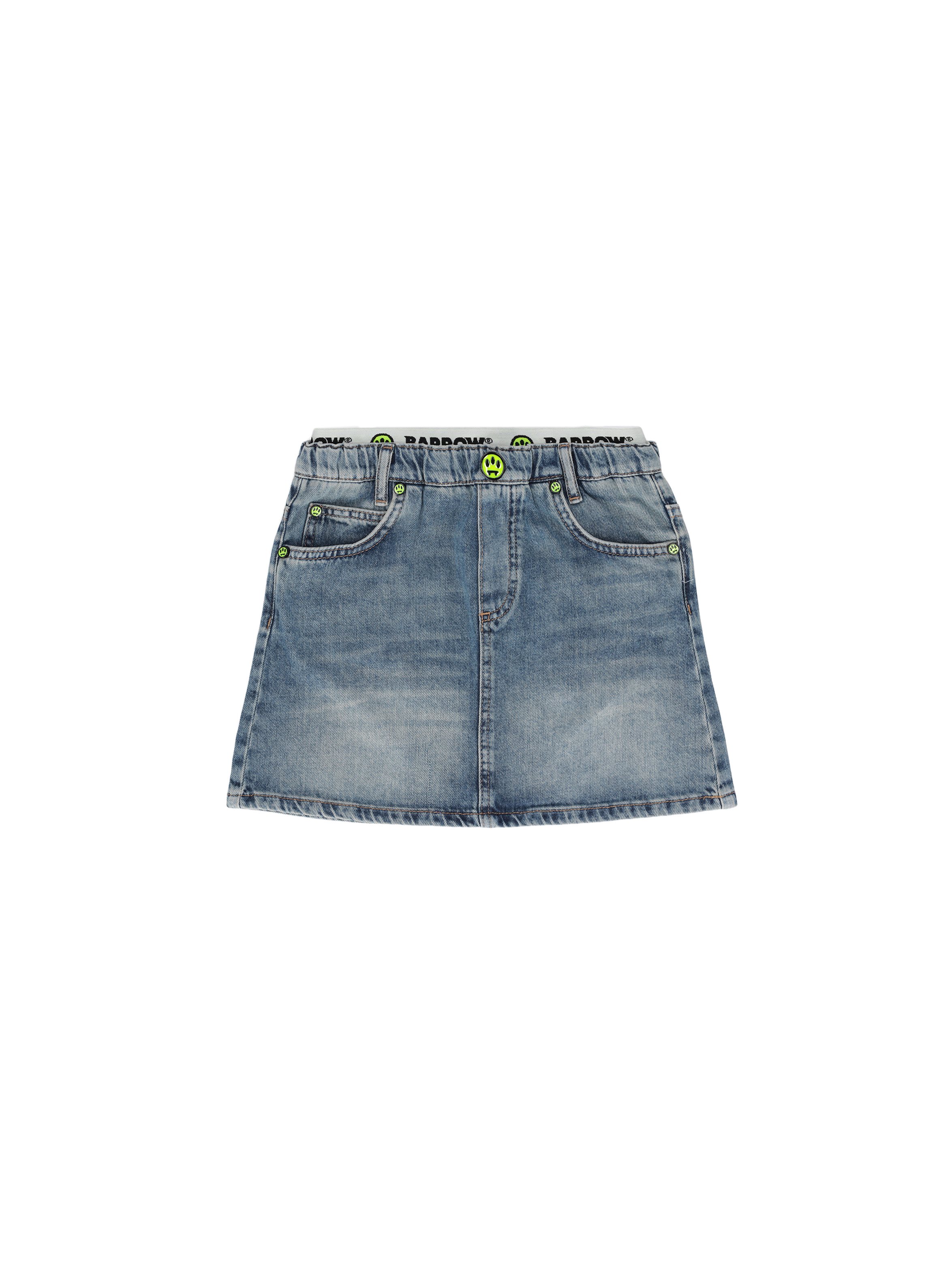 Gonna corta realizzata in denim dal lavaggio chiaro, con piccole sfumature effetto used, modello 5 tasche, con vita elasticizzata, patch con logo sul retro, passanti in vita, elastico logato in vita e dettagli con iconico Smile. Per un look fashion e trendy. BARROW