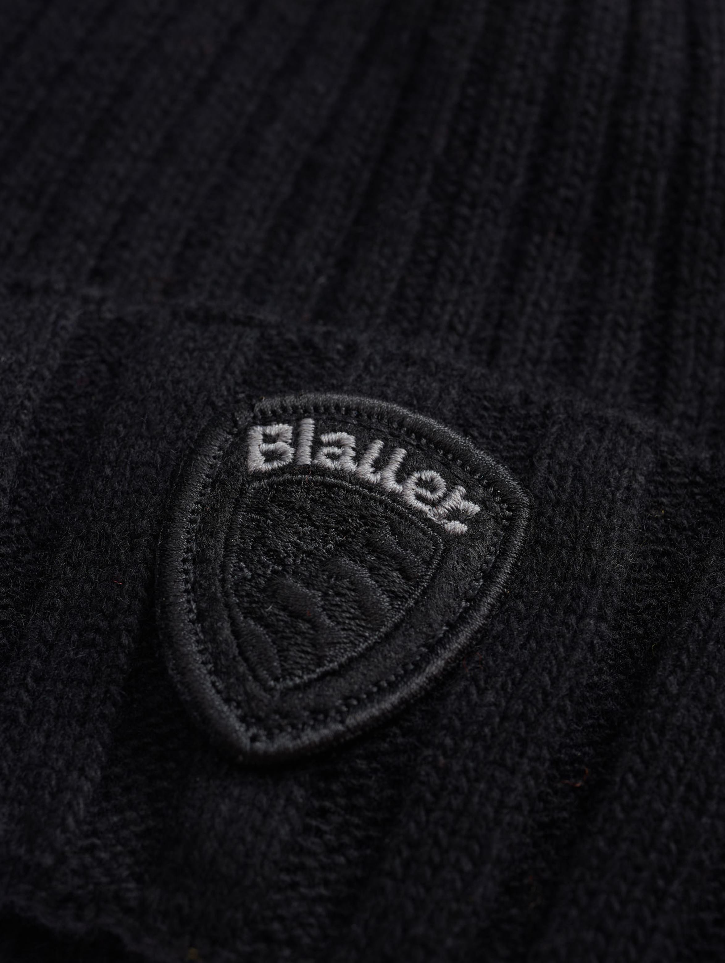 Berretto in misto lana, con lavorazione maglia in costina verticale più larga nel risvolto, a tinta unita e con logo scudetto applicato sul risvolto. Per un look casual e trendy. BLAUER