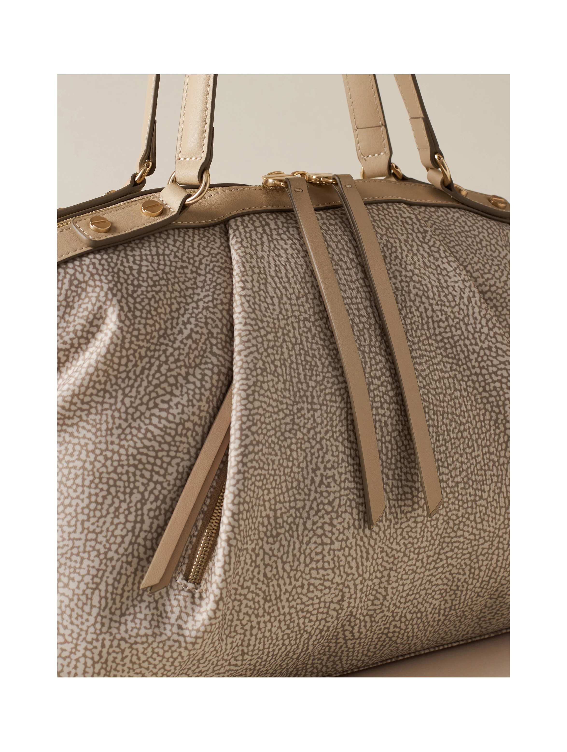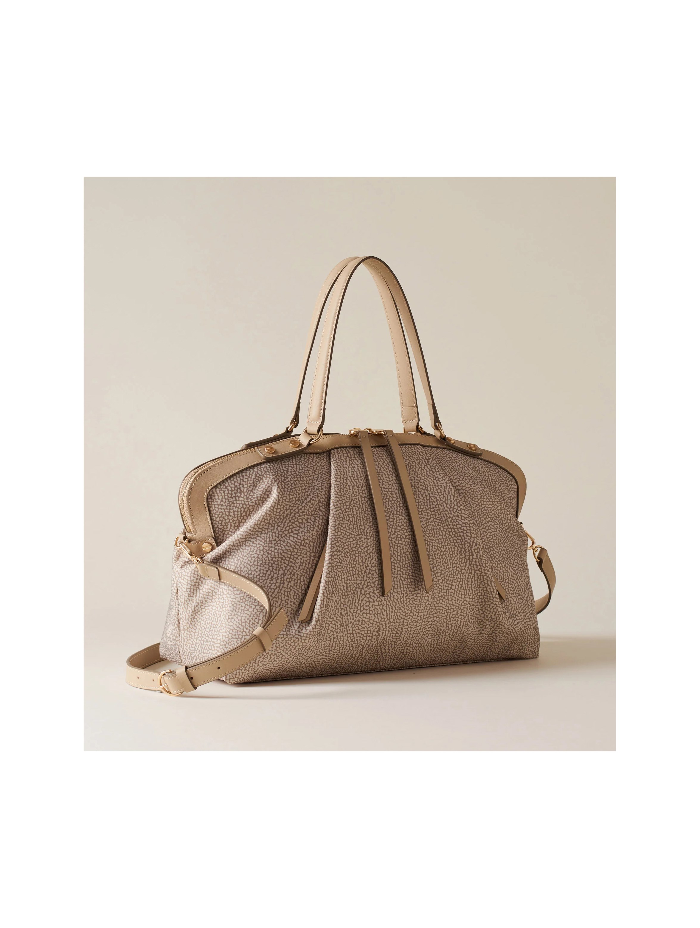 Borsa a bauletto realizzata in tessuto riciclato stampa OP, con dettagli in pelle di vitello, fodera in tessuto, chiusura con zip metallo e doppio cursore, tirazip a vite, due tasche frontali chiuse con zip, doppi manici, tracolla in pelle regolabile con fibbia e removibile con moschettoni logati, tasca interna aperta, tasca interna chiusa con zip e metallerie oro chiaro opaco. Per un look raffinato ed elegante. BORBONESE