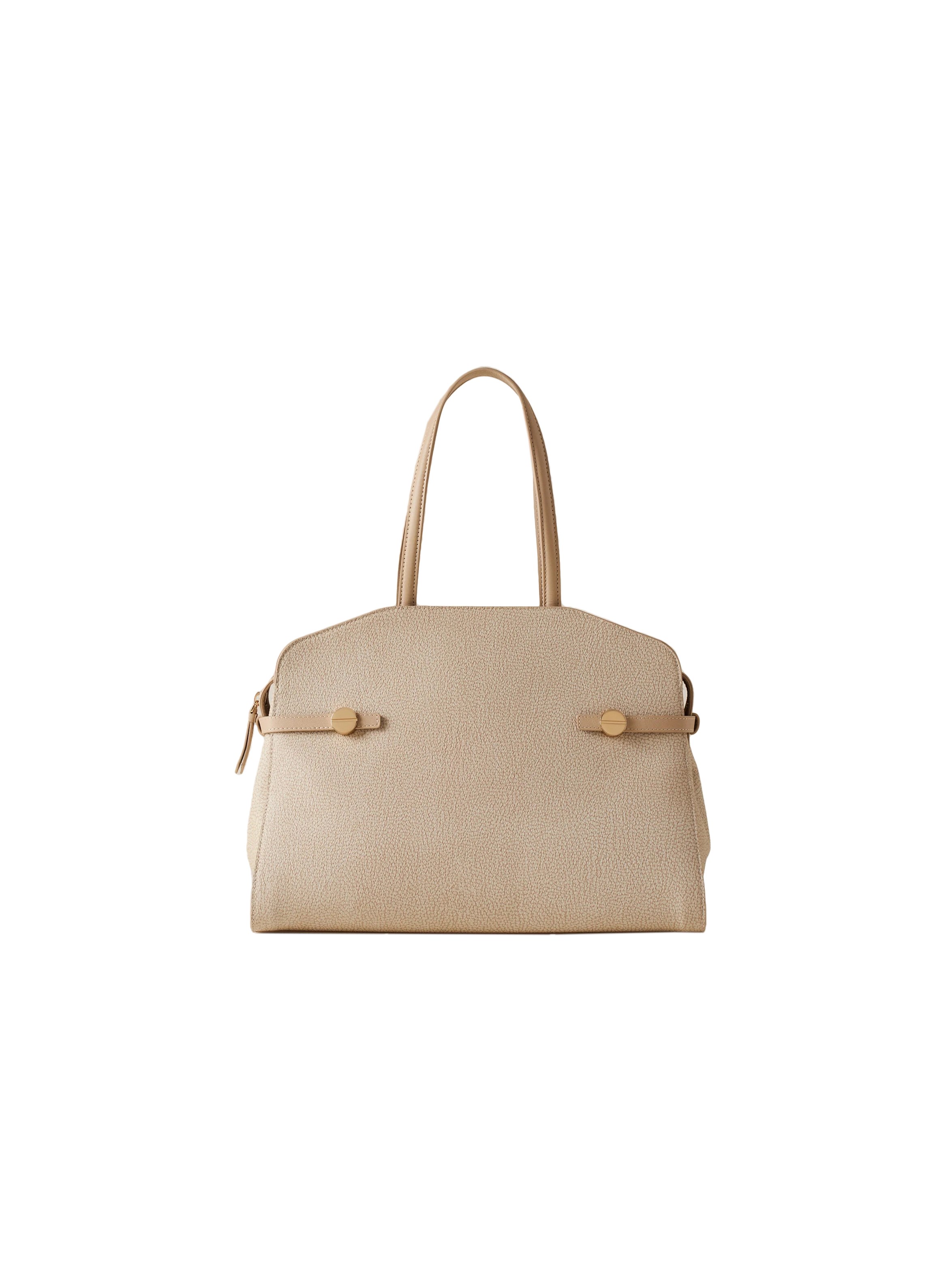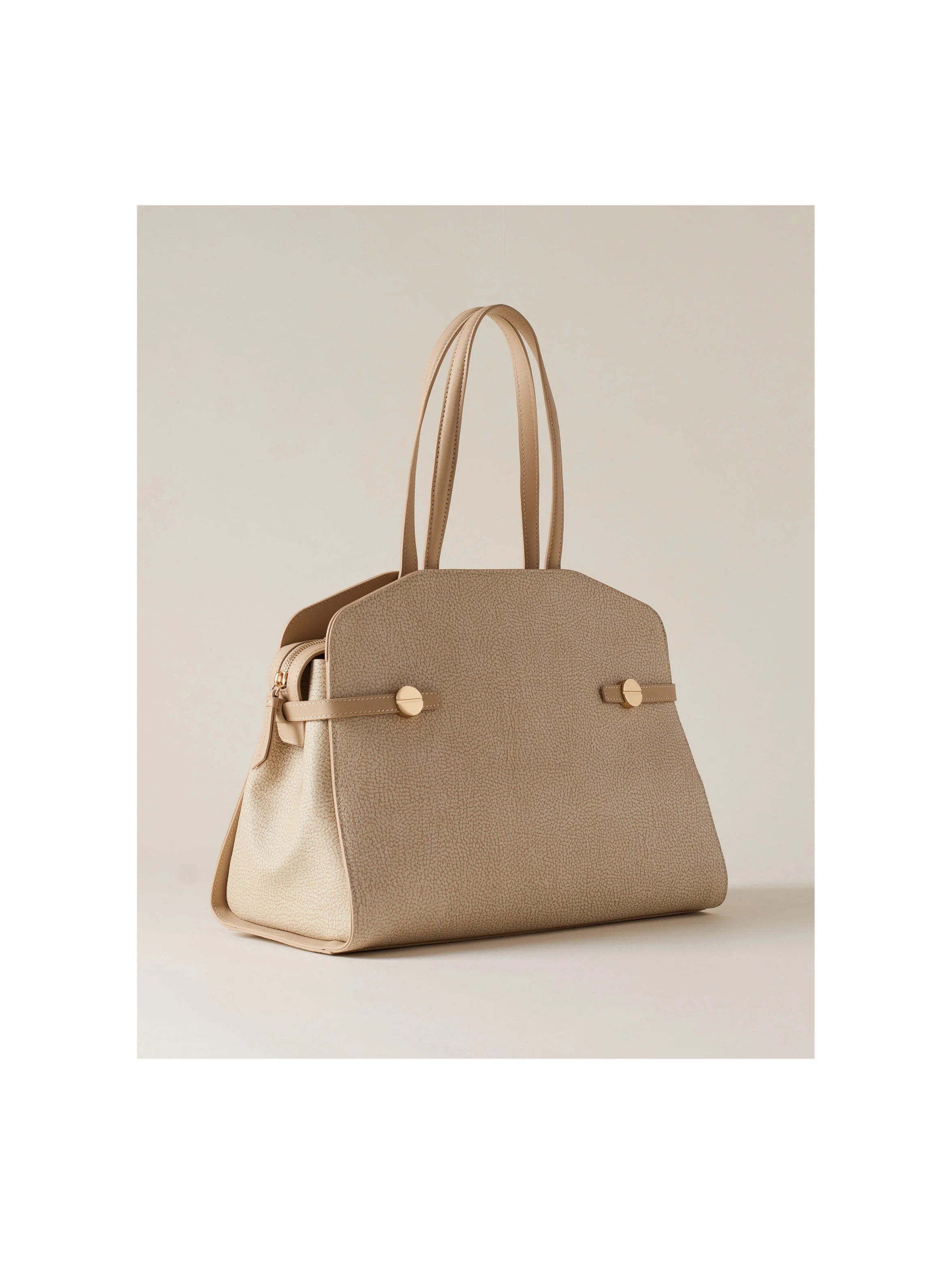 Borsa shopping media, realizzata in tela con stampa OP, con dettagli in pelle di vitello, fodera in tessuto effetto camoscio, con doppi manici, chiusura con zip metallo e tirazip in pelle, con tasca interna aperta, tasca interna chiusa con zip, listini laterali sul fianco con elemento decorativo a vite, regolabili con gemello per permettere una maggiore apertura e metallerie oro chiaro opaco. Per un look distintivo e fashion. BORBONESE