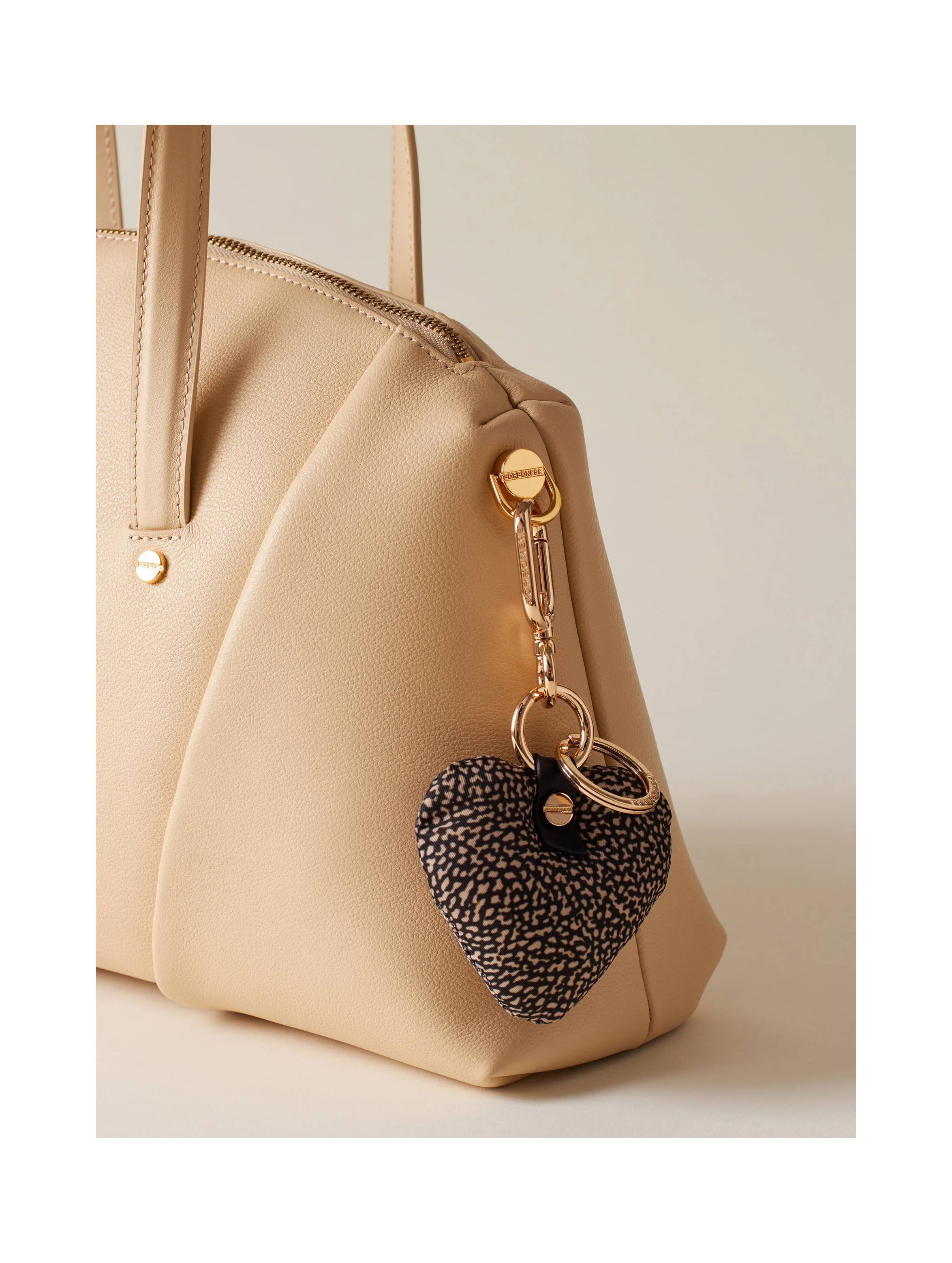 Portachiavi a forma di cuore, realizzato in tessuto riciclato OP, con dettagli in pelle, impreziosito da piccole viti decorative, con anello portachiavi con catenella e metallerie oro chiaro. Un accessorio fashion e chic. BORBONESE