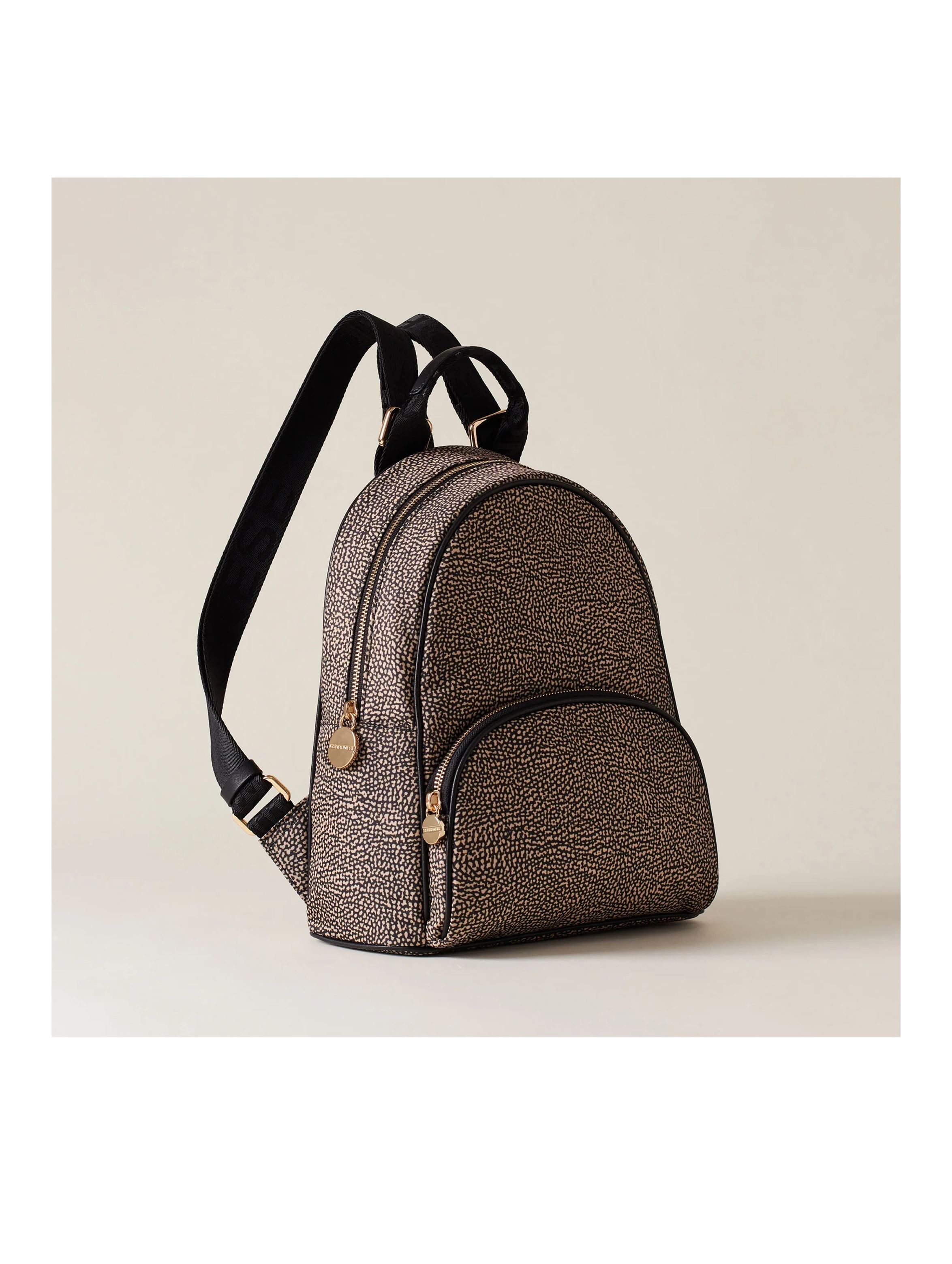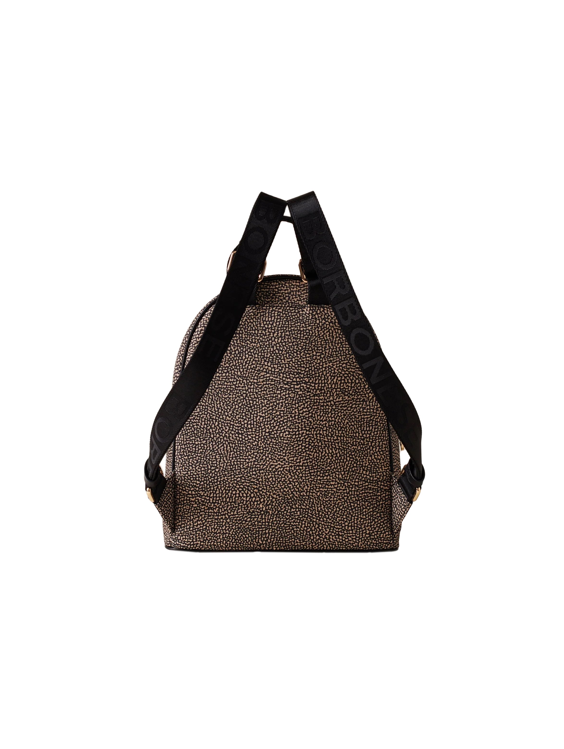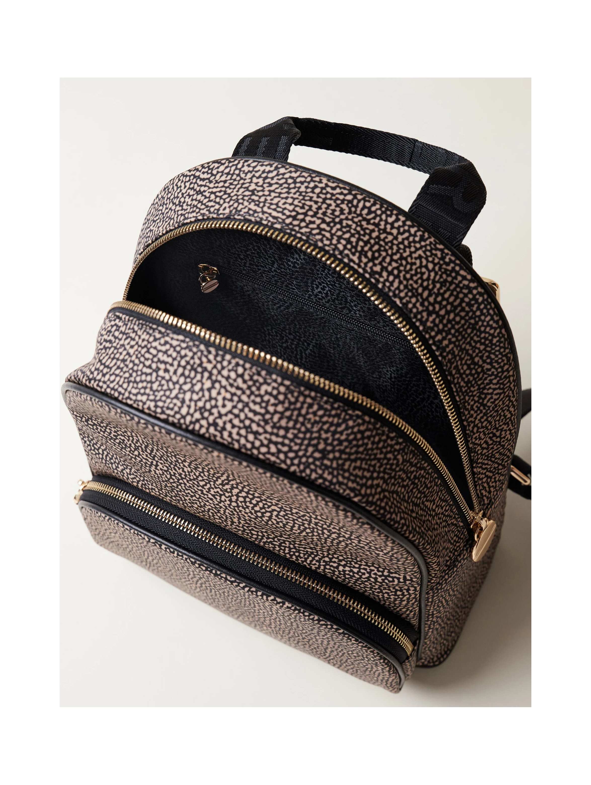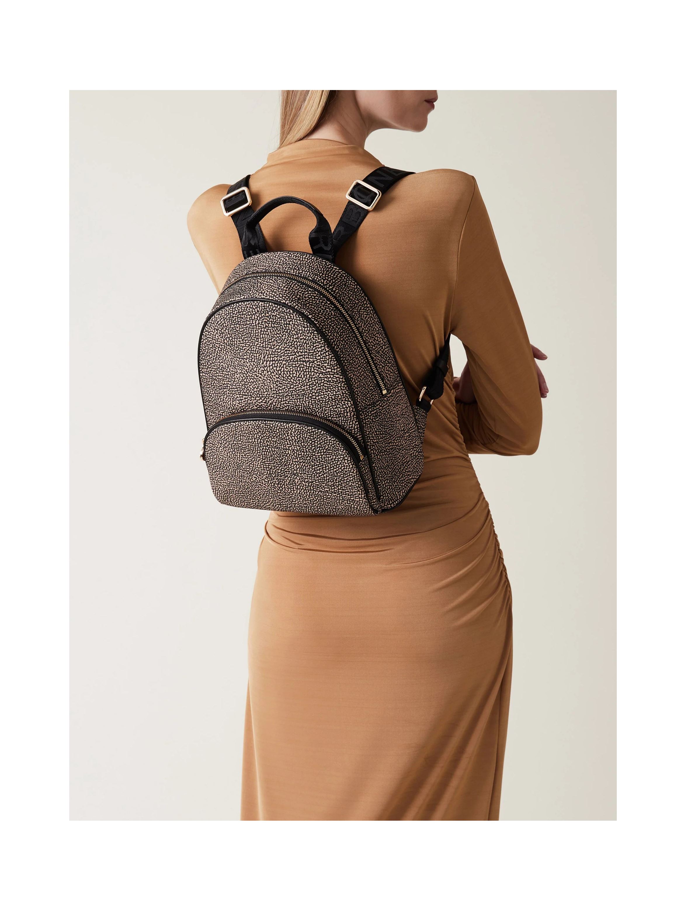 Zaino in tessuto riciclato stampato Op, con dettagli in pelle di vitello, con tasca esterna con zip, chiusura regolata con zip, tirazip di metallo a forma di vite logata, impugnatura con nastro logato e dettaglio in pelle, tasca interna aperta, spallacci regolabili di nastro logato, fodera di tessuto riciclato jacquard Op e metallerie oro chiaro. Per un look fashion e trendy. BORBONESE