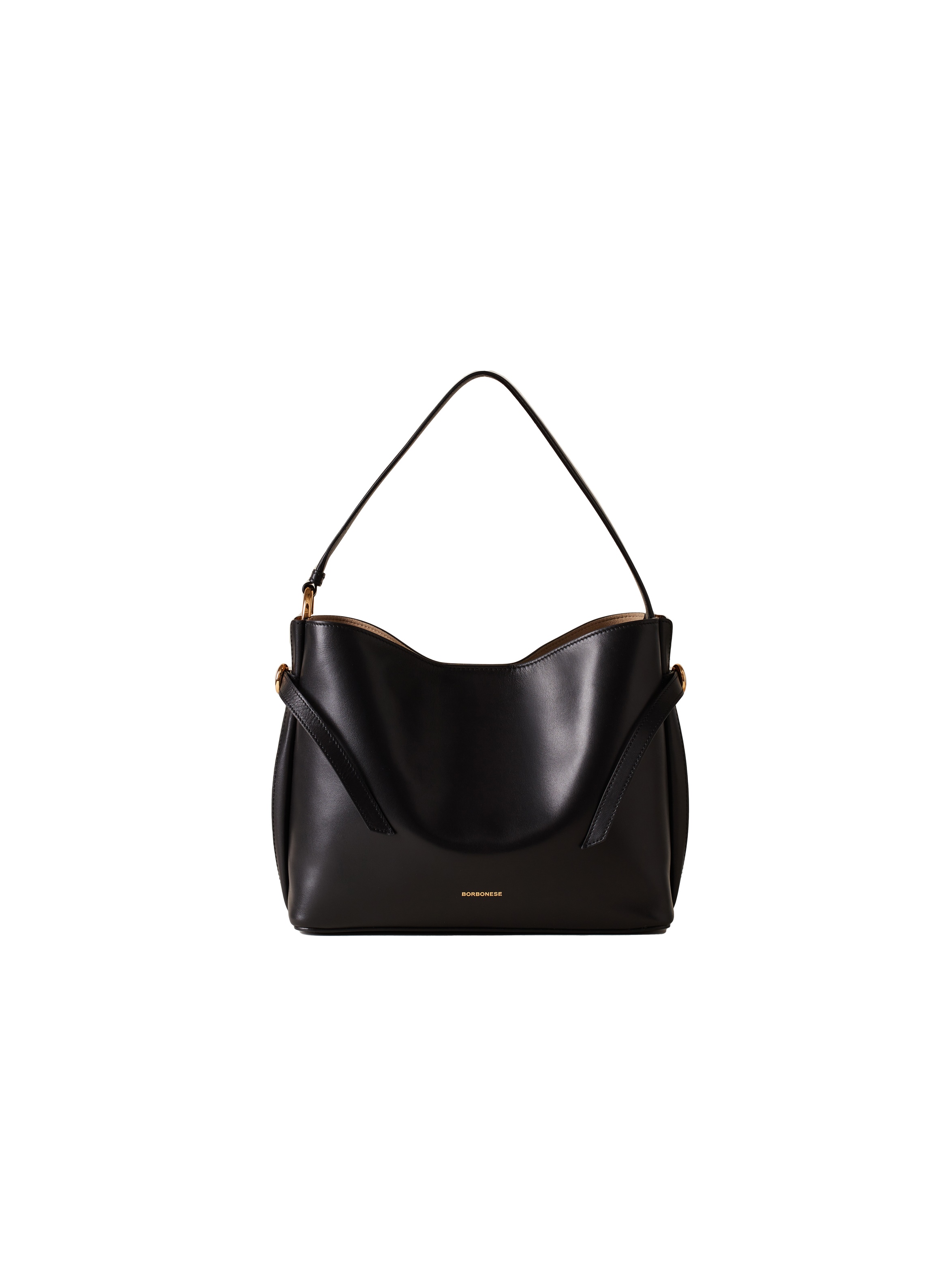 Borsa a spalla in vitello nappato, con dettagli in camoscio Op, con fodera di tessuto effetto scamosciato, pouch interna in fodera di tessuto effetto scamosciato, chiusa con zip in metallo e removibile con bottoni a pressione, chiusura centrale con magnete, metallerie oro e doppi manici per doppia portabilità. Per un look elegante e raffinato. BORBONESE