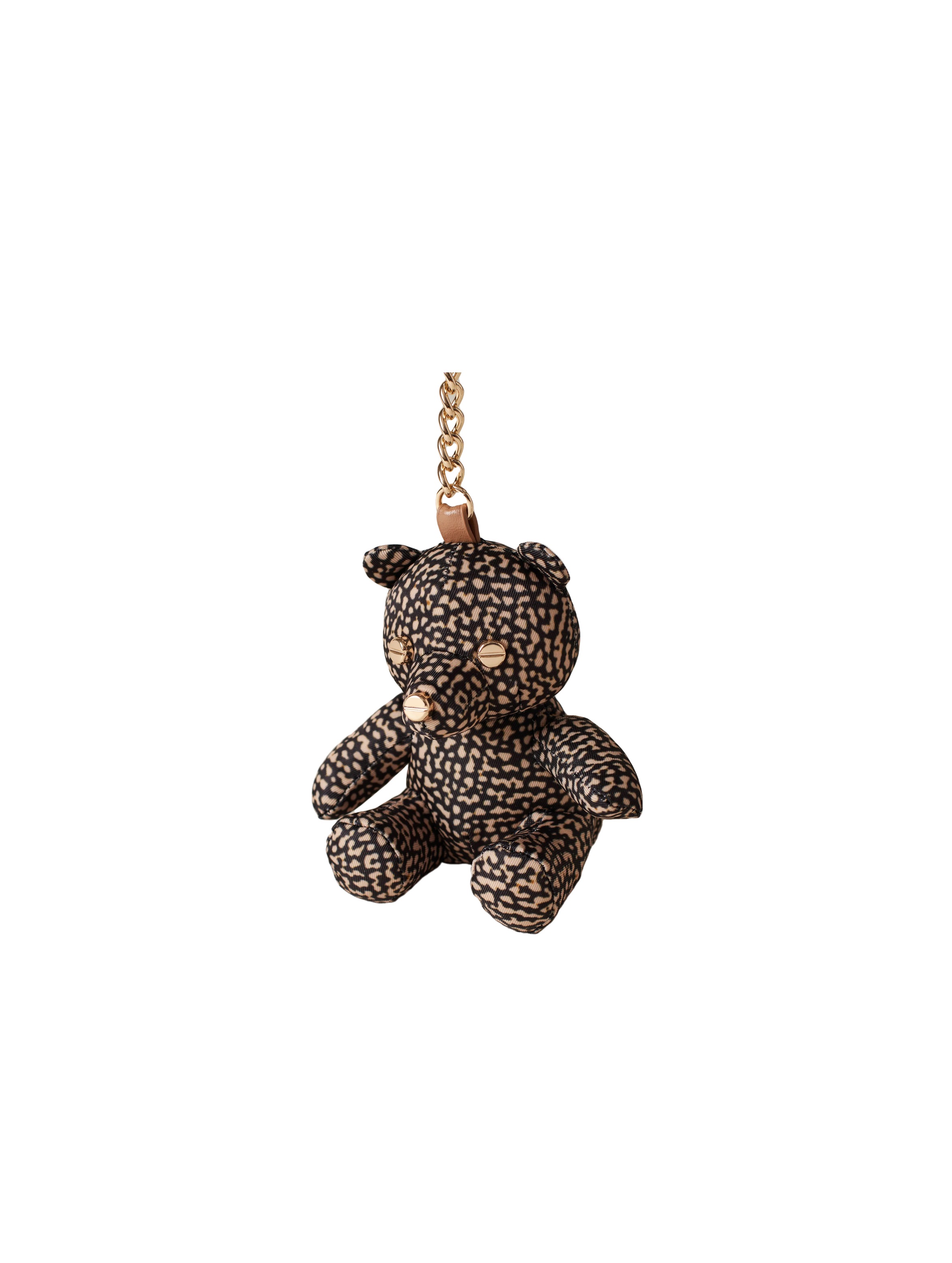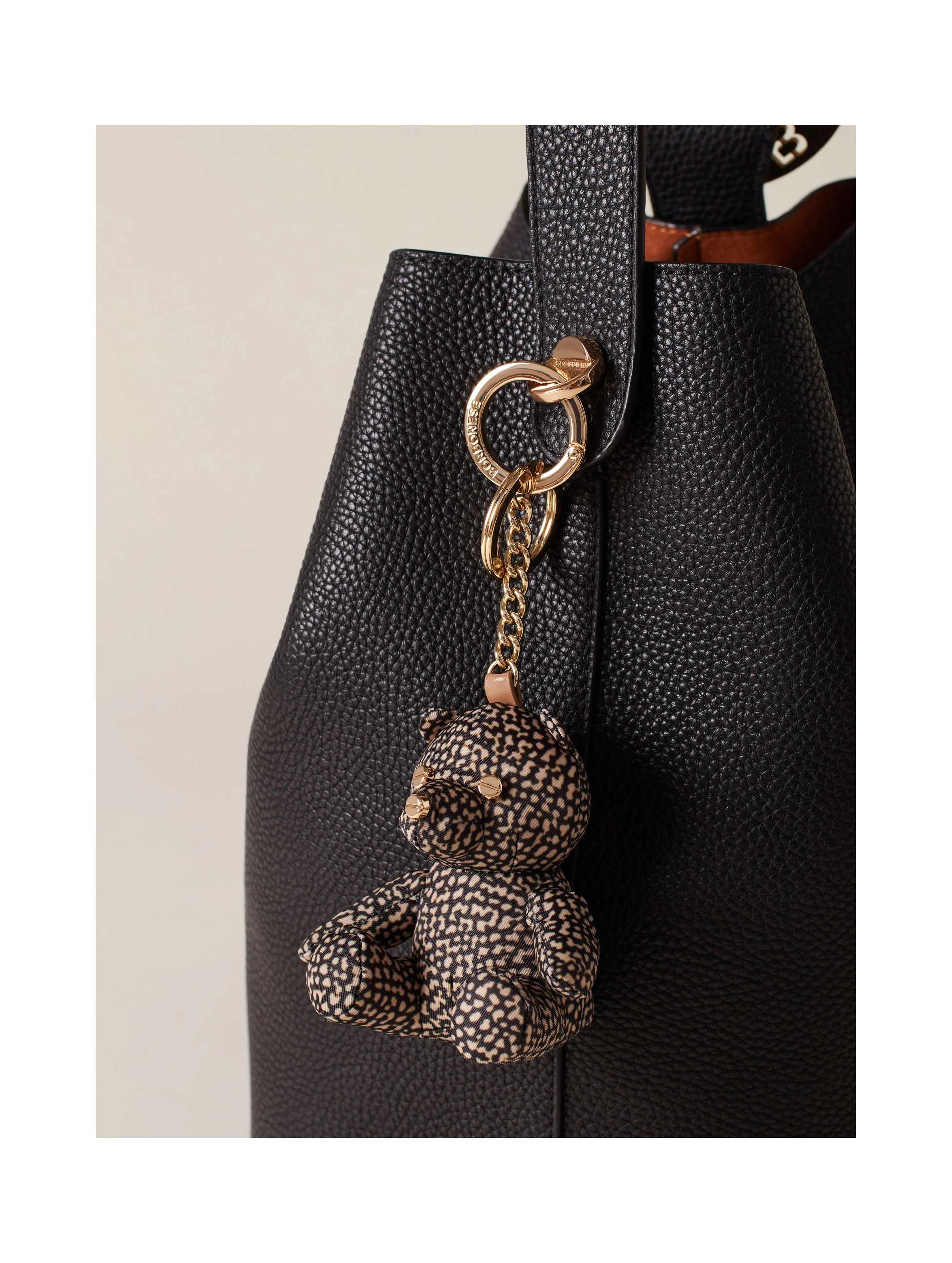 Portachiavi a forma di orsetto, realizzato in tessuto riciclato OP, con dettagli in pelle, impreziosito da piccole viti decorative, con anello portachiavi con catenella e metallerie oro chiaro. Un accessorio fashion e chic. BORBONESE