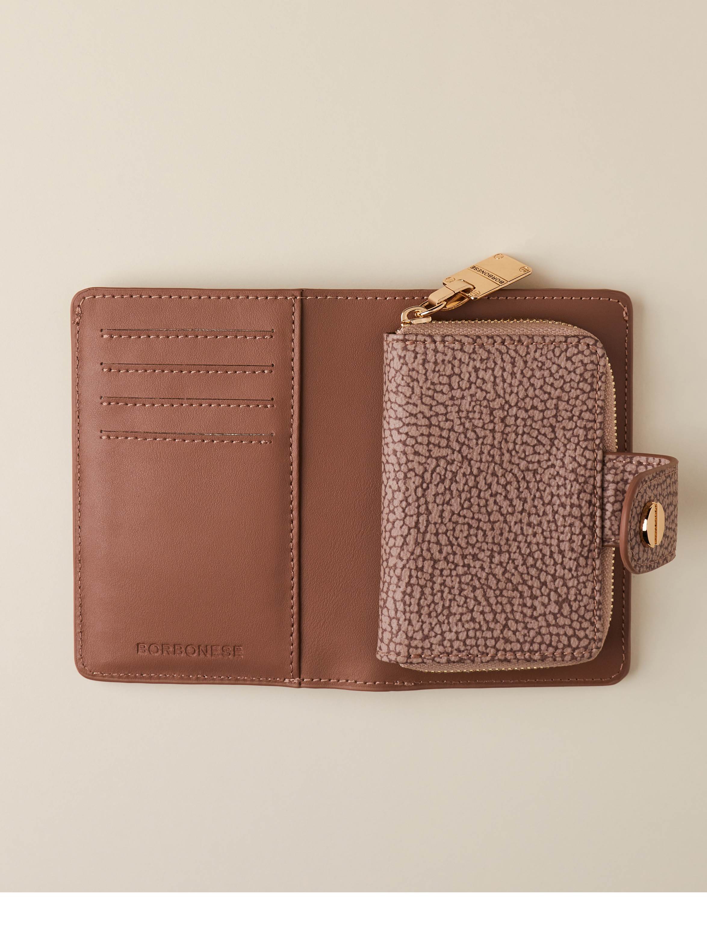 Portafogli in tela stampa Op, con chiusura con bottone a pressione, scomparto per le monete con chiusura su tre lati regolata da zip, tirazip piastrina personalizzata in metallo, con scomparto per i contanti, scomparto portatessere, interno foderato in tessuto jacquard, tasca esterna aperta in pelle, dettagli in pelle e metallerie oro chiaro. Trendy e funzionale. BORBONESE