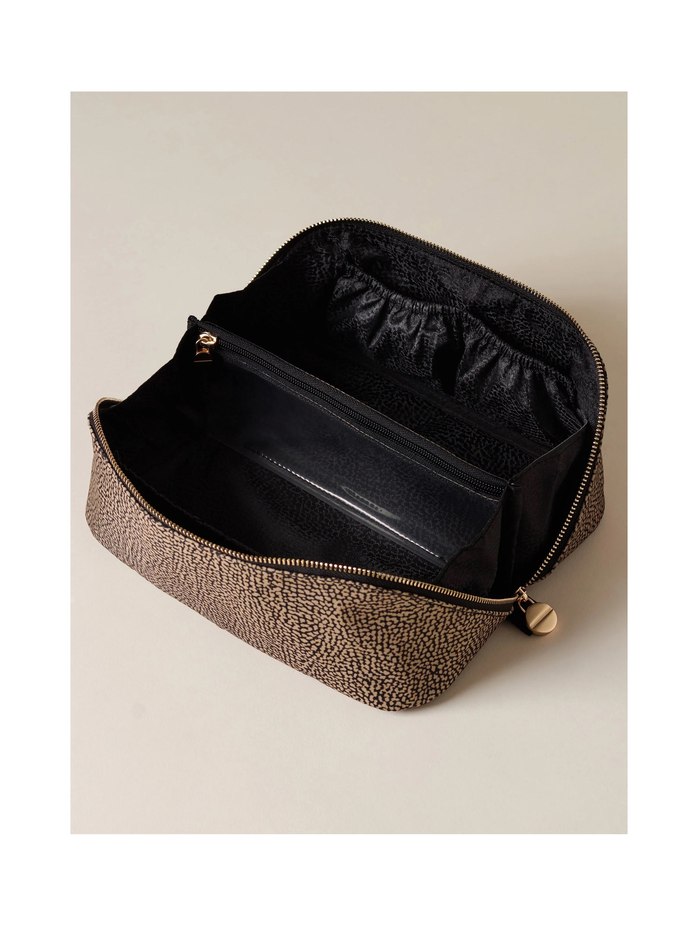 Beauty case realizzato in tessuto riciclato con stampa OP, con dettagli in pelle di vitello, con fodera in tessuto jacquard riciclato, chiusura con zip in metallo e tirazip a vite logata, tre tasche interne aperte, ulteriore tasca interna in TPU trasparente chiusa con zip con tirazip vite e metallerie oro chiaro. Perfetto per riporre tutto il necessario in uno stile unico e raffinato. BORBONESE