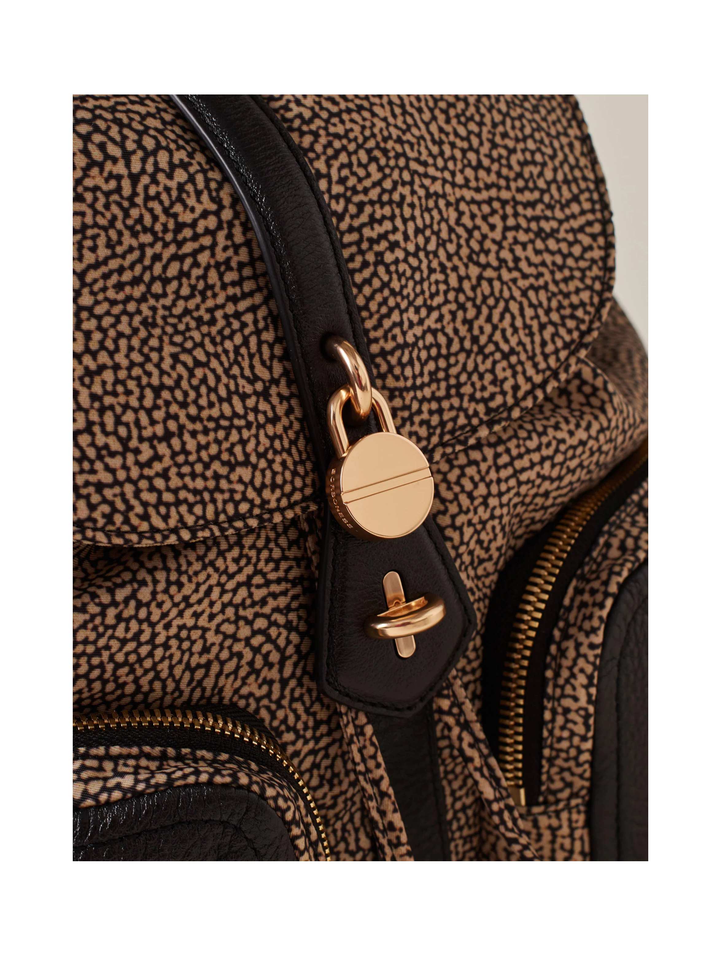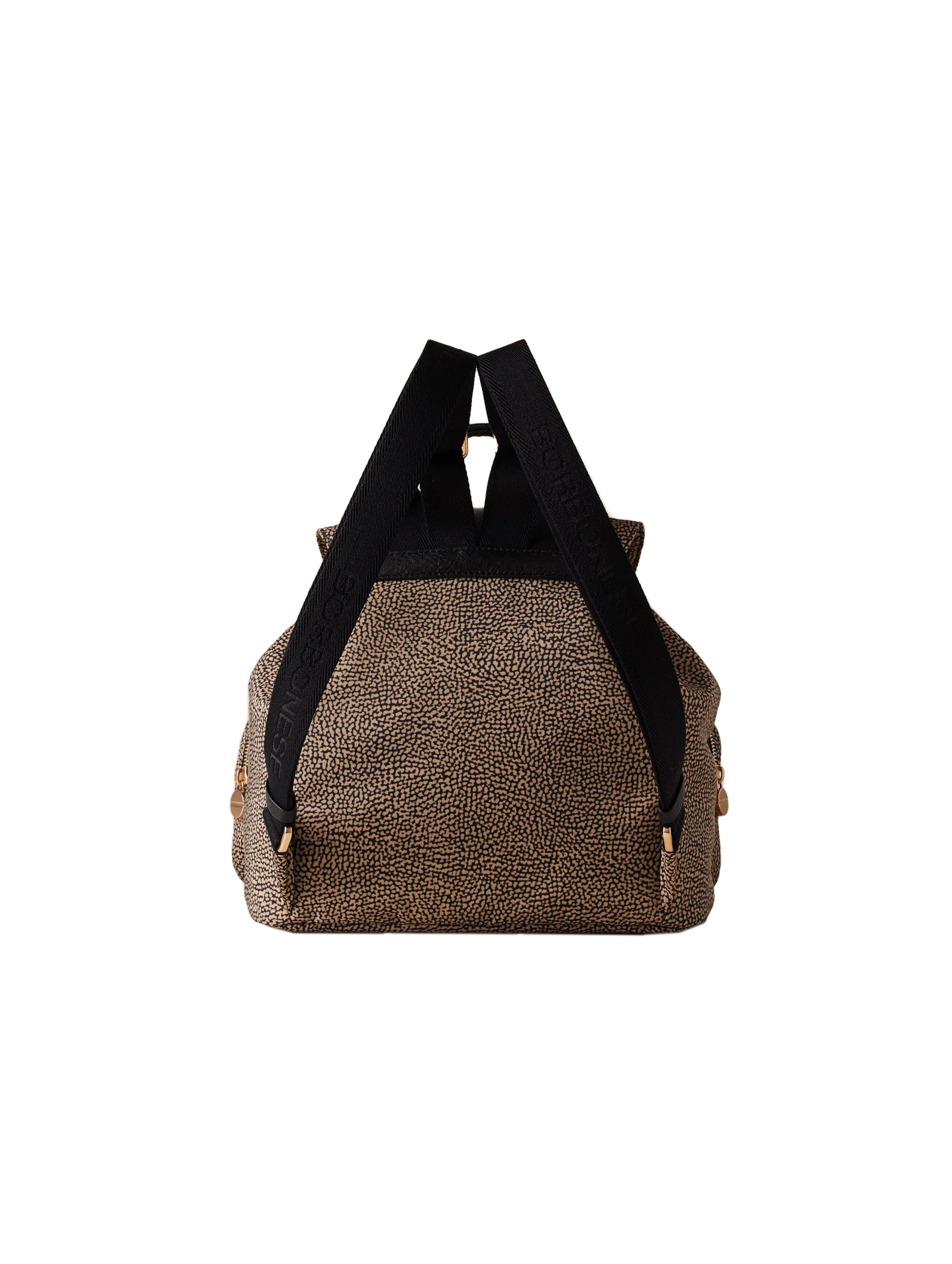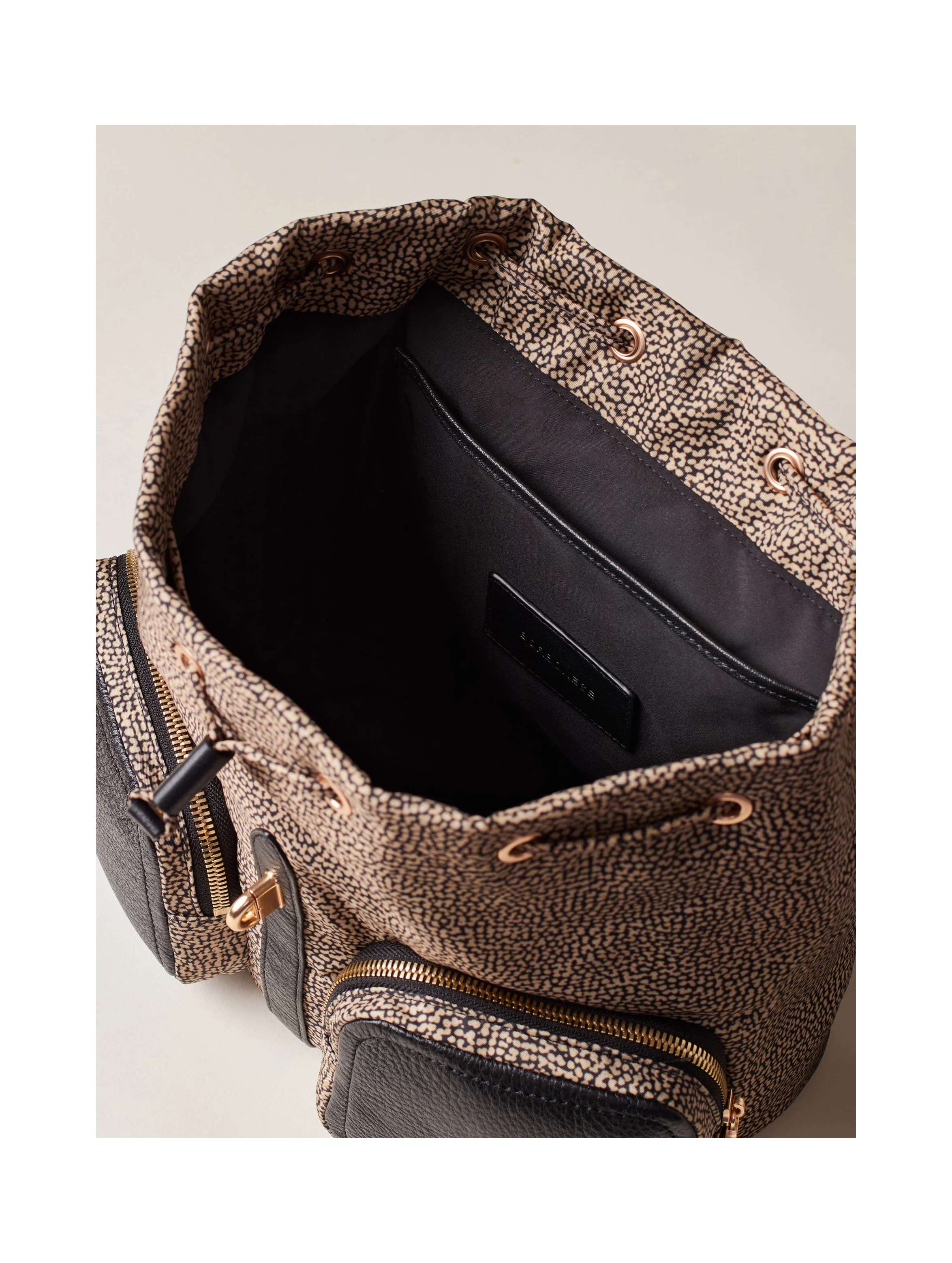 Zaino realizzato in tessuto riciclato OP, con dettagli in pelle di vitello bottalato, con fodera in tessuto, doppia chiusura, a coulisse e con girello, linguetta in vitello con ponticello e lucchetto tondo a vite logato, due tasche frontali chiuse con zip metallo e tirazip a vite, tasca interna aperta, spallacci in nastro logato regolabili con fibbia autobloccante e metallerie oro chiaro opaco. Per un look trendy e fashion. BORBONESE