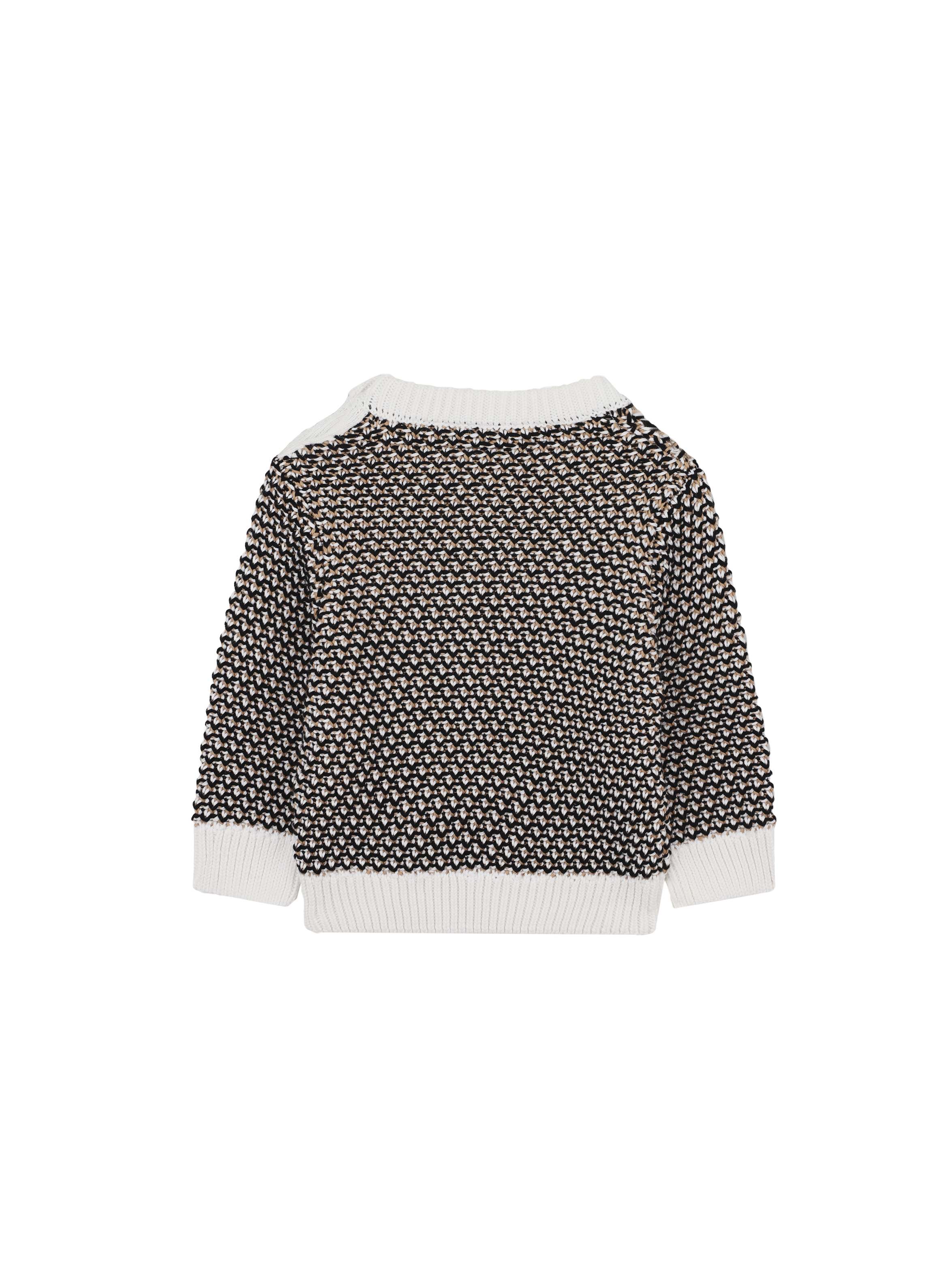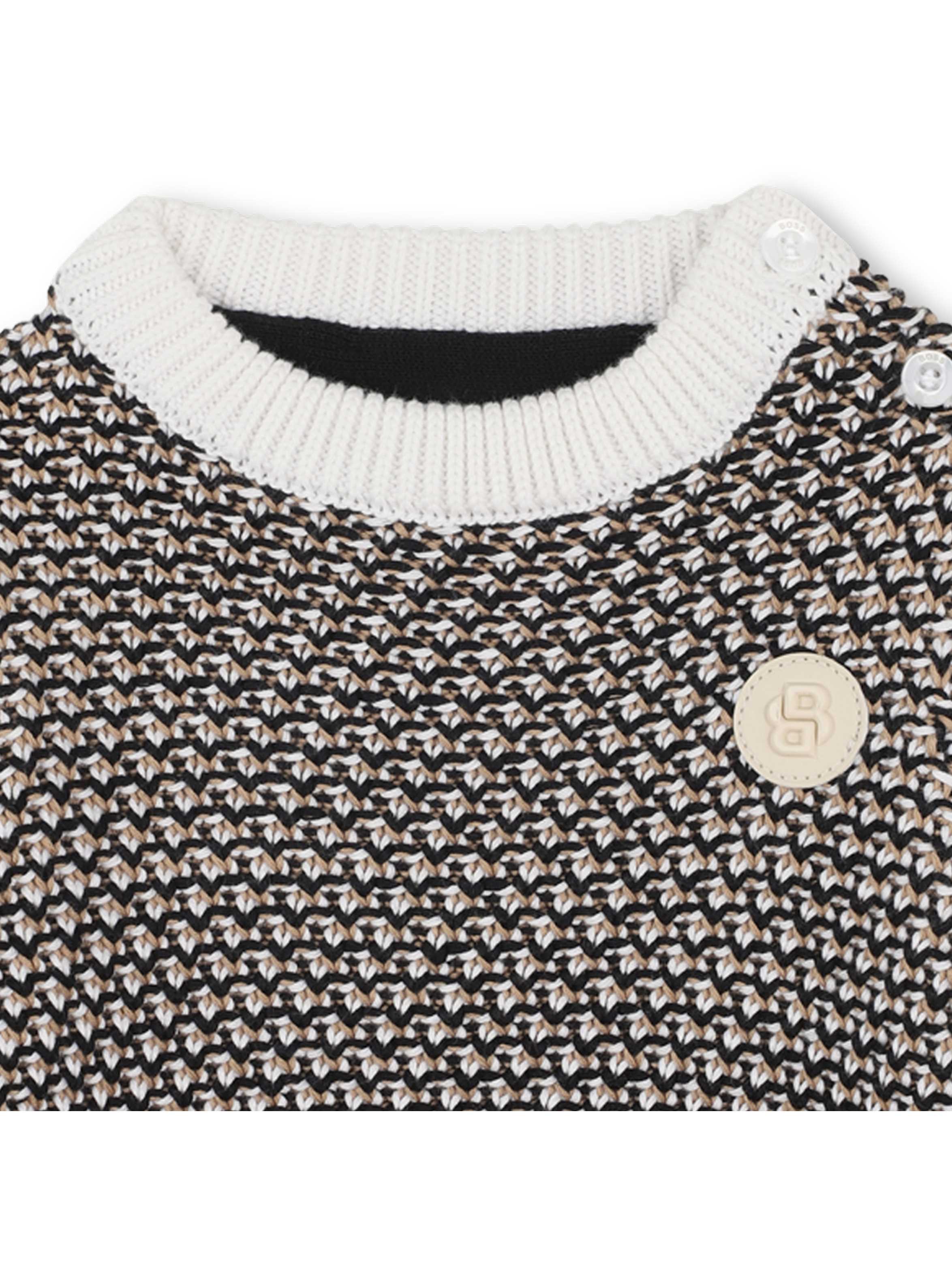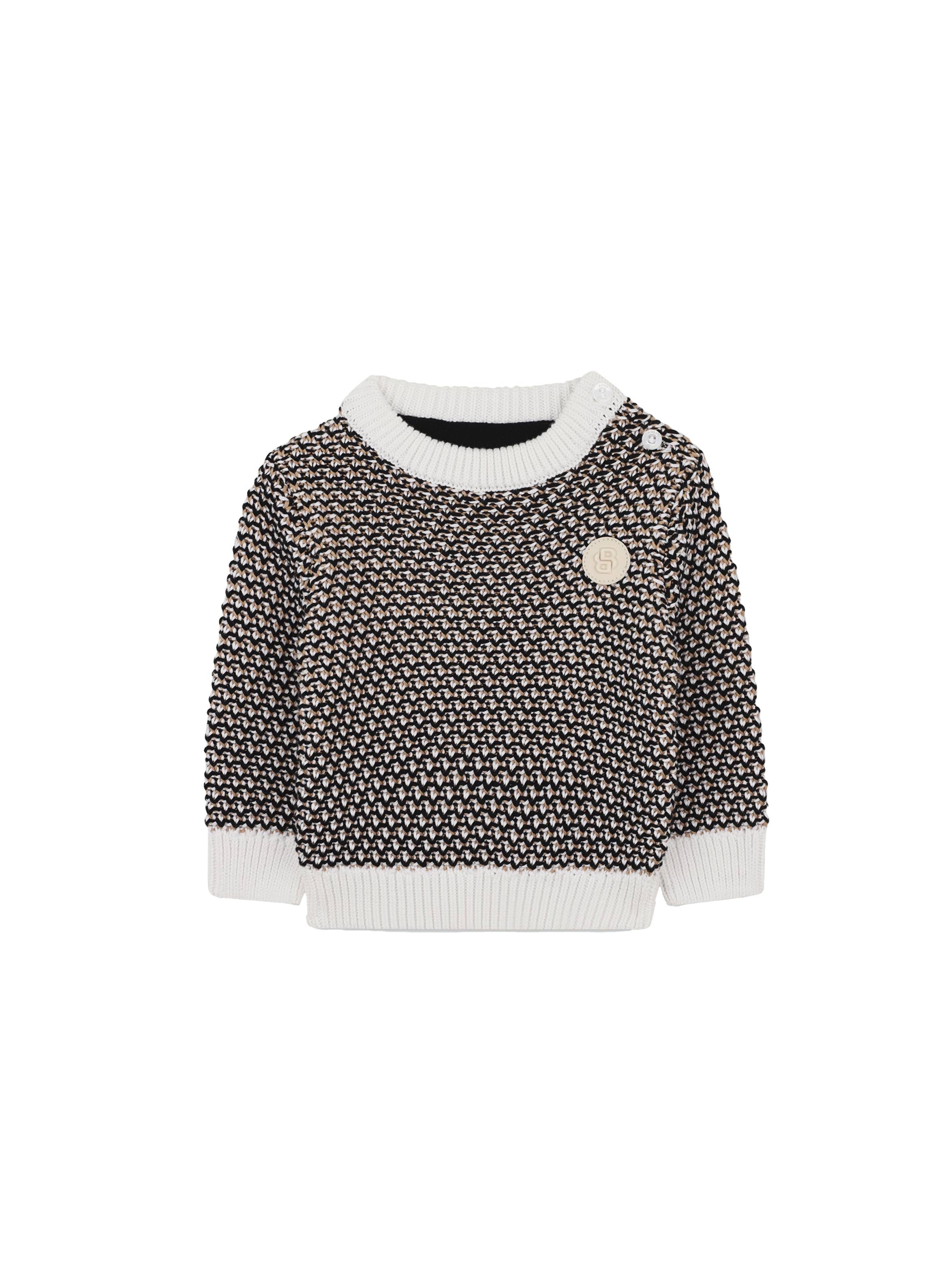 Maglia tricot a maniche lunghe, con scollo rotondo, a fantasia, con apertura con bottoni sulla spalla, bordi e polsini a tinta unita a costine e patch con logo B applicato sul petto. Per un look trendy e casual. BOSS