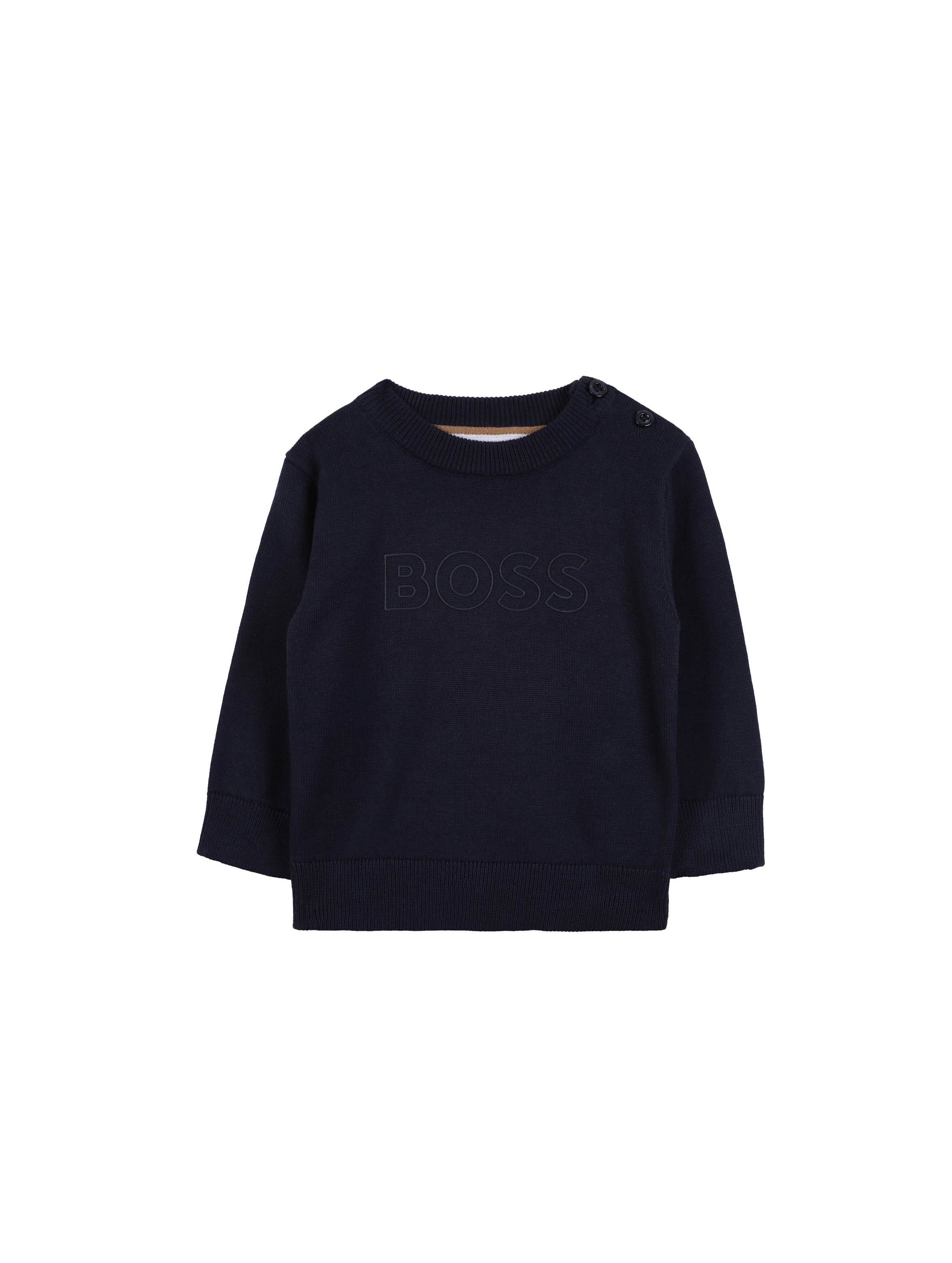 Maglia tricot a maniche lunghe, con scollo rotondo, a tinta unita, con apertura con bottoni sulla spalla, bordi e polsini a costine e maxi logo lettering con profili ricamati a contrasto sul davanti. Per un look trendy e casual. BOSS