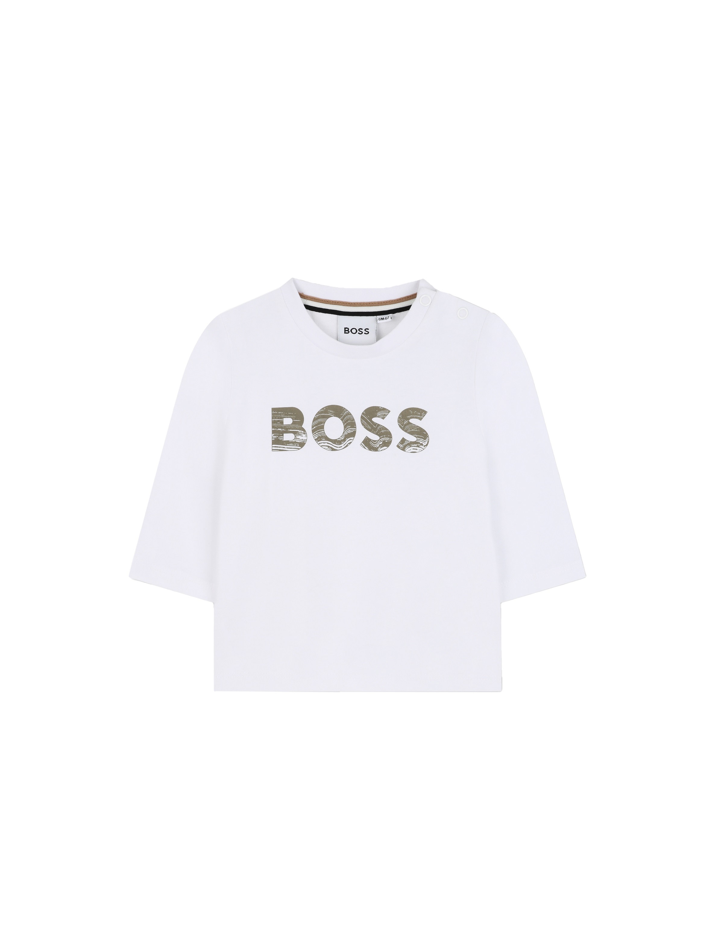 T-shirt a maniche lunghe, con scollo rotondo, a tinta unita, con apertura con bottoni automatici sulla spalla e maxi logo lettering a contrasto sul davanti. Per un look basic e casual. BOSS