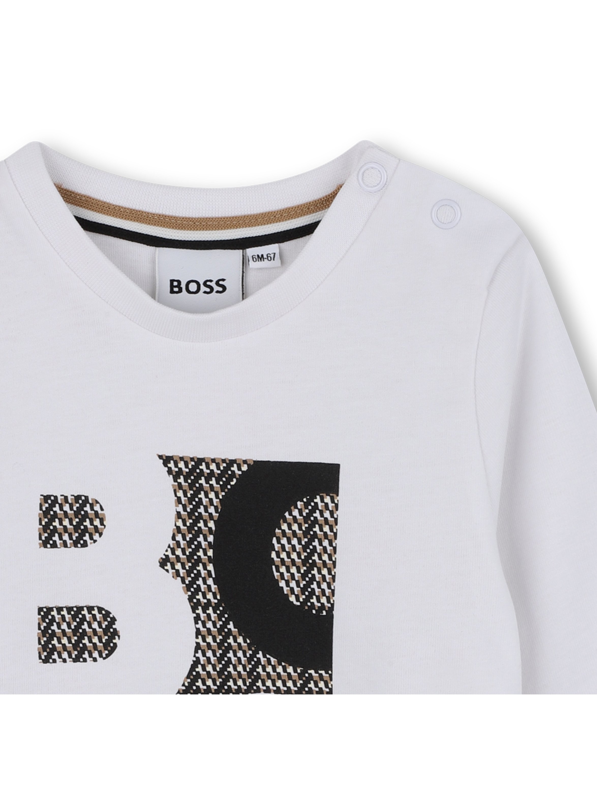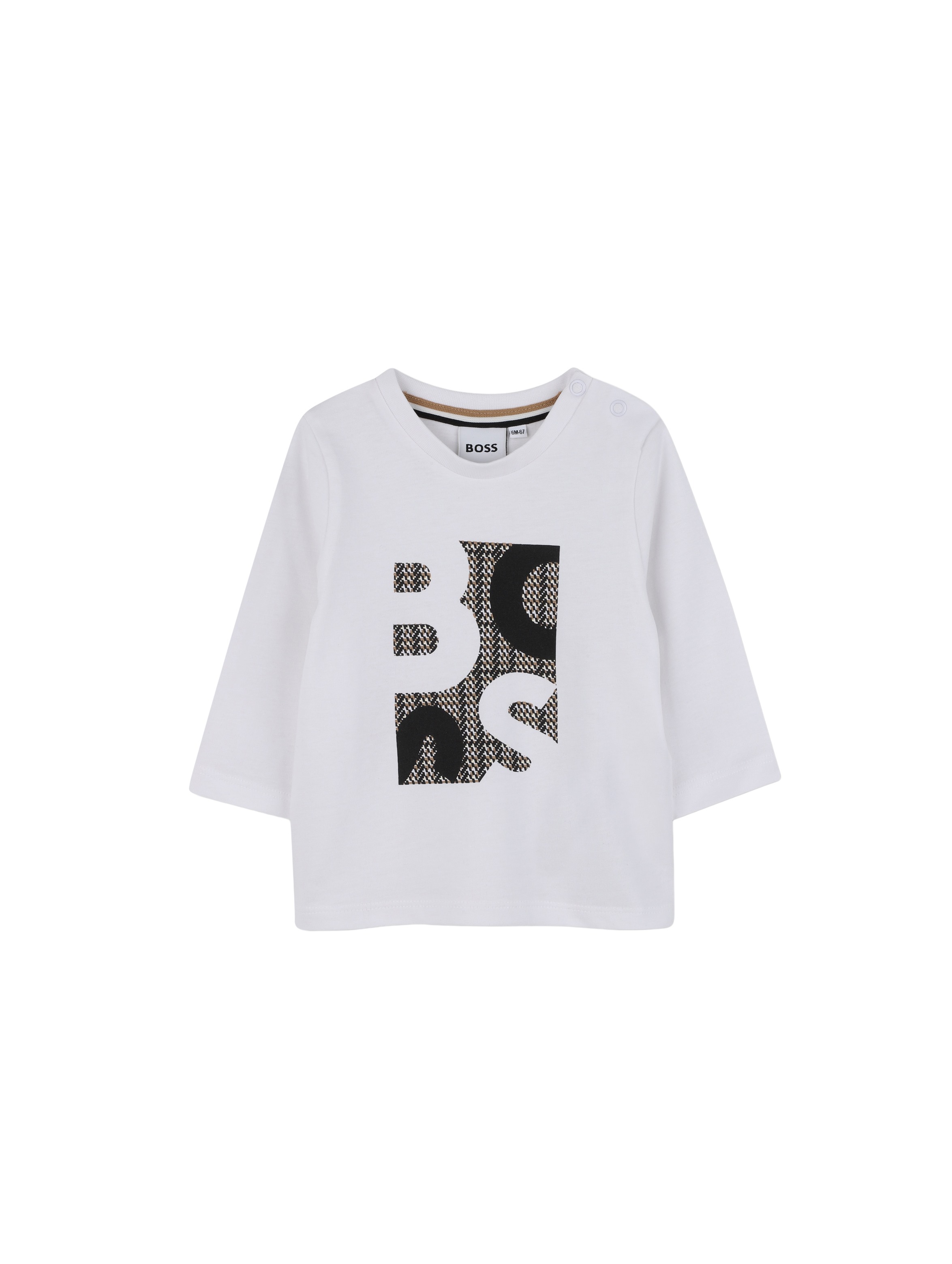 T-shirt a maniche lunghe, con scollo rotondo, a tinta unita, con apertura con bottoni automatici sulla spalla e maxi logo lettering con grafica multicolor sul davanti. Per un look basic e casual. BOSS
