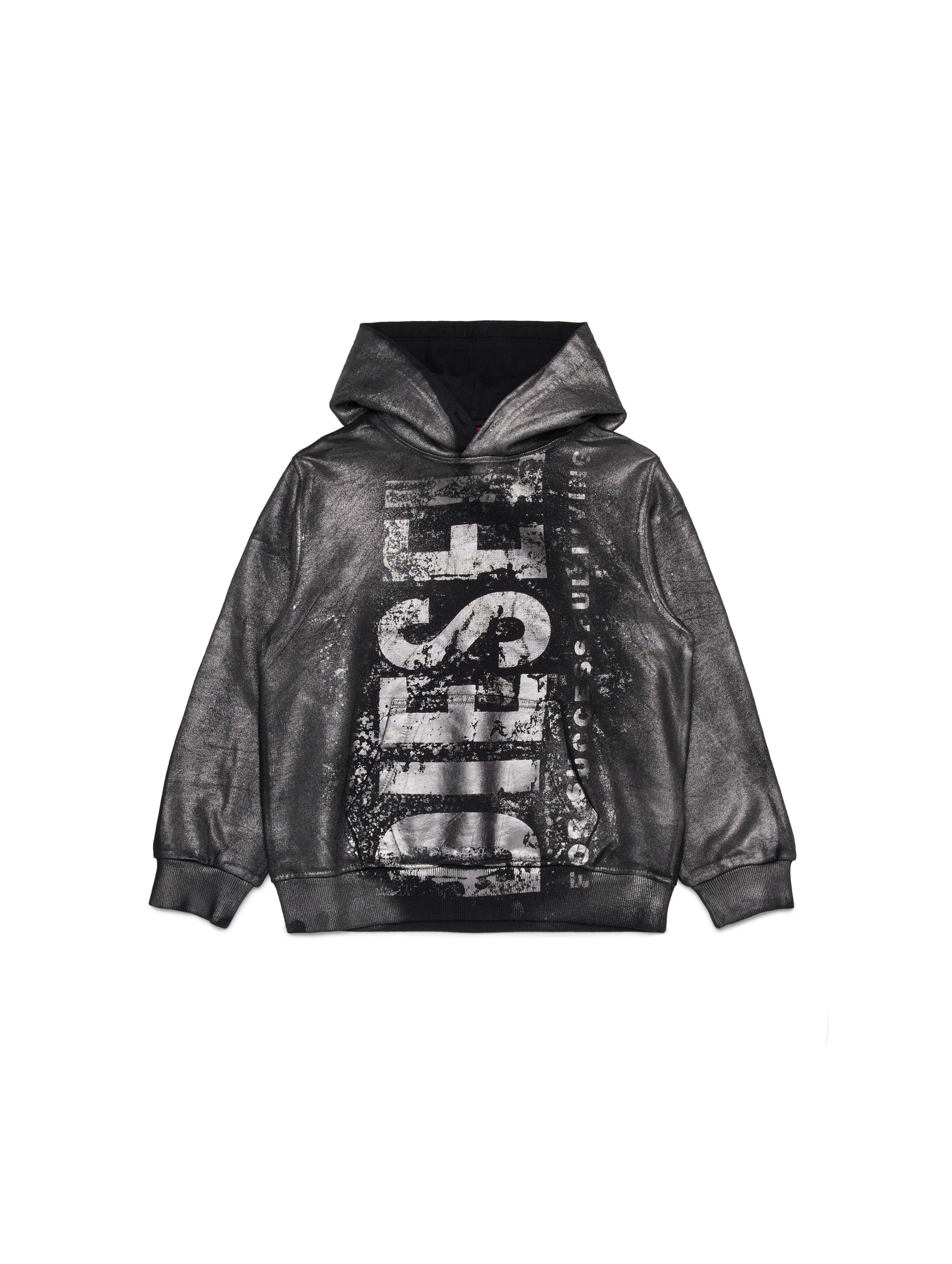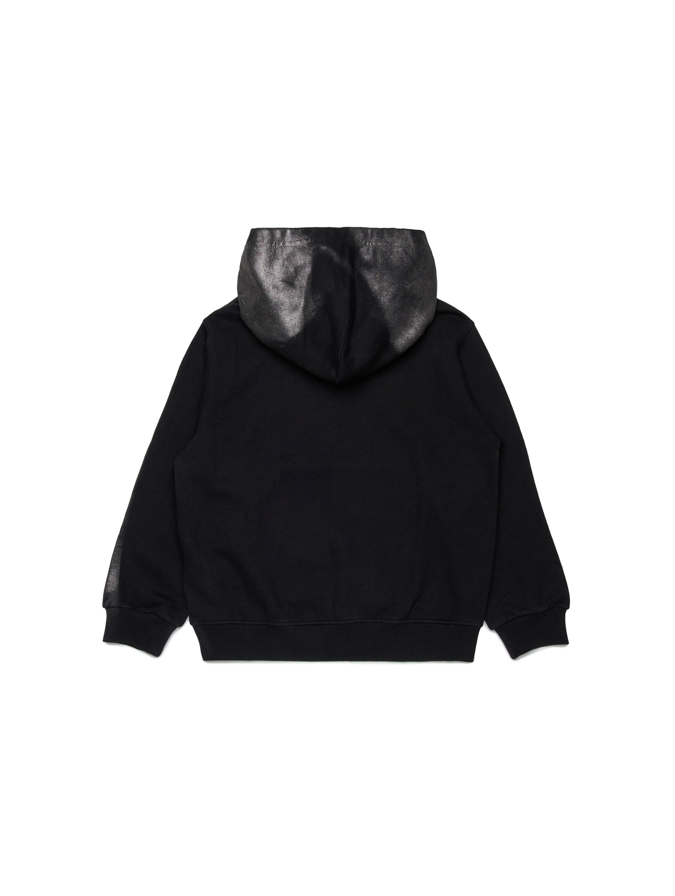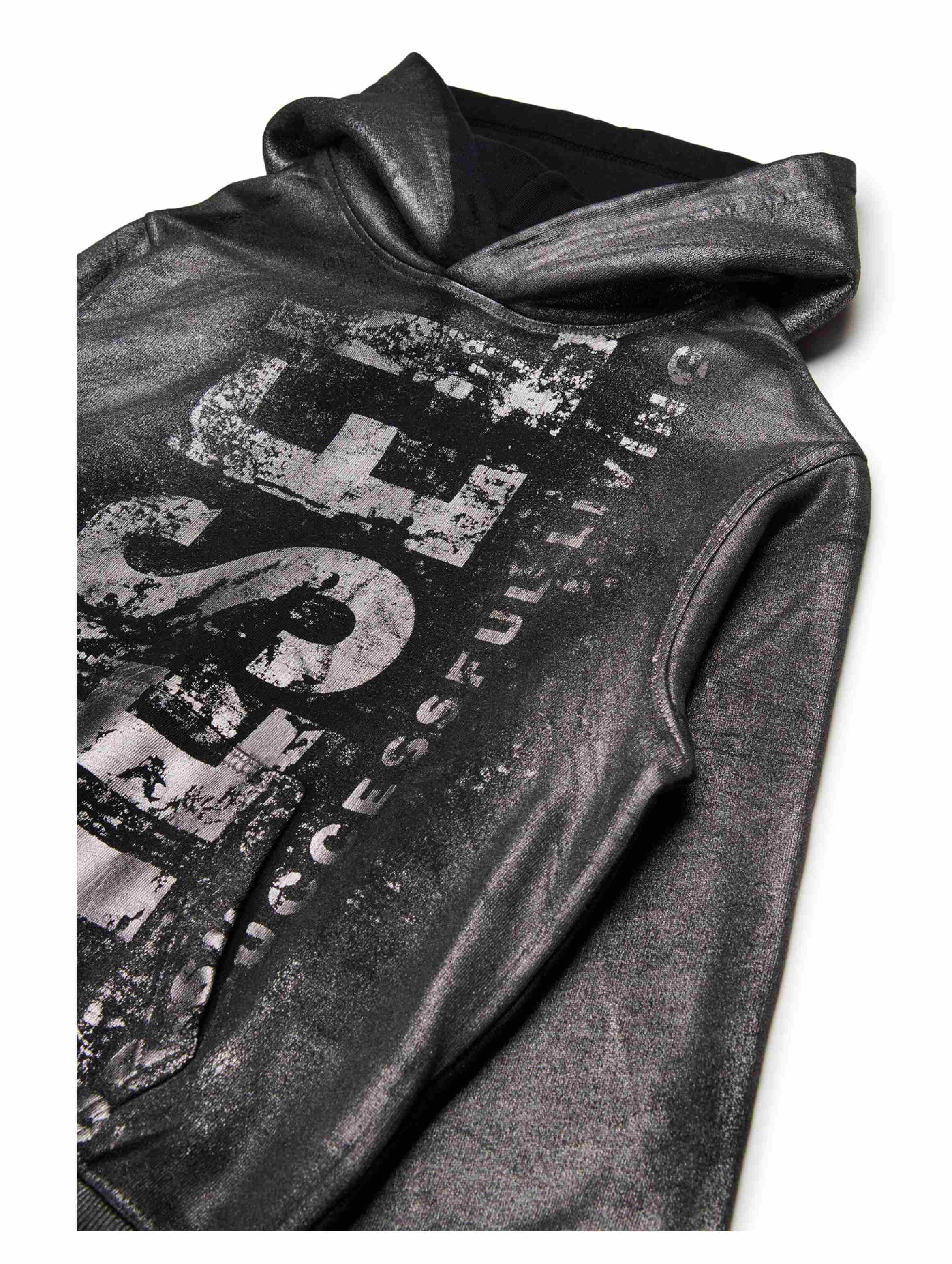 Felpa a maniche lunghe, con cappuccio, con scollo rotondo, bordi e polsini a costine, dalla vestibilità comoda, con tasca a patta sul davanti, con tinta con sfumature effetto metallico sul davanti e sul cappuccio e con maxi logo lettering stampato con grafica d'impatto a contrasto sul davanti. Per un look trendy e cool. DIESEL