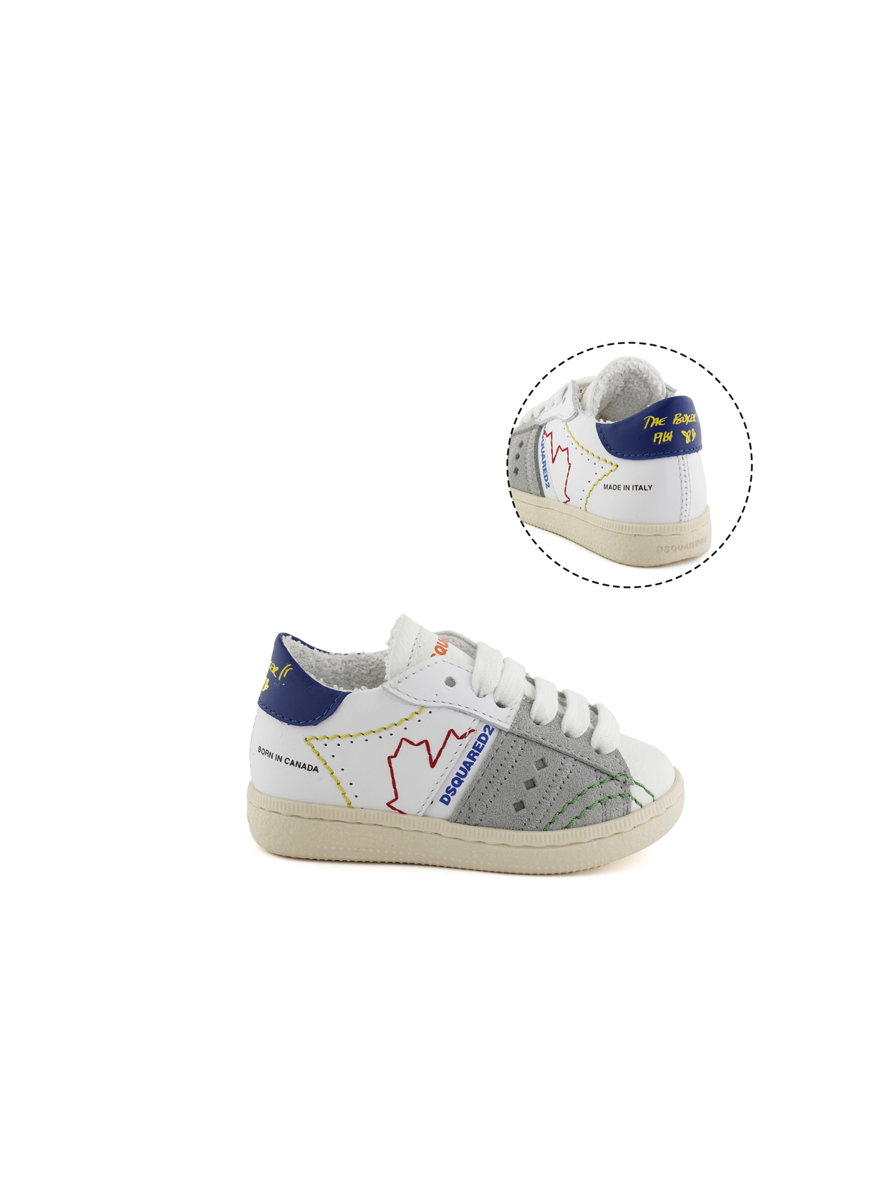 Sneakers a caviglia bassa in pelle e suede, con chiusura a lacci piatti, suola in gomma, inserti in contrasto di colore, linguetta logata, gambetto con stampa slogan, dettagli per la ventilazione sul lato esterno e logo con dettaglio foglia sul lato esterno. Per un look casual e trendy. DSQUARED2