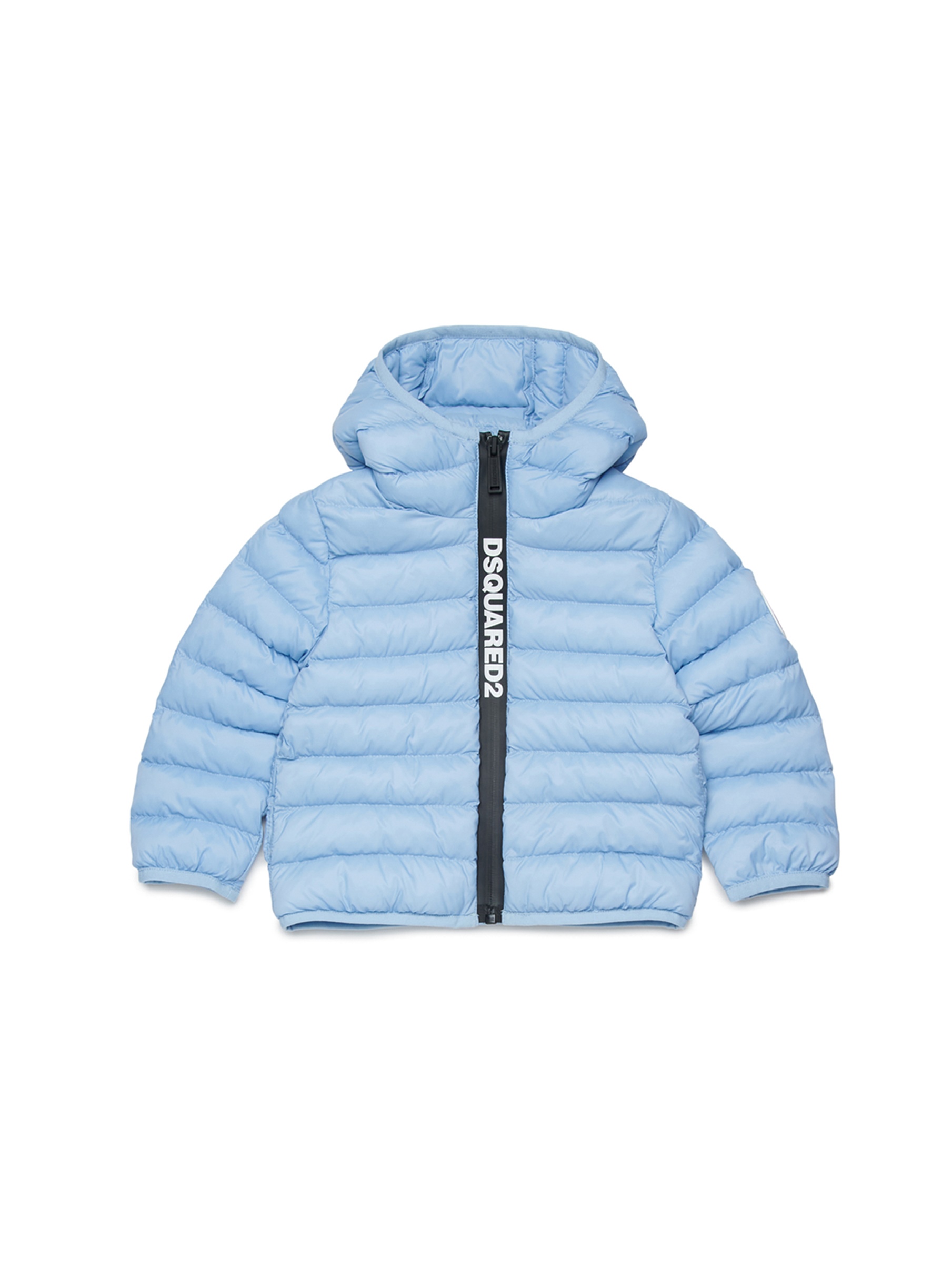 Giubbino imbottito, a tinta unita, con trama trapuntata a righe orizzontali, con cappuccio, chiusura centrale con cerniera a contrasto logata, polsini elastici e patch con logo sulla manica. Per un look trendy. DSQUARED2