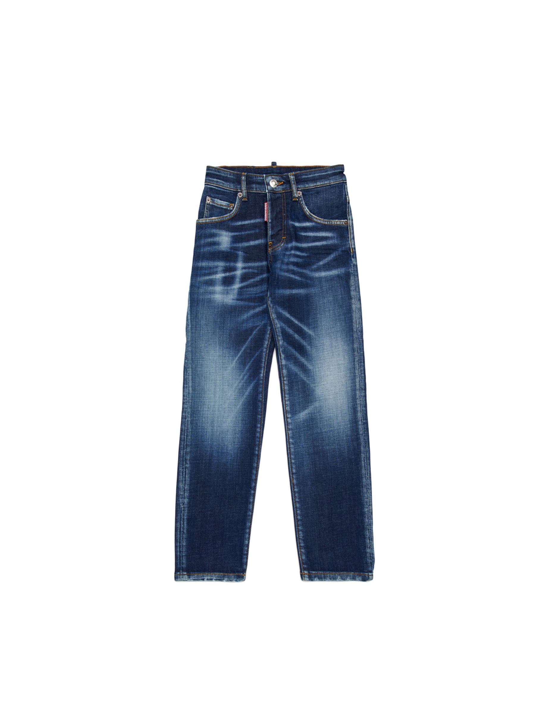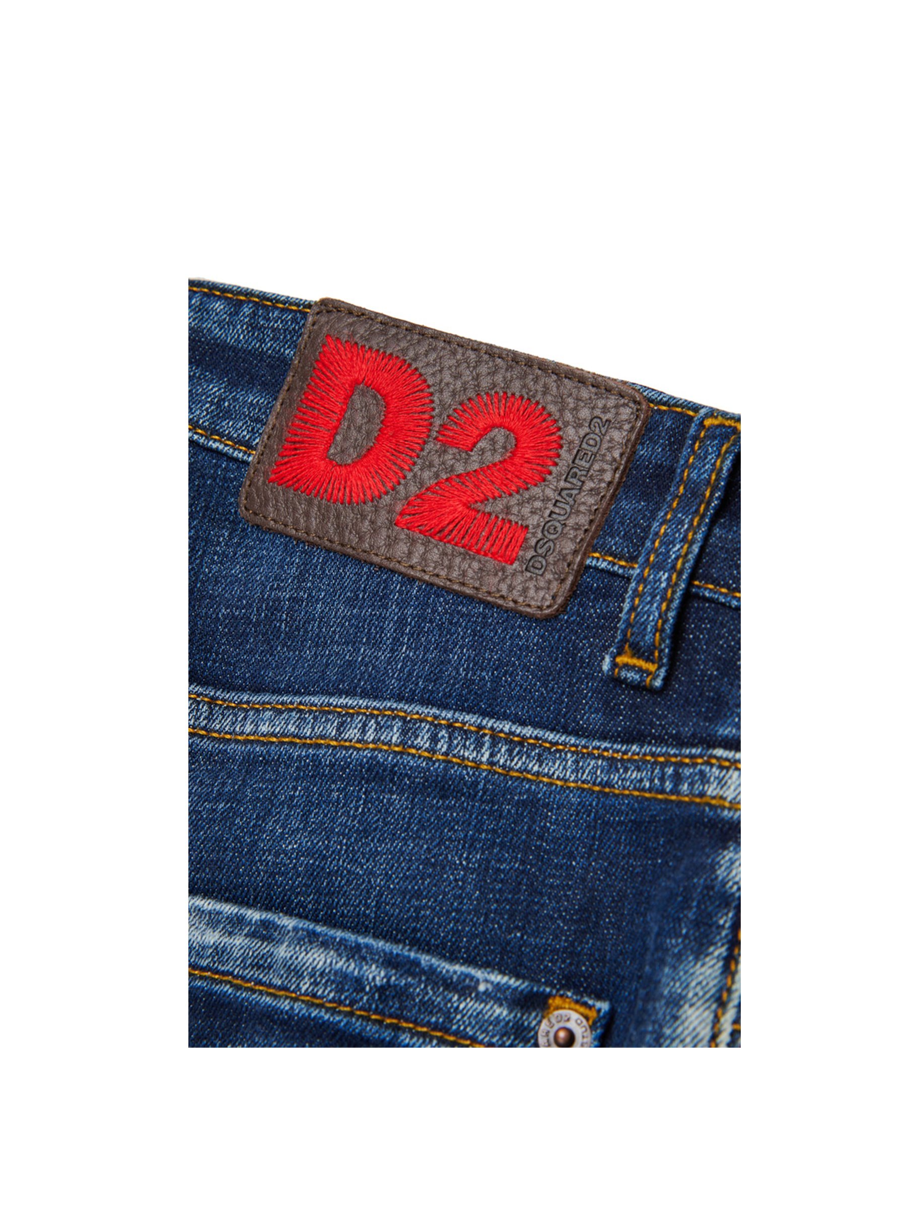 Jeans lungo, a lavaggio blu medio-scuro, effetto used e patch logo a contrasto. Stay cool. DSQUARED2