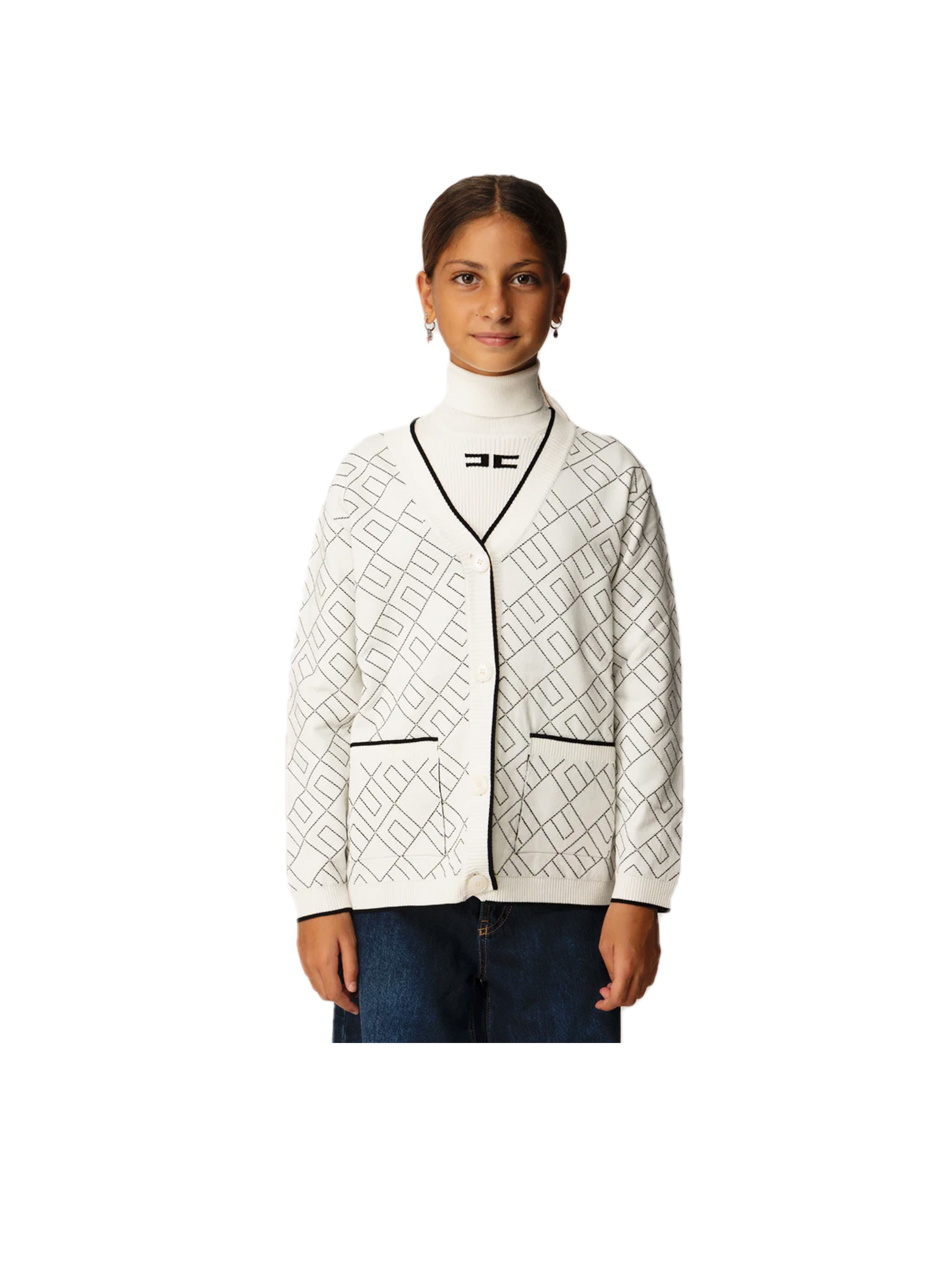 Cardigan in tricot a maniche lunghe, con scollo a V, apertura con bottoni centrali, bordi e polsini a costine, profili a contrasto, tasche a toppa con profili a contrasto applicate sul davanti e logo jacquard a contrasto all over. Per un look raffinato e trendy. ELISABETTA FRANCHI
