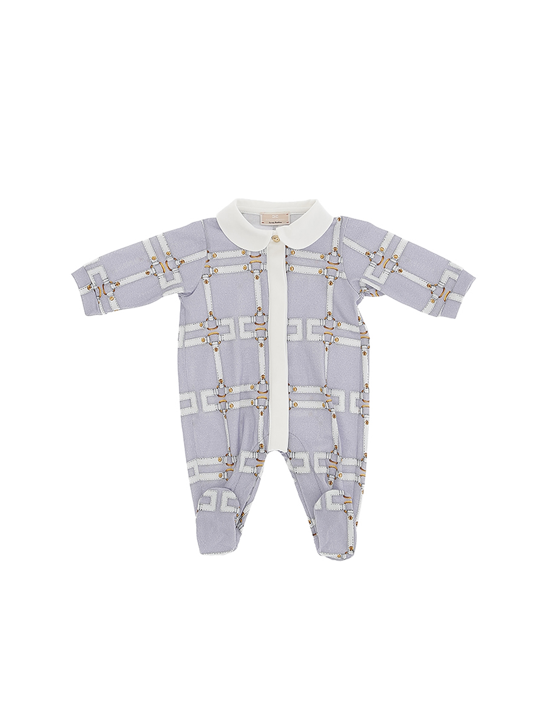 Tutina in confortevole jersey, con maniche lunghe, con colletto rotondo in contrasto di colore, con piedini, chiusura con bottoncini sul davanti nascosti da banda a tinta unita, polsini a fascia elastica e stampa di cinturini con doppia C all over. Per un look dolce e trendy. ELISABETTA FRANCHI