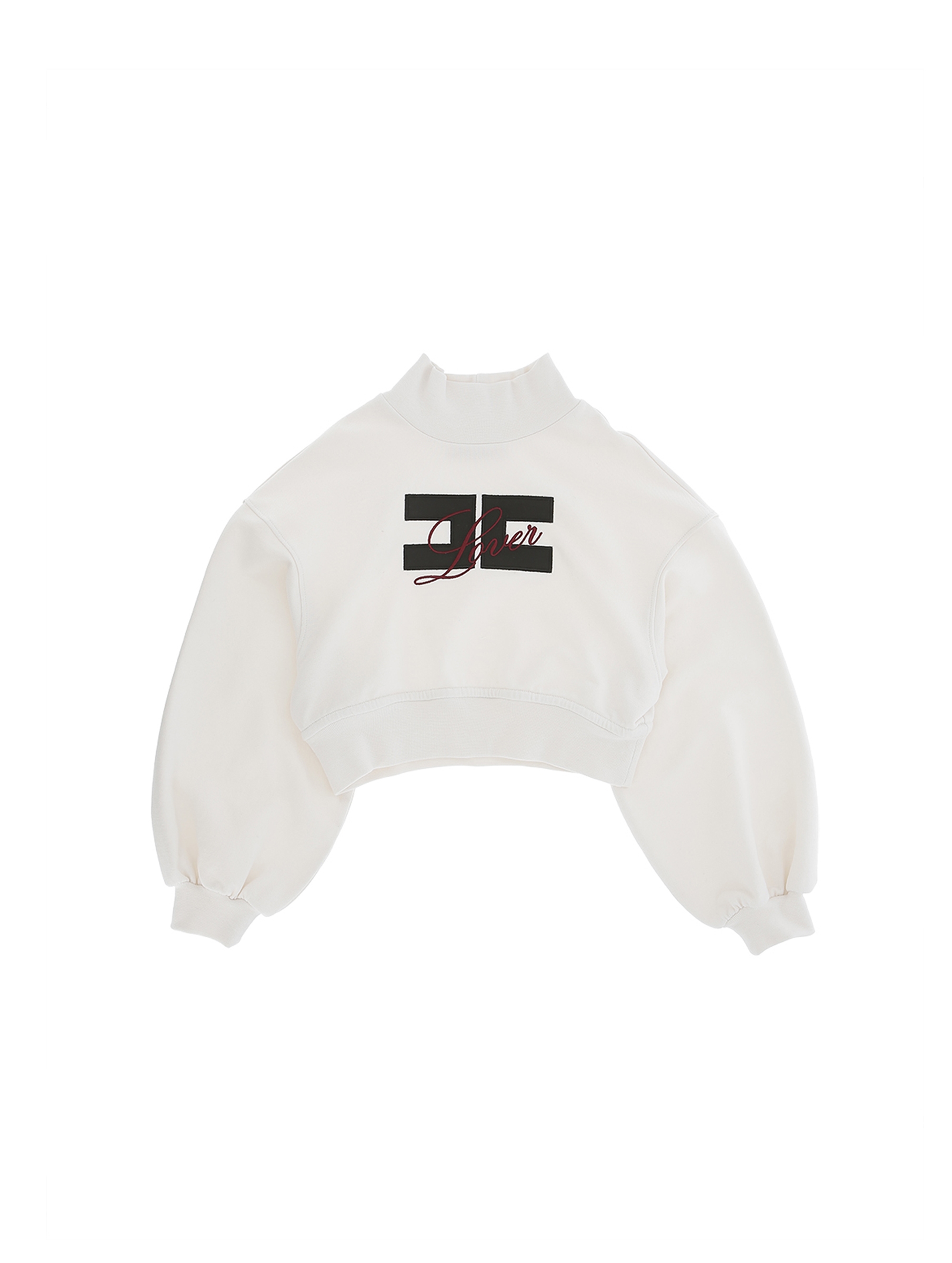 Felpa a maniche lunghe, modello cropped, a tinta unita, con collo alto, profili a costine, maniche a sbuffo e maxi monogramma del logo ricamato a contrasto con ricamo "lover" sul fronte. Per un look fashion e trendy. ELISABETTA FRANCHI
