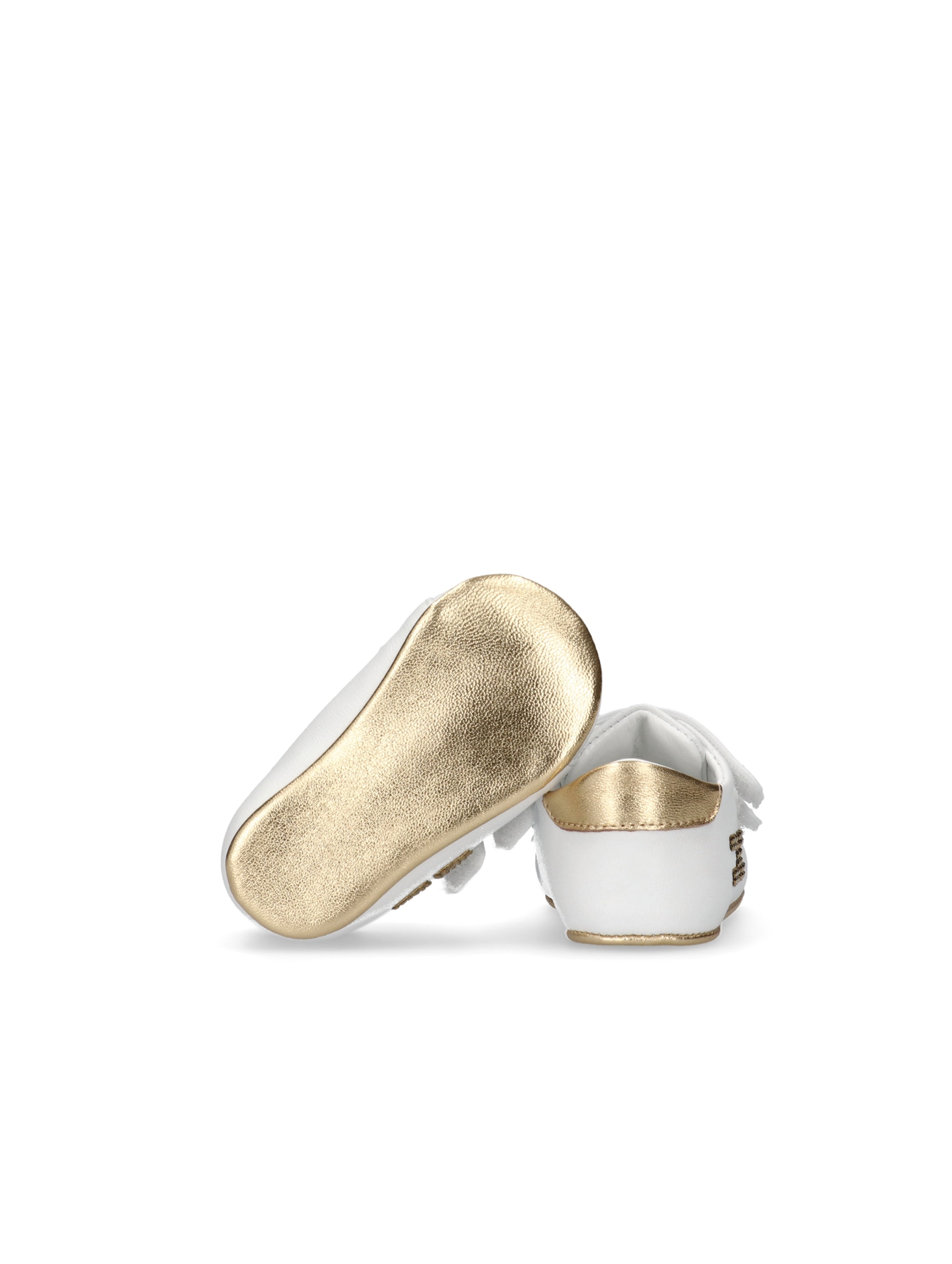 Sneakers a caviglia bassa da neonata, con gambetto a contrasto di colore, chiusura con doppia fascetta a strappo e monogramma del logo con strass gold sul lato esterno. Per un look casual e chic. ELISABETTA FRANCHI