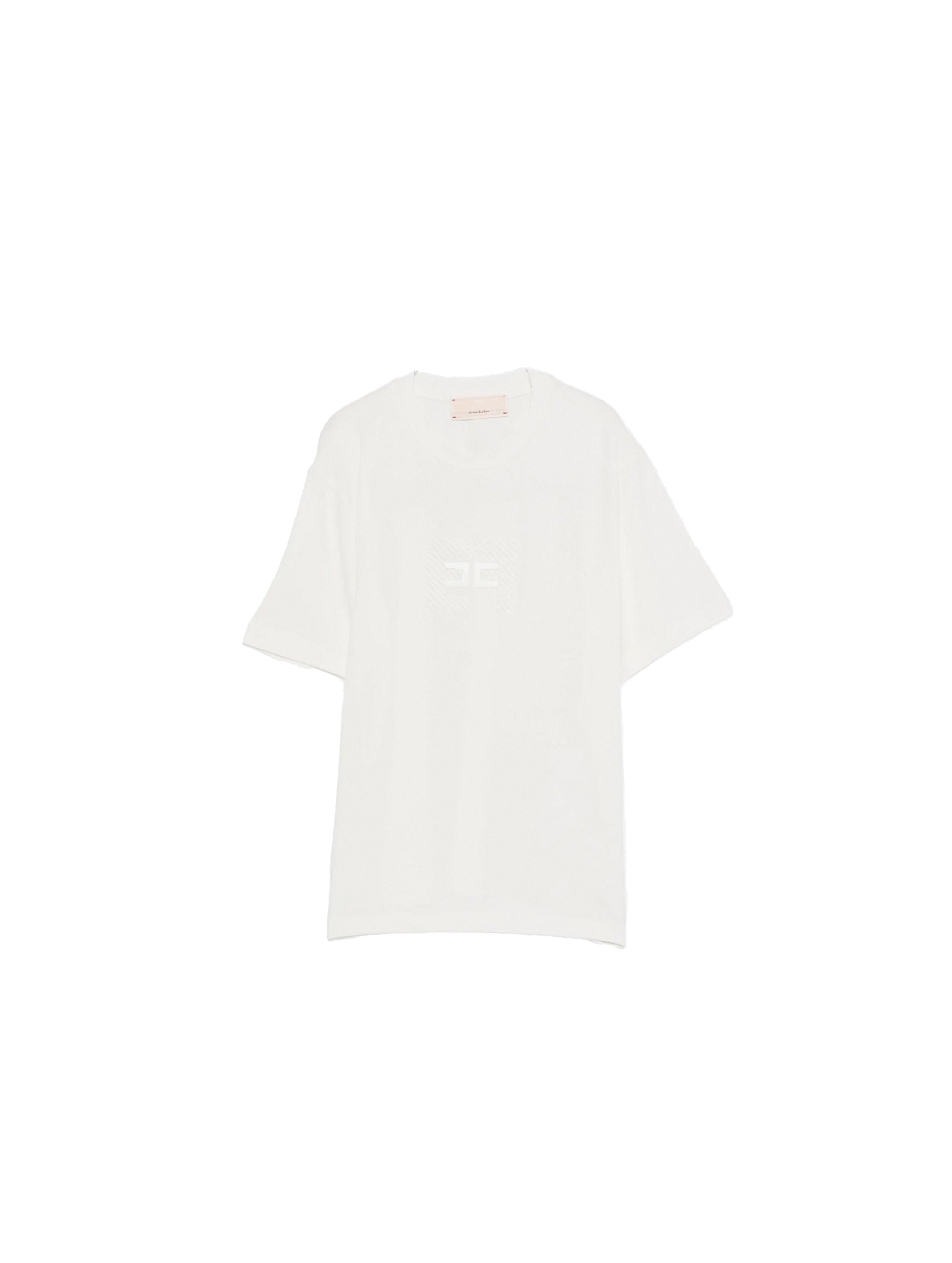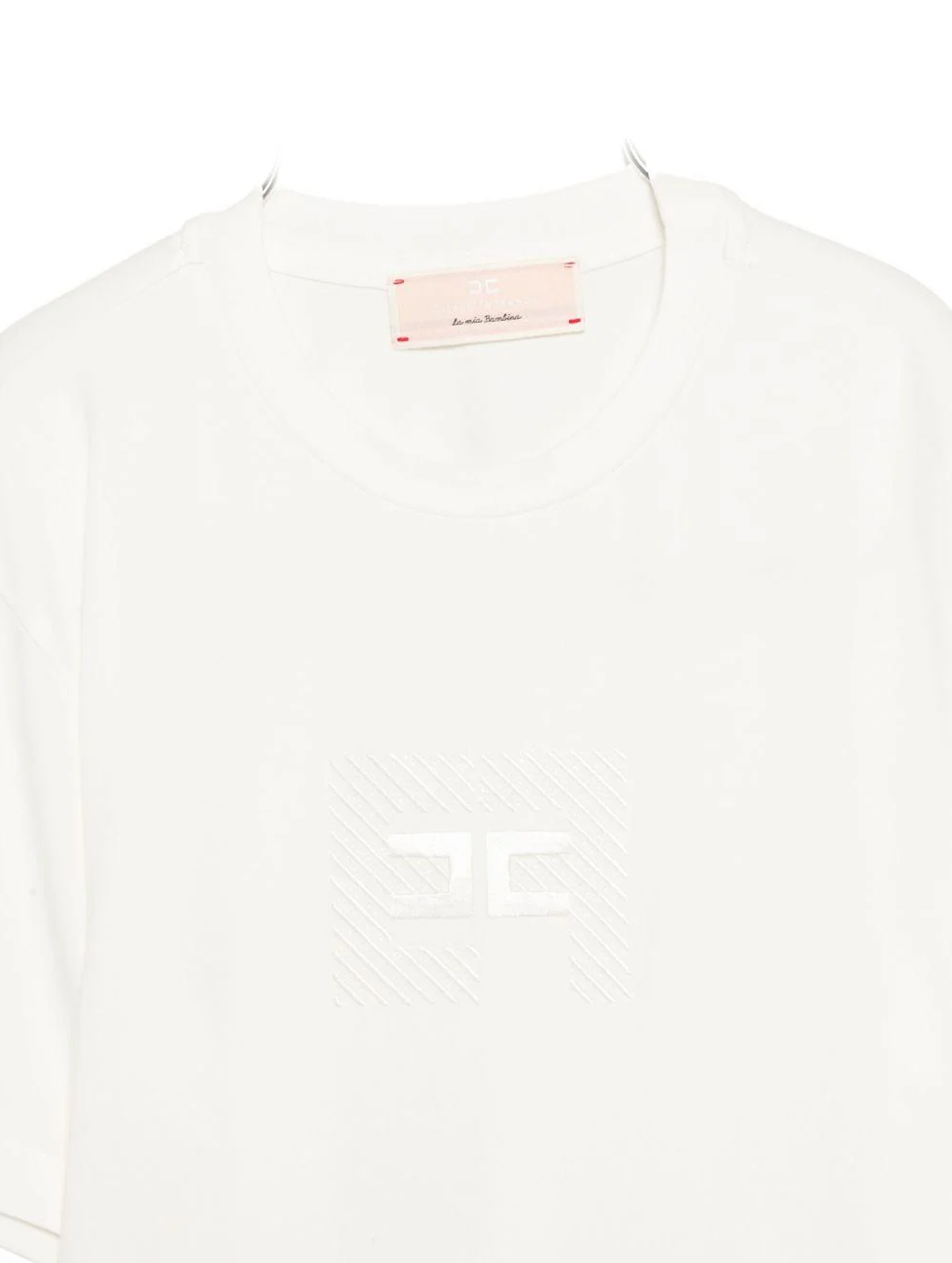 T-shirt a maniche corte, con scollo rotondo, a tinta unita, con logo ricamato in tinta sul fronte e strass applicati. Per un look trendy e chic. ELISABETTA FRANCHI