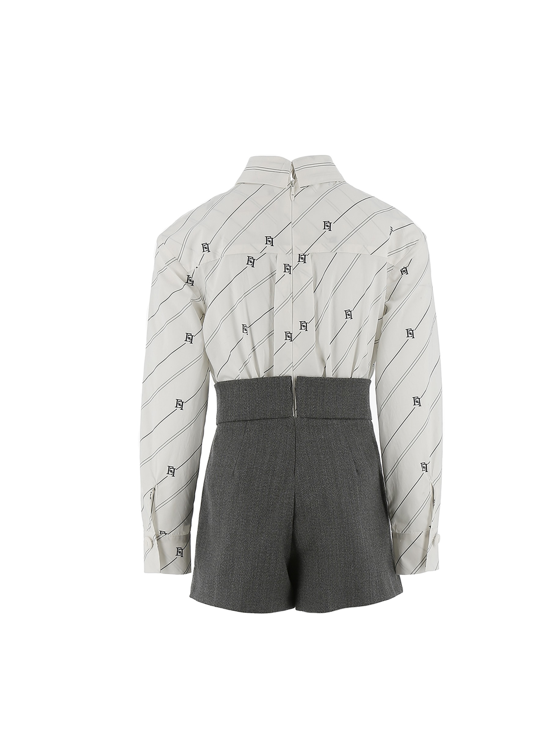 Tuta da bambina, corta, composta da camicia a righe con monogramma del logo all over, colletto a punta, cravatta con piccolo logo applicato sul fronte, e shorts a tinta unita. Chiusura con zip invisibile sul retro. Per un look sofisticato e chic. ELISABETTA FRANCHI