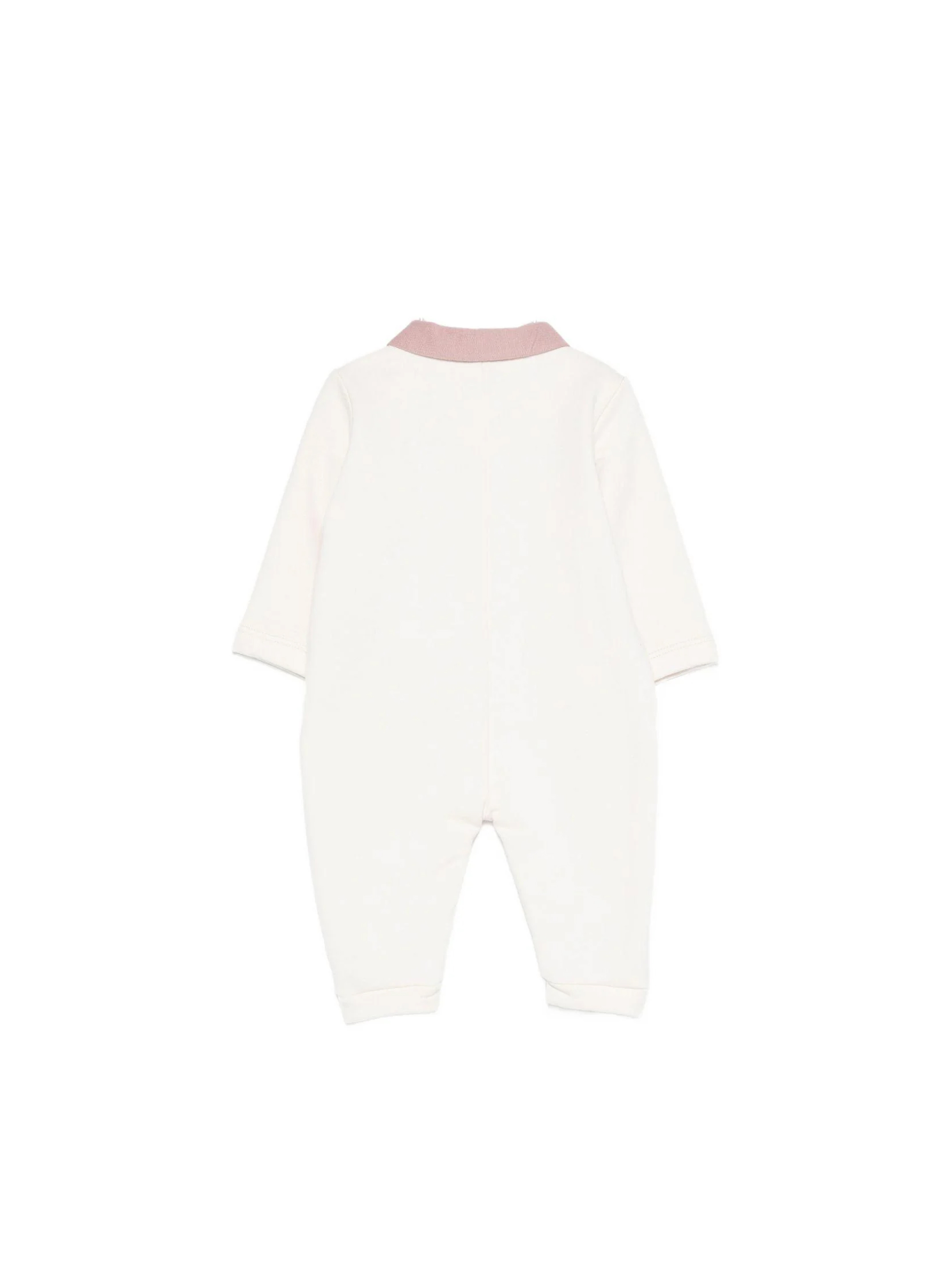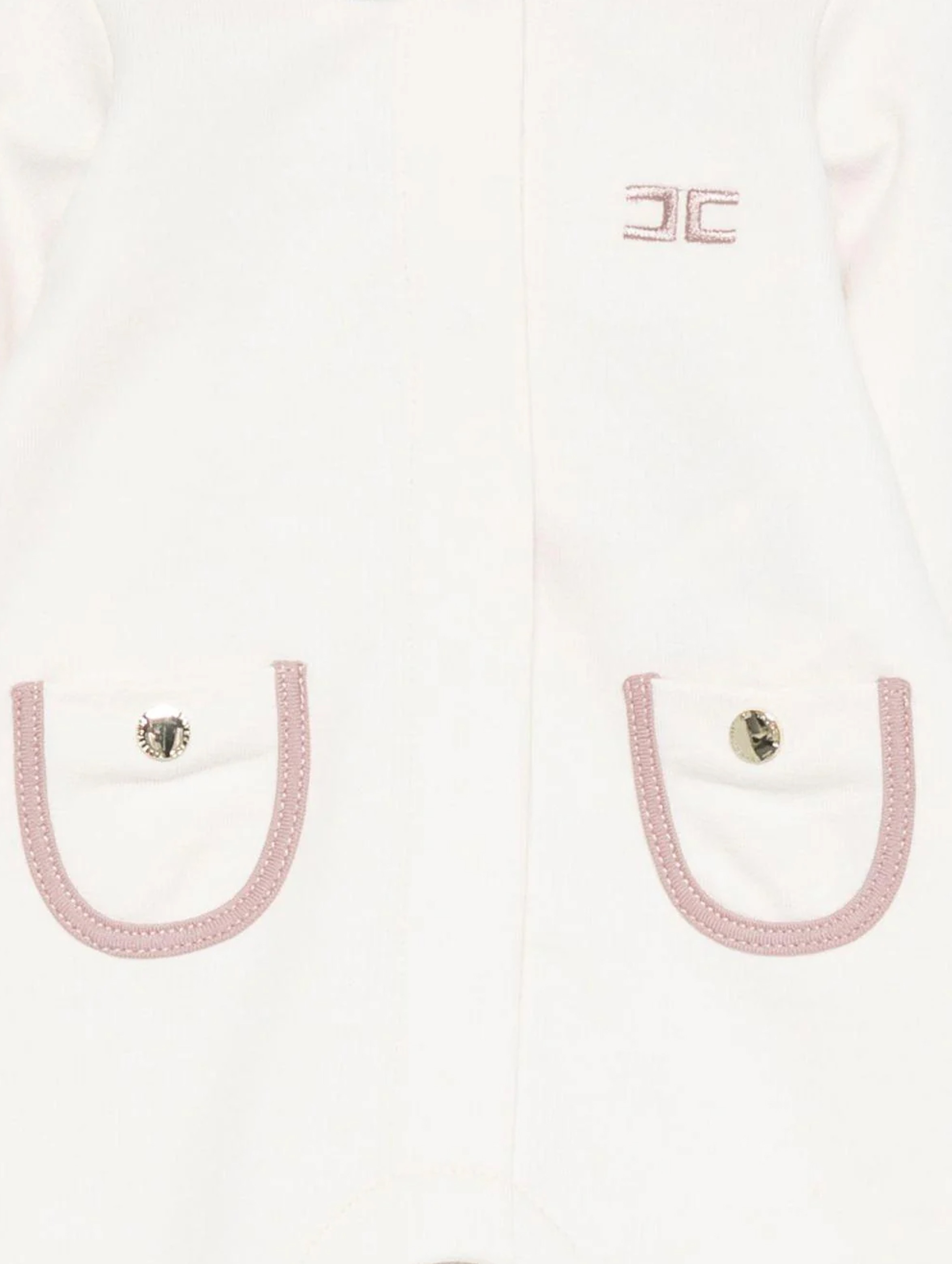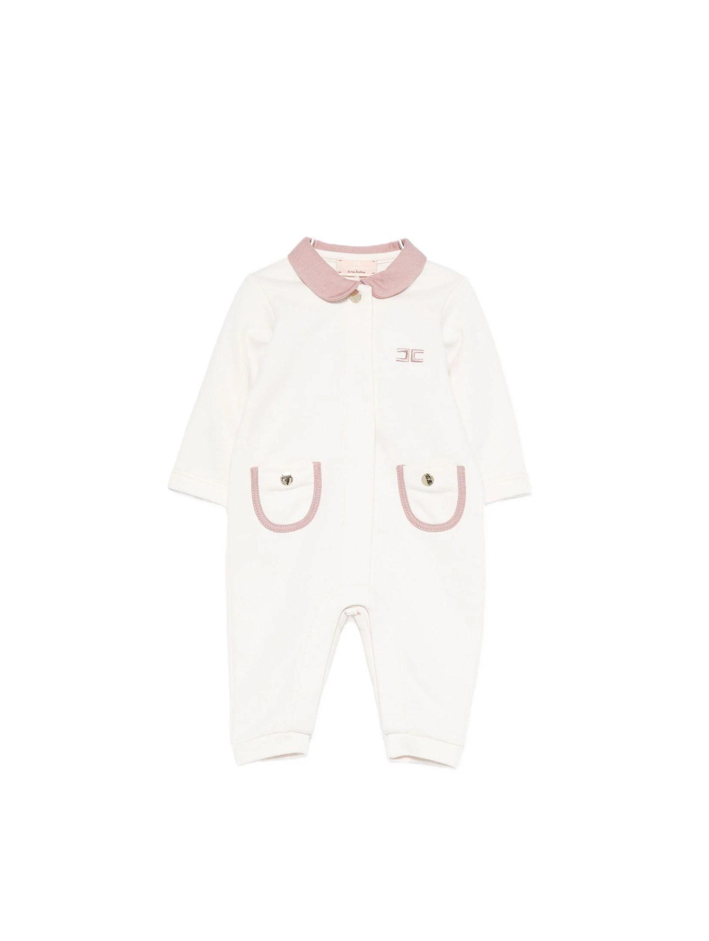 Tutina in felpa, con maniche lunghe, a tinta unita, con colletto rotondo a contrasto di colore, chiusura con bottoncini nascosti sul davanti, con tasche applicate con bottone decorativo e profili a contrasto e logo ricamato a contrasto sul petto. Per un look dolce e trendy. ELISABETTA FRANCHI