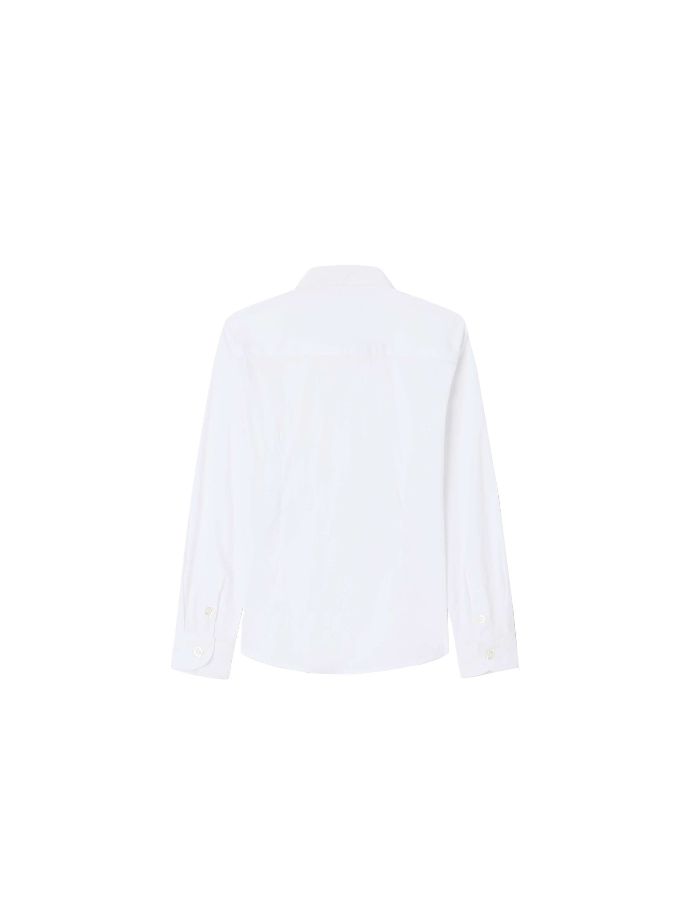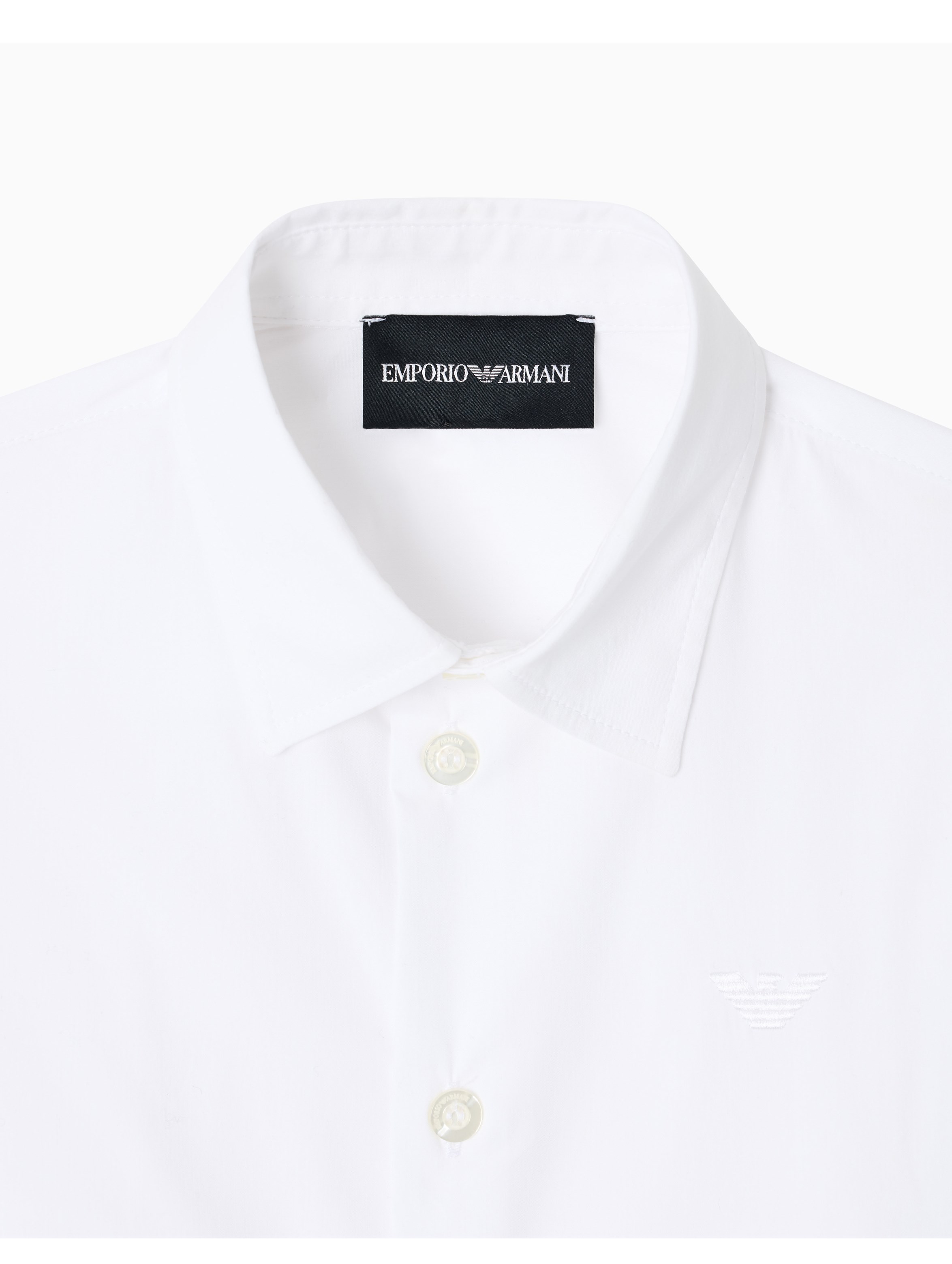 Camicia a maniche lunghe realizzata in popeline di misto cotone stretch, a tinta unita, con colletto classico, chiusura con bottoni frontali e mini logo aquila ricamato tono su tono sul petto. Per un look elegante e raffinato. EMPORIO ARMANI