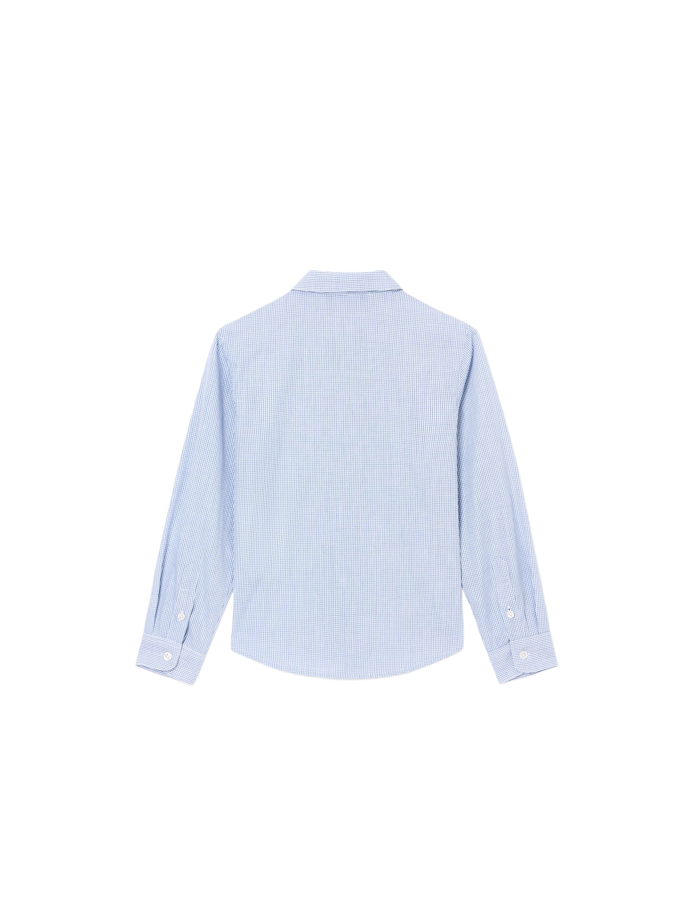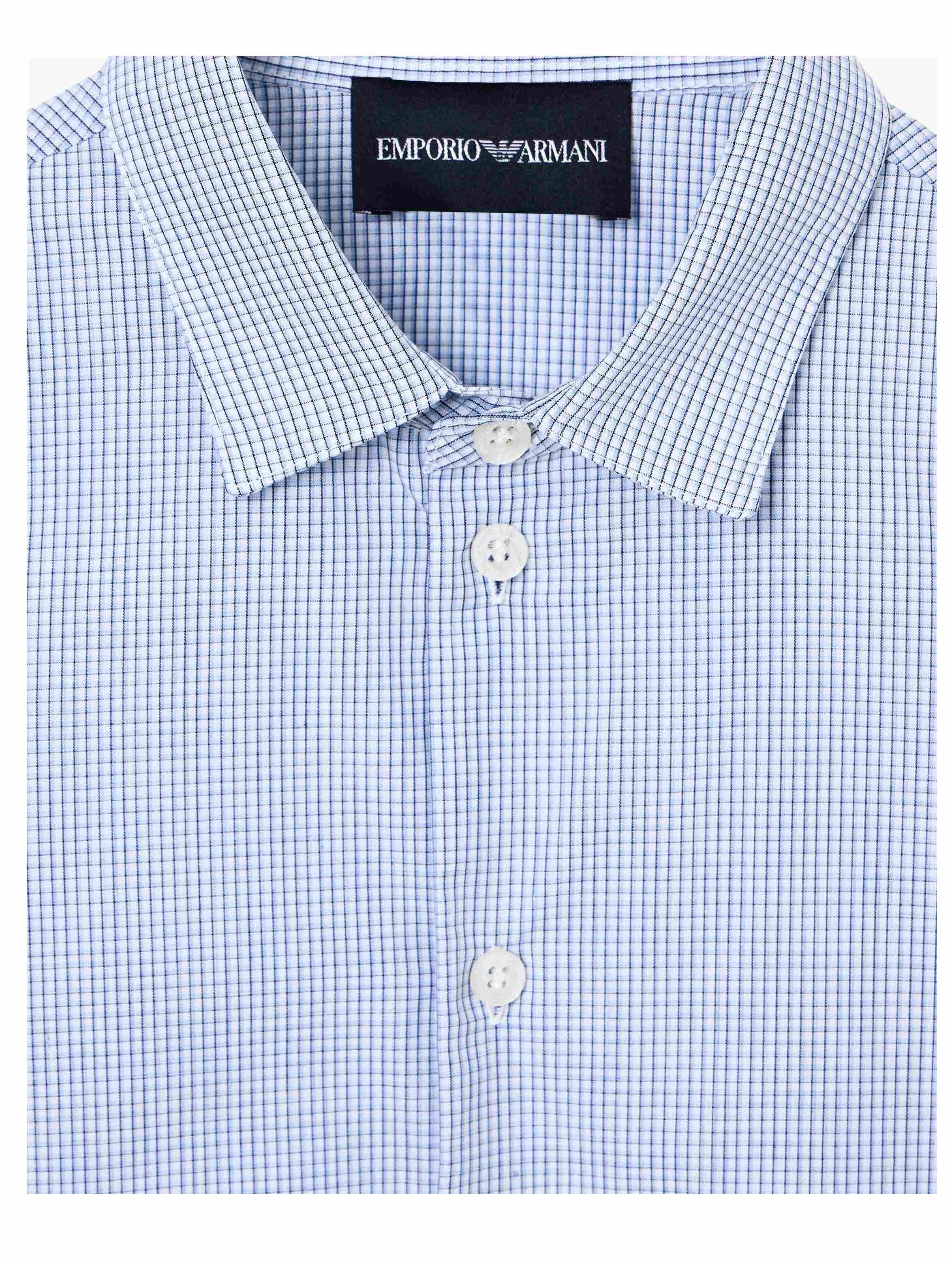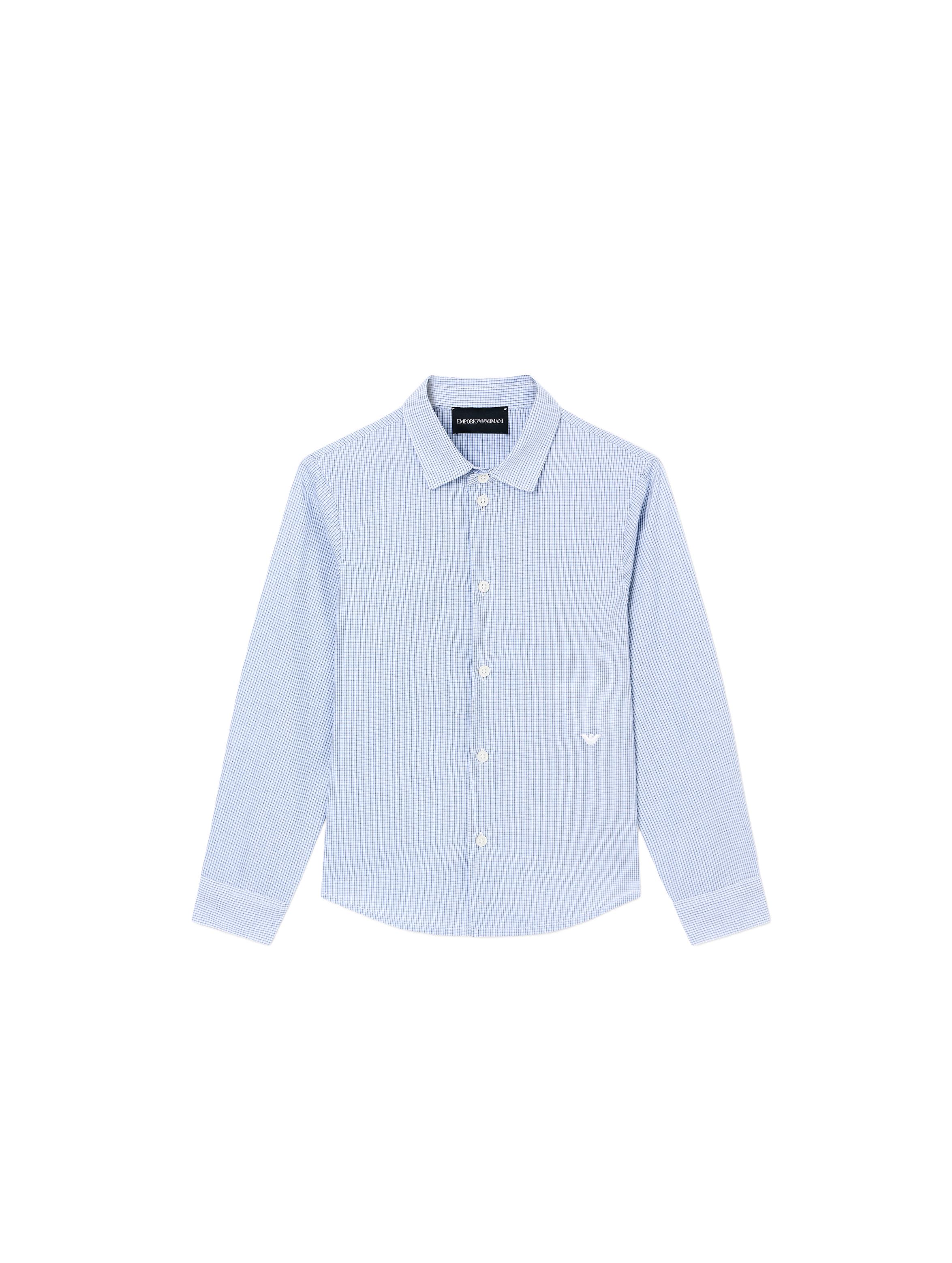 Camicia a maniche lunghe, realizzata in pregiato cotone, con stampa a mini quadretti, colletto classico, apertura con bottoni centrali e iconica aquila ricamata a contrasto sul fianco. Per un look elegante e raffinato. EMPORIO ARMANI