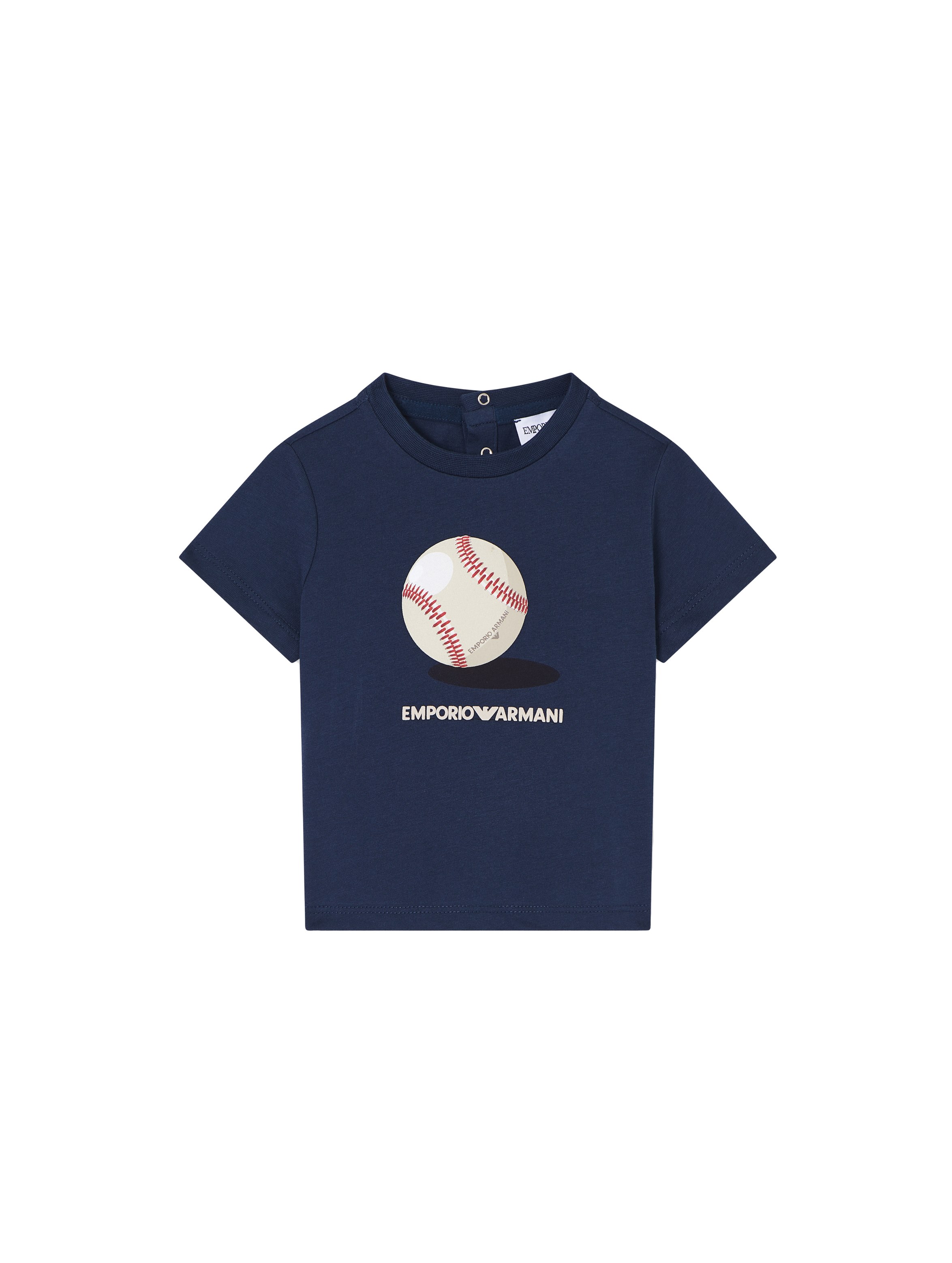 T-shirt a maniche corte, con scollo rotondo, a tinta unita, con apertura con bottoncini sul retro e maxi stampa grafica di palla da baseball con logo a contrasto sul davanti. Per un look casual e trendy. EMPORIO ARMANI
