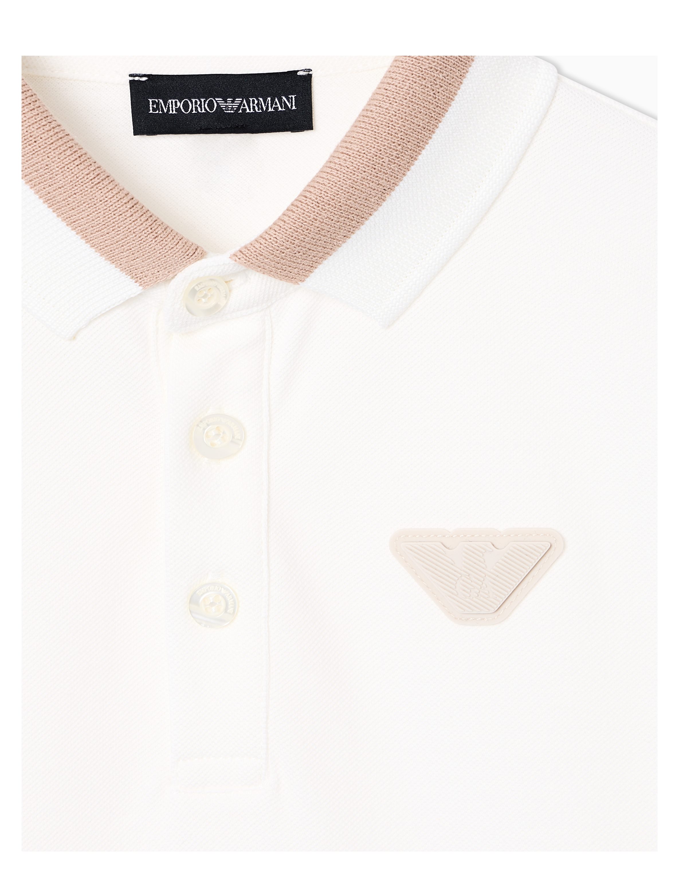 Polo realizzata in jersey piquet stretch, a maniche corte, a tinta unita, con colletto classico e tre bottoni, dettagli in contrasto di colore al collo e al profilo delle maniche e patch con iconica aquila sul petto. Per un look casual e trendy. EMPORIO ARMANI