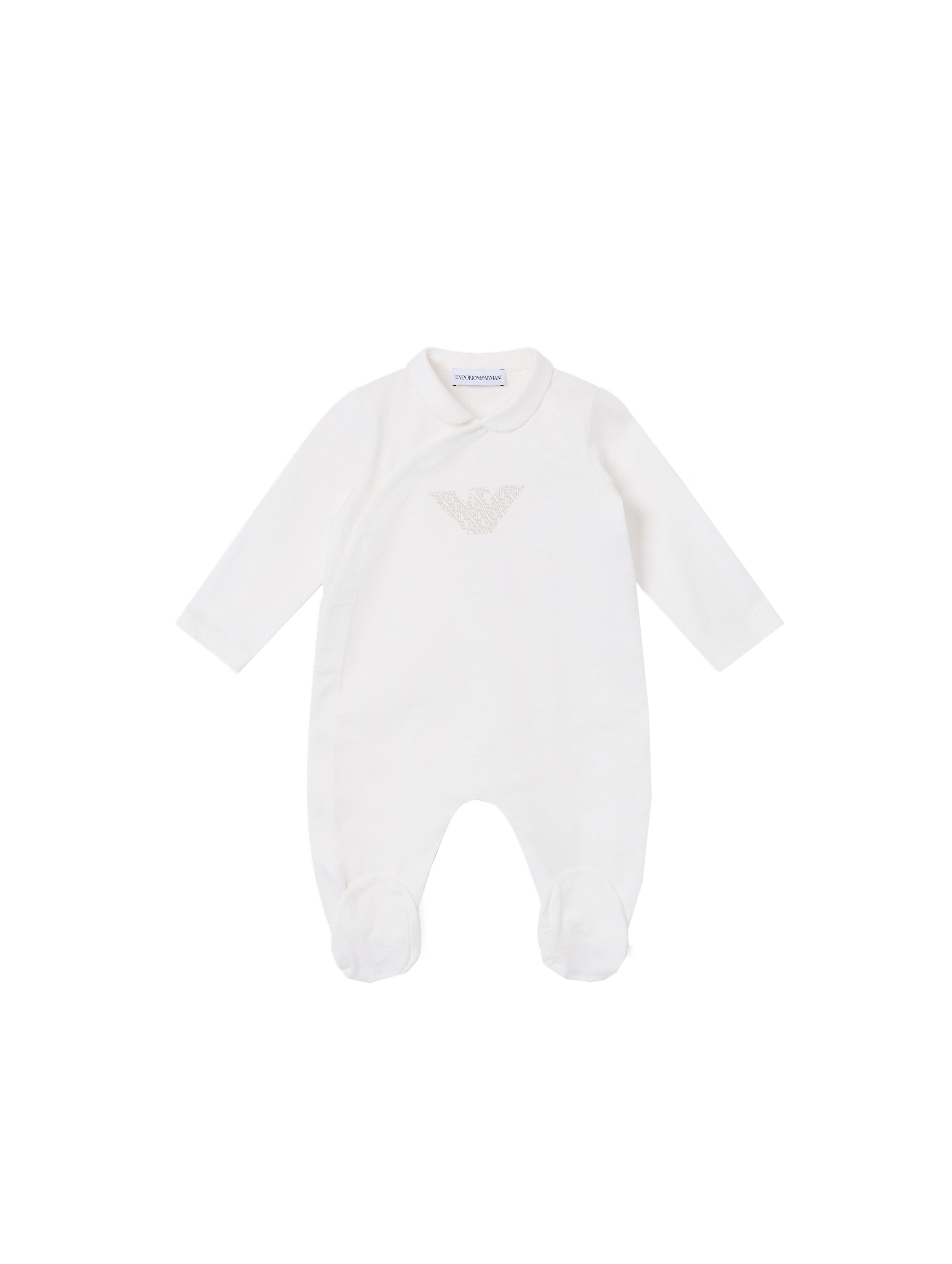 Tutina realizzata in morbido jersey di cotone, con maniche lunghe, piedini, scollo e colletto rotondo, chiusura con bottoncini automatici e stampa dell'iconica aquila a contrasto sul davanti. Per un look essenziale e raffinato. EMPORIO ARMANI