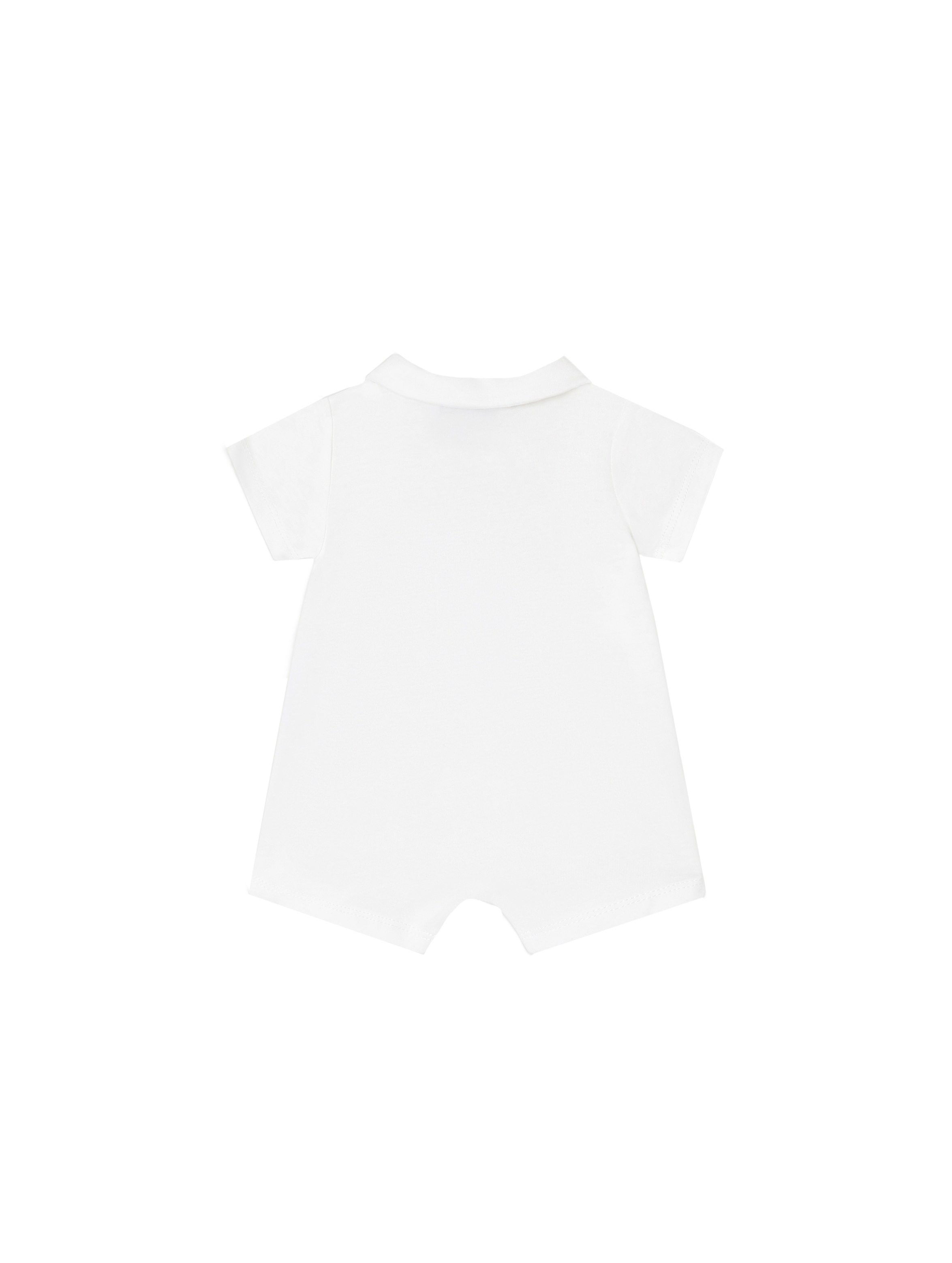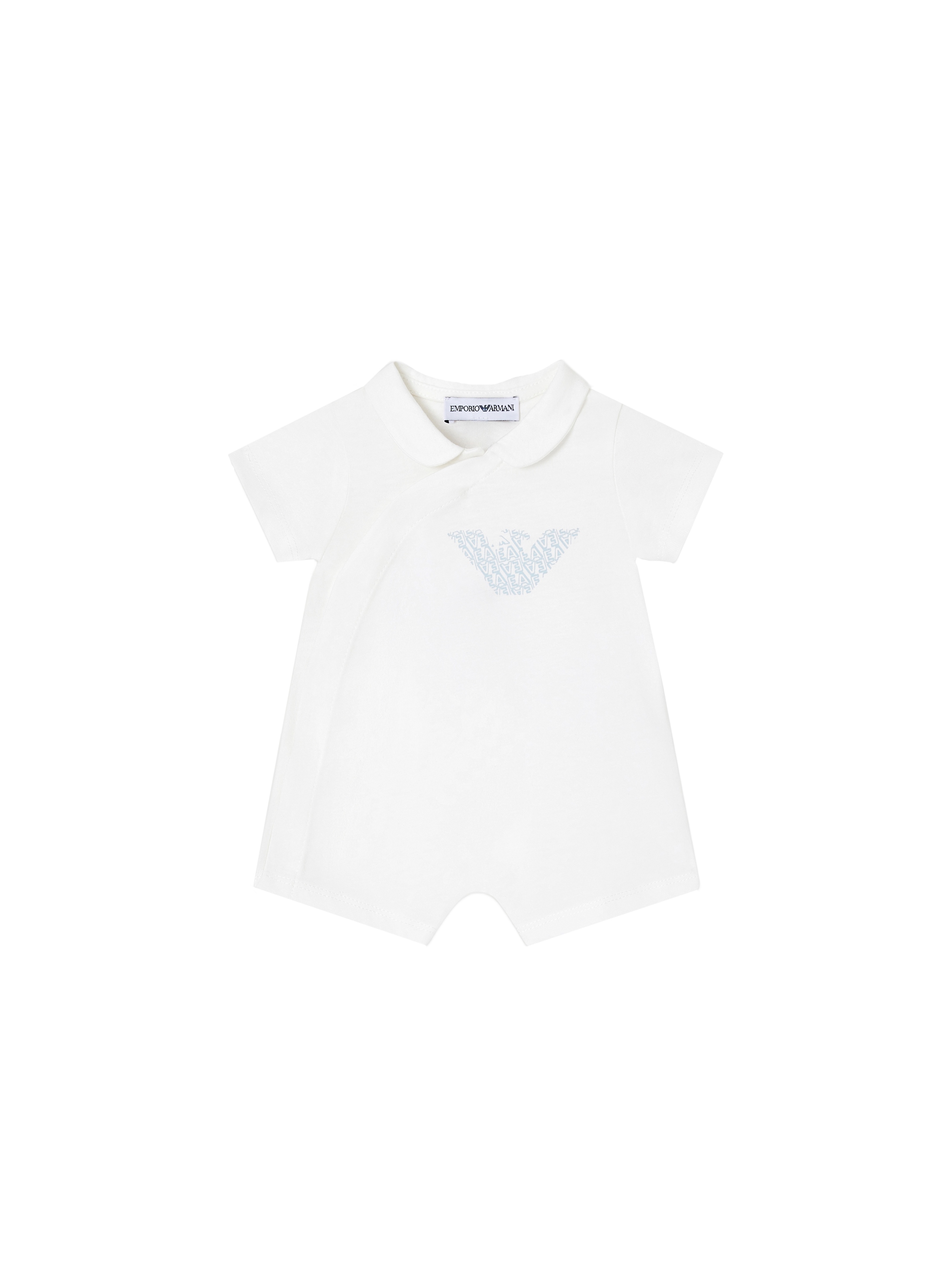 Pagliaccetto in morbido e confortevole jersey di cotone, con maniche corte, scollo e colletto rotondo, apertura con bottoncini automatici e logo aquila stampato a contrasto sul petto. Per look essenziali e raffinati. EMPORIO ARMANI
