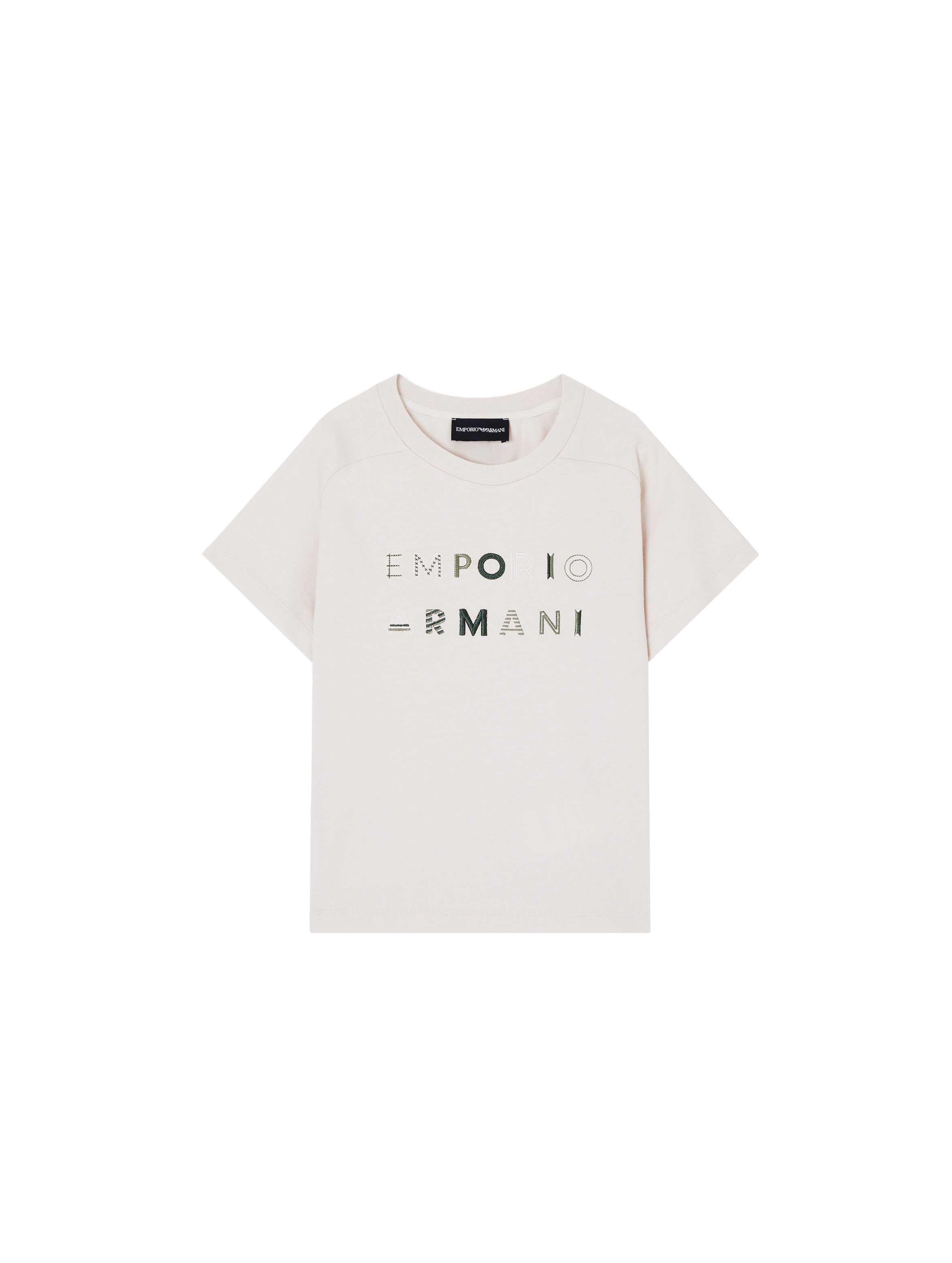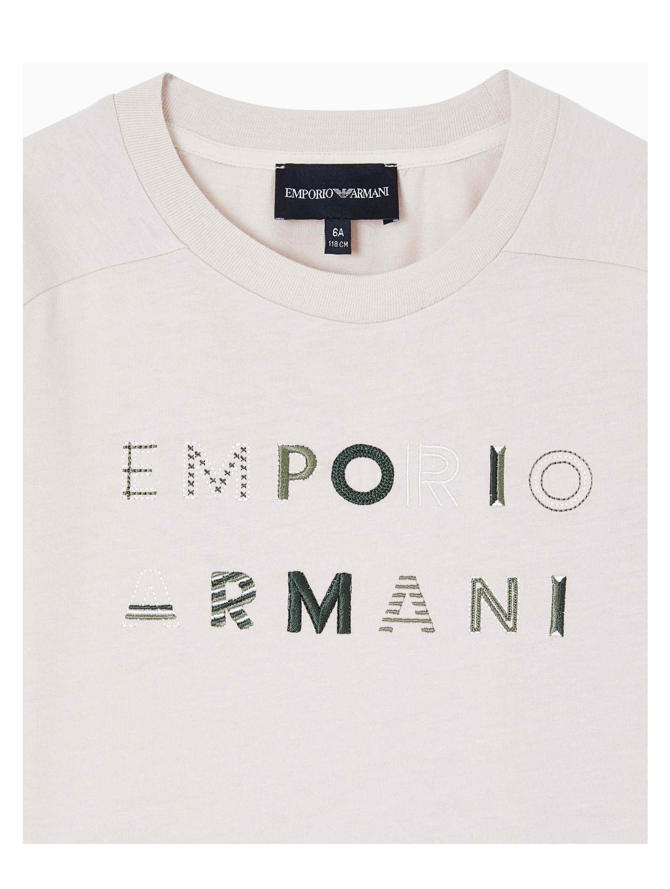 T-shirt a maniche corte, con scollo rotondo, a tinta unita e con maxi logo lettering ricamato in diversi stili a contrasto sul davanti. Per un look trendy e casual. EMPORIO ARMANI