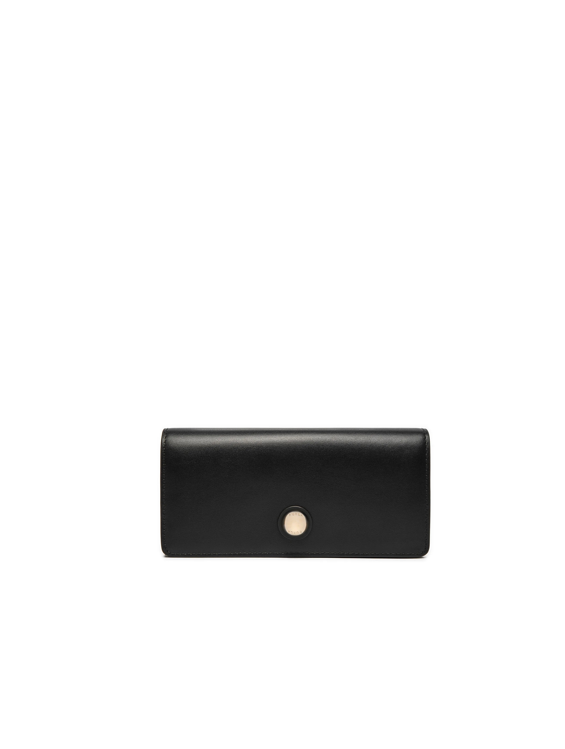 Portafoglio grande in morbida pelle liscia, dal design a libro, con tasca con zip sul retro, scomparto interno per banconote, numerosi scomparti per carte di credito, con chiusura con patta e bottone a pressione e dettaglio rotondo in galvanica logato. Trendy e funzionale. FURLA
