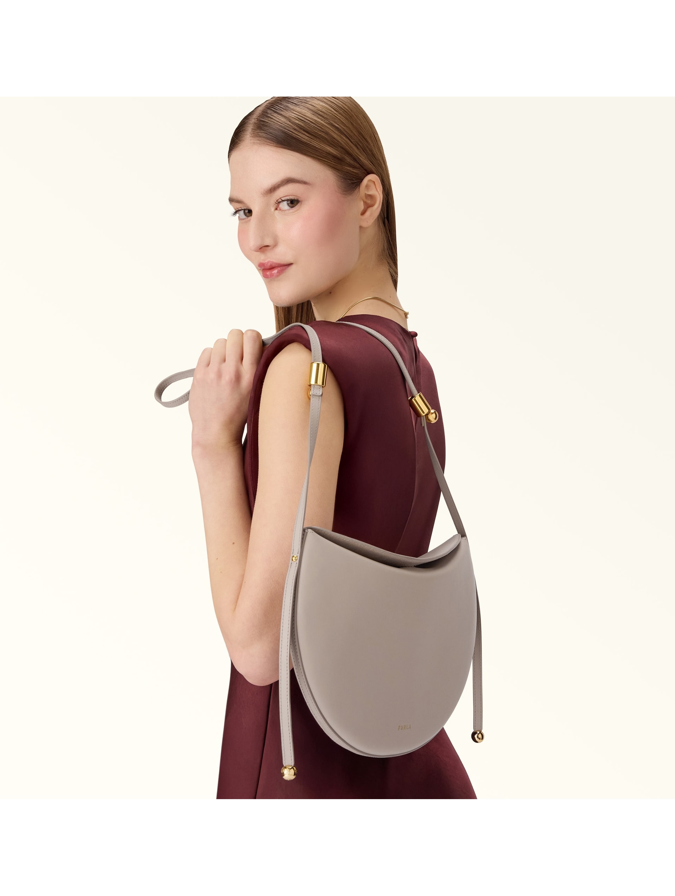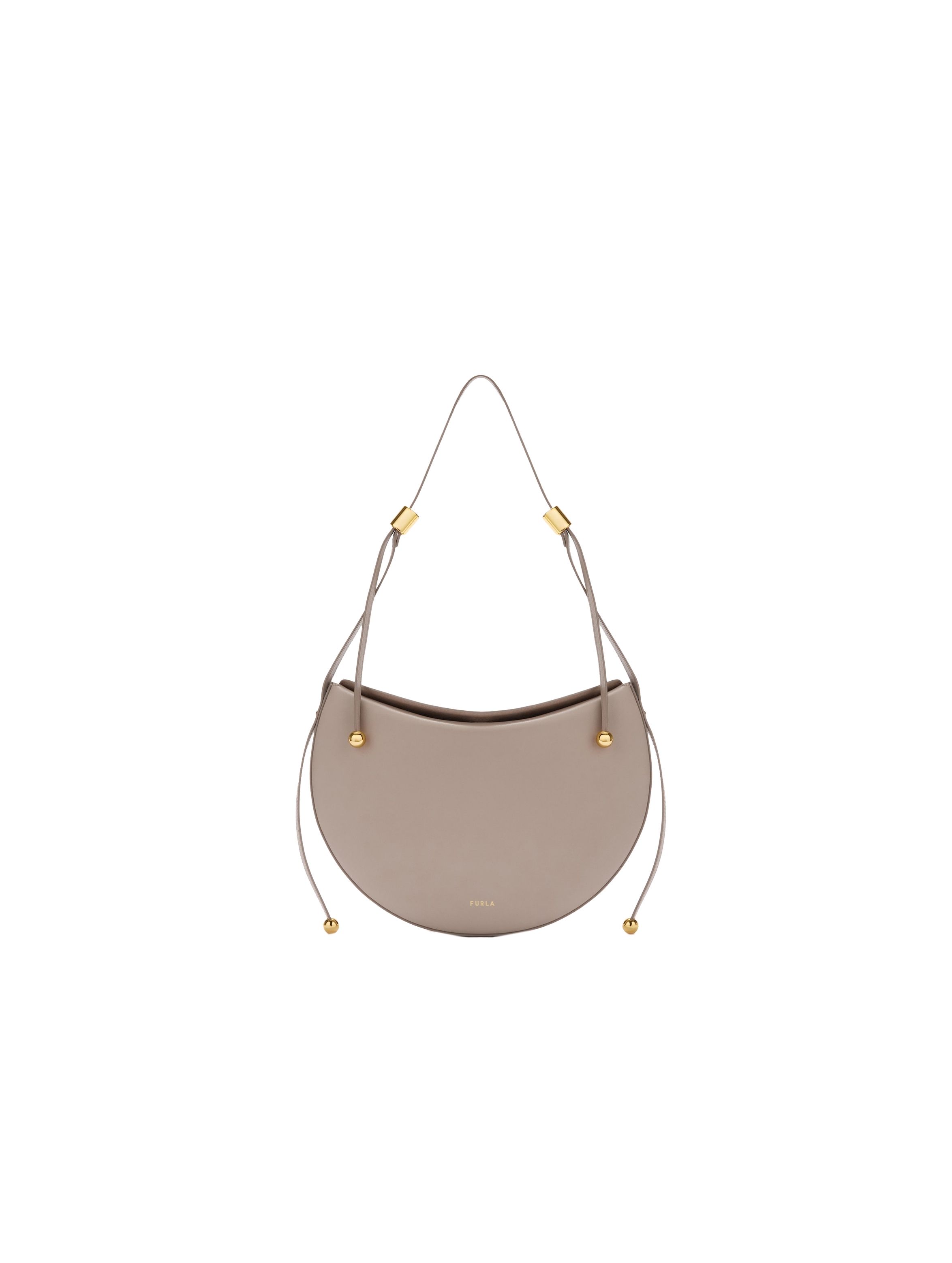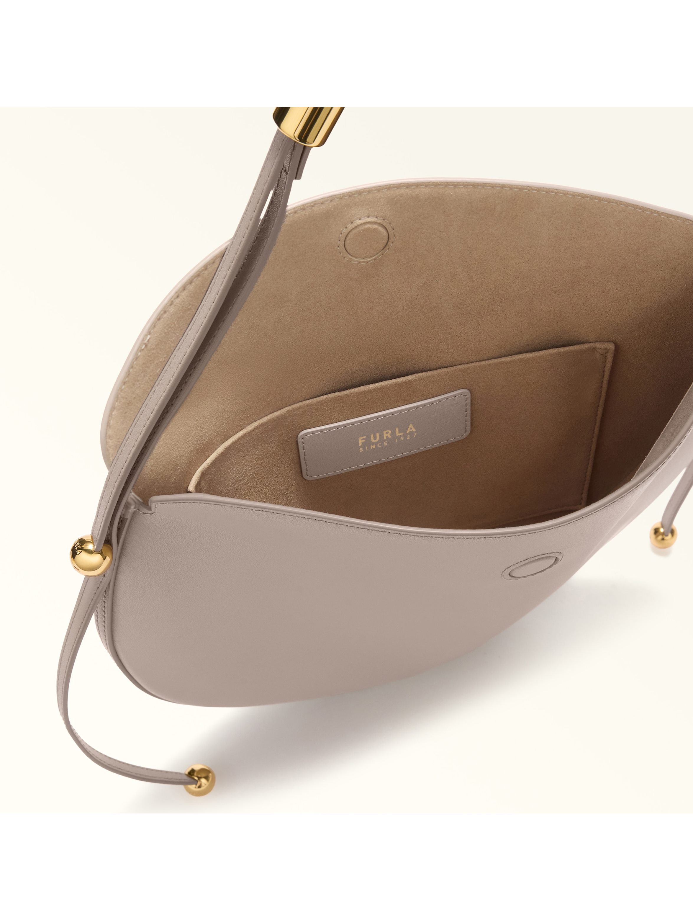 Borsa a spalla dalla tipica forma a sella, realizzata in camoscio, con tracolla fissa e regolabile, tasca interna aperta a parete, chiusura con bottone a calamita e hardware cilindrici con elementi a Sfera che aggiungono un tocco elegante e distintivo al modello. FURLA