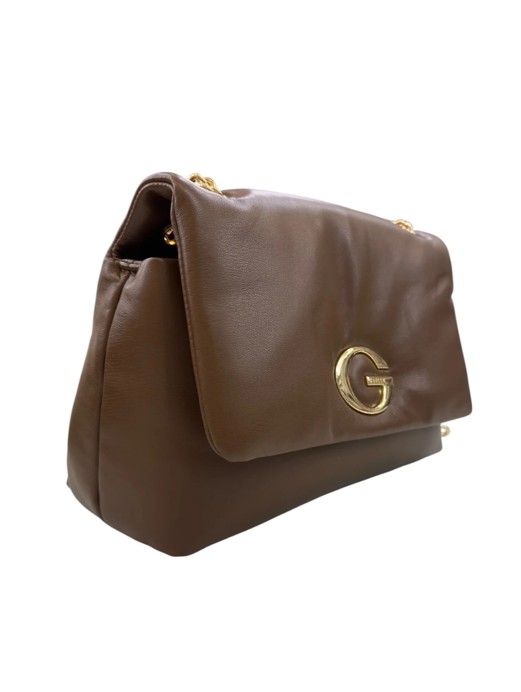 Borsa a spalla puffer in tessuto ecopelle, con chiusura con patta e bottone magnetico, tracolla con doppia catena e logo G in galvanica oro sul davanti. Per un look elegante e raffinato. GAELLE PARIS